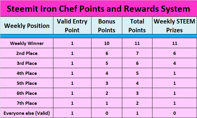 Each valid entry will get 1 point automatically which will be counted for on the Steemit Iron Chef League!