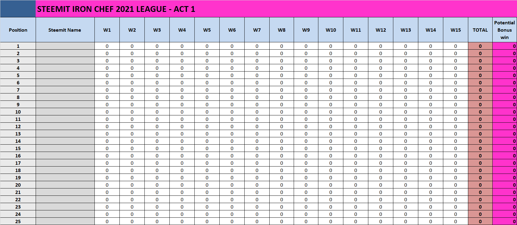 The total points earned each week by the contestants(see table above) will be sent on the below table to make the rankings of the Steemit Iron Chef League.