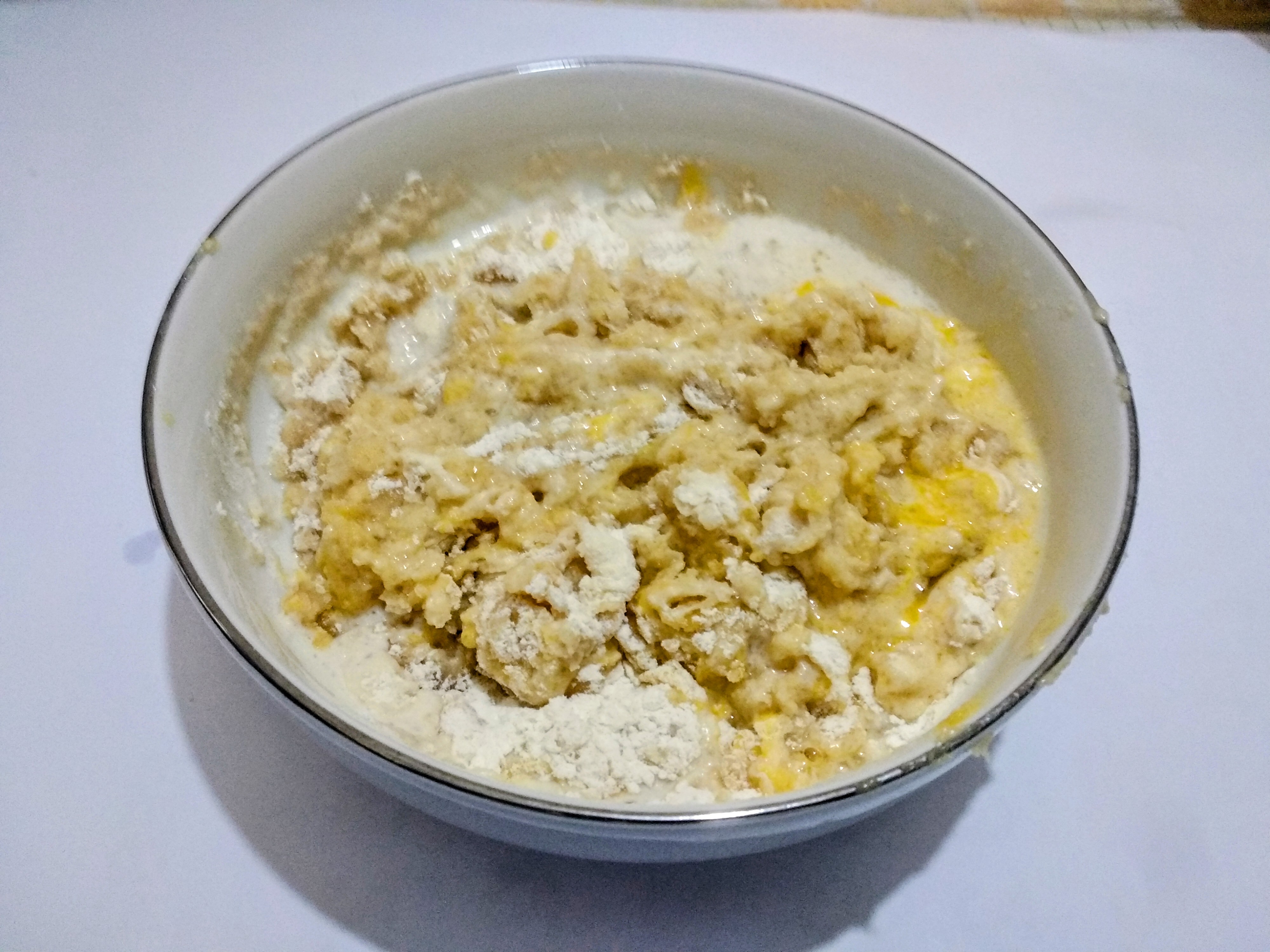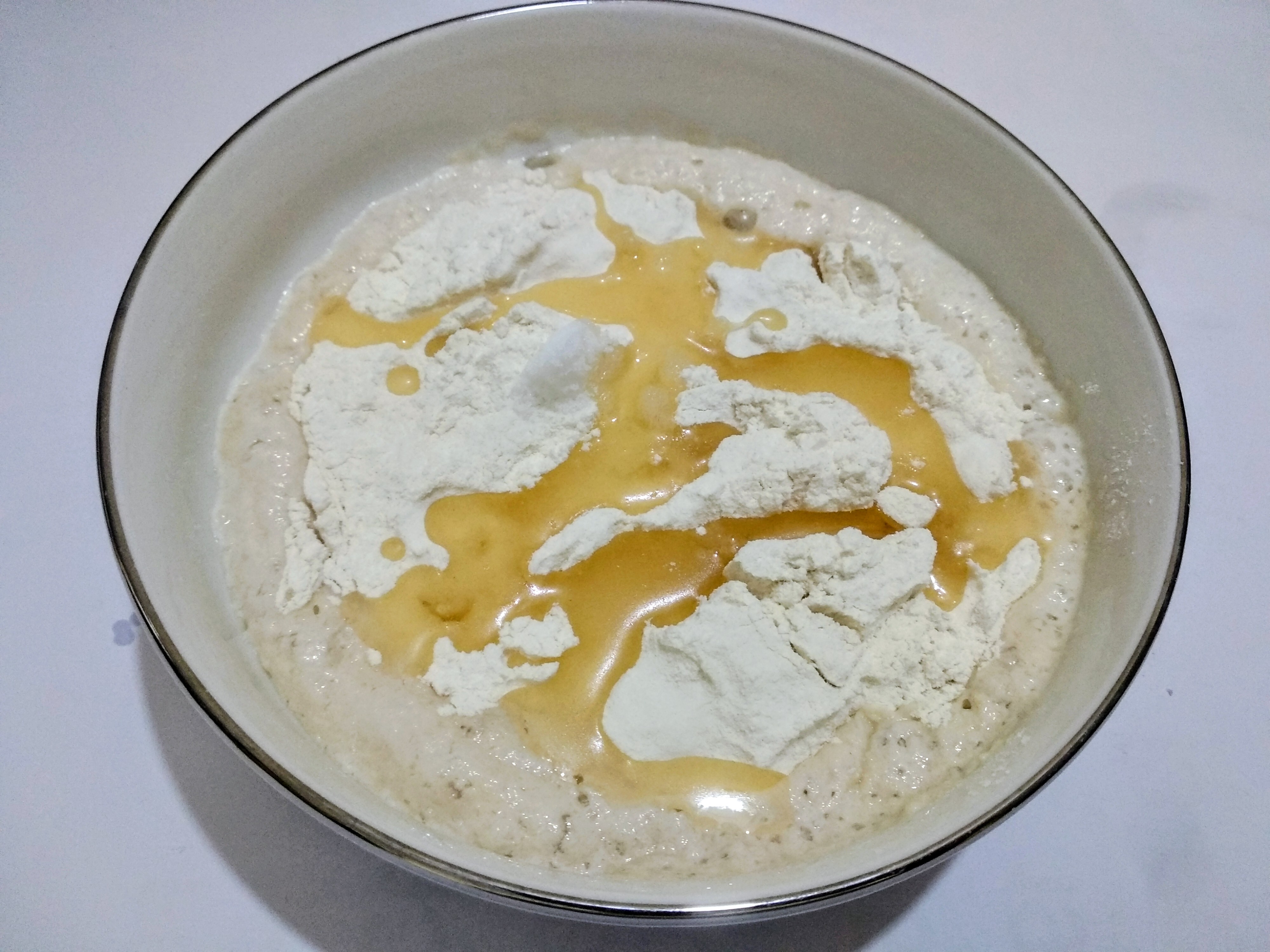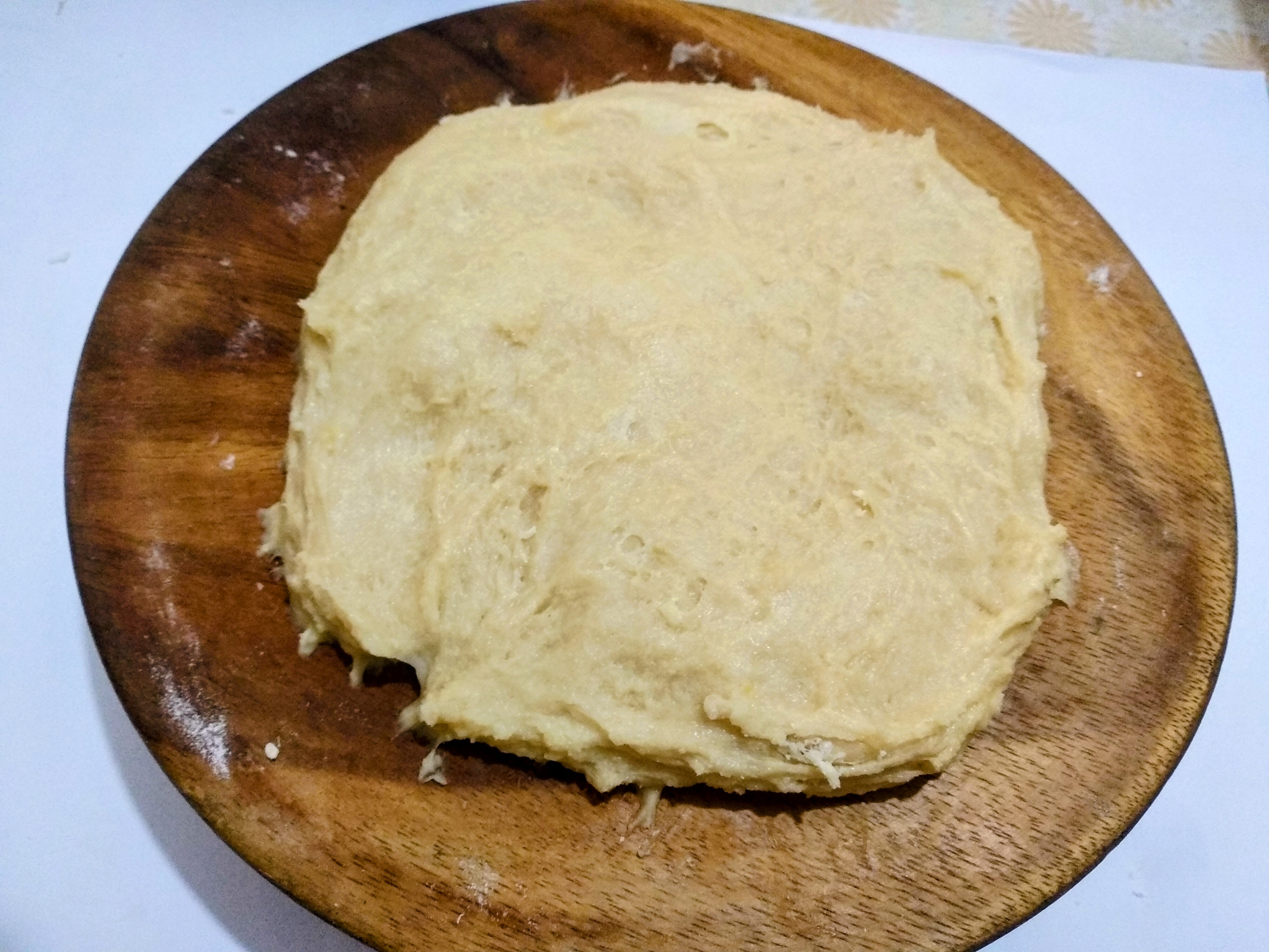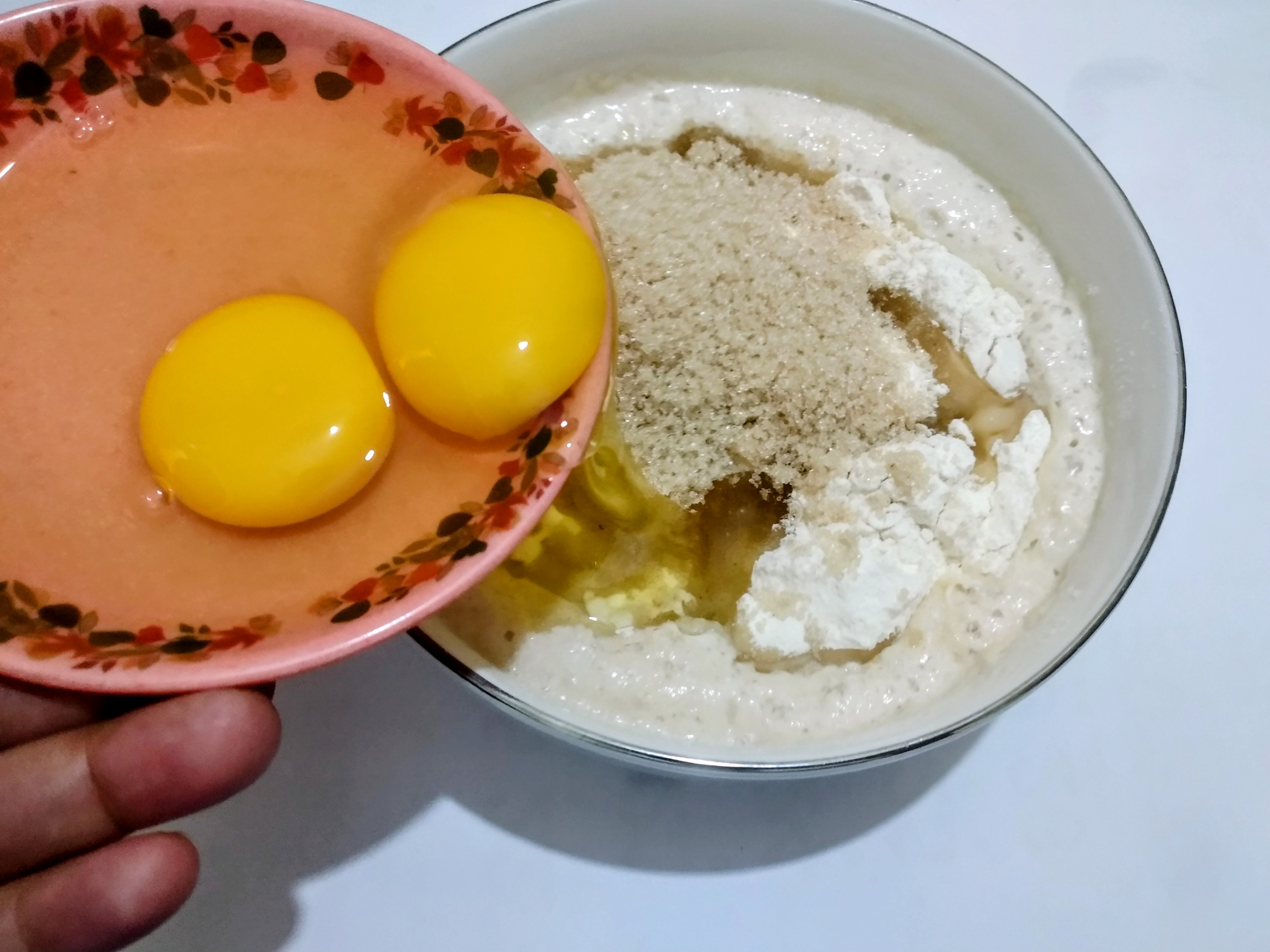 Once the yeast is foamy, I add 1 cup of flour, the remaining sugar, 2 eggs, and 1/2 cup of melted butter. After adding all the ingredients, I patiently knead the dough by hand. The breads will be soft if the dough is kneaded properly.