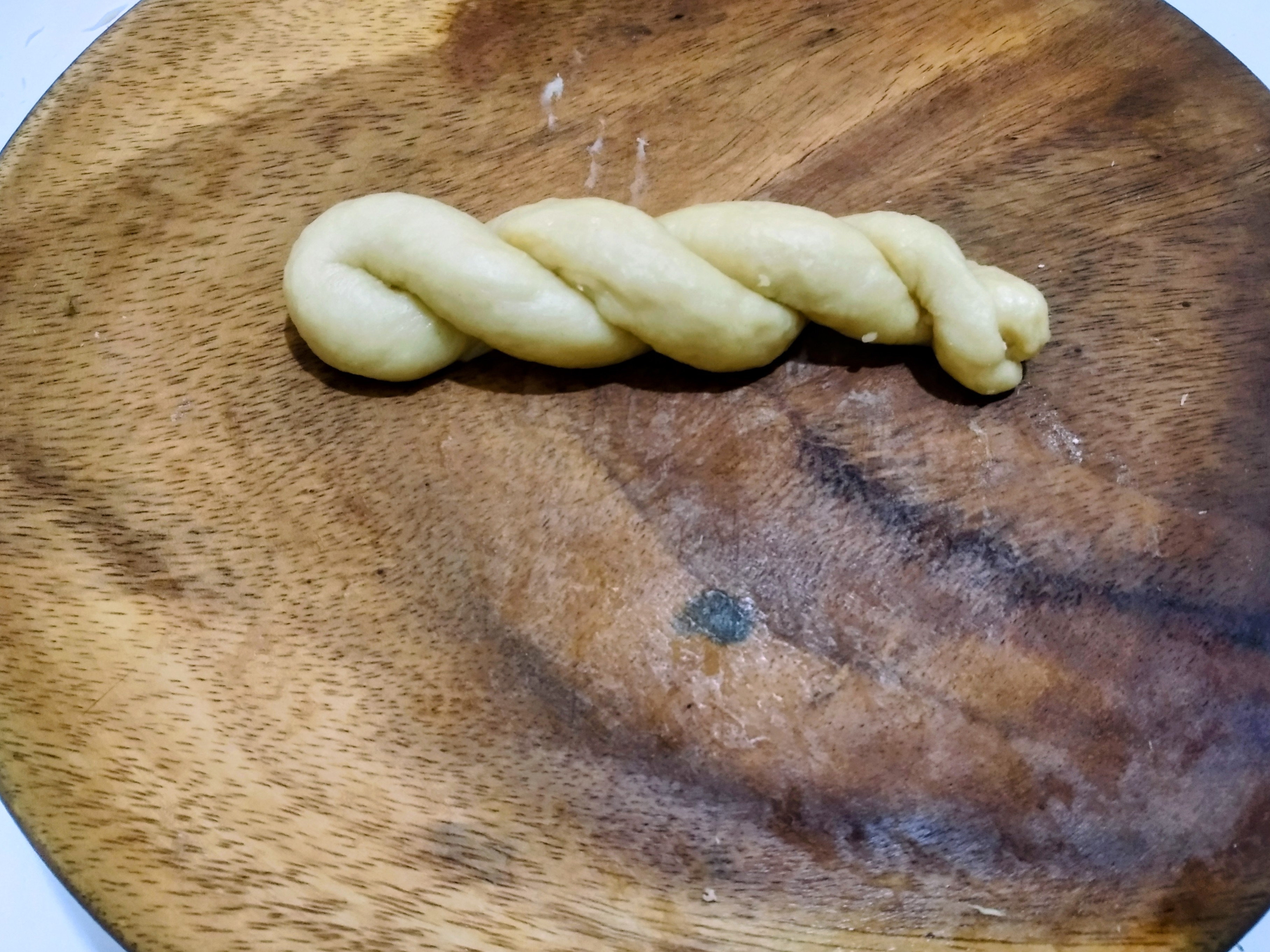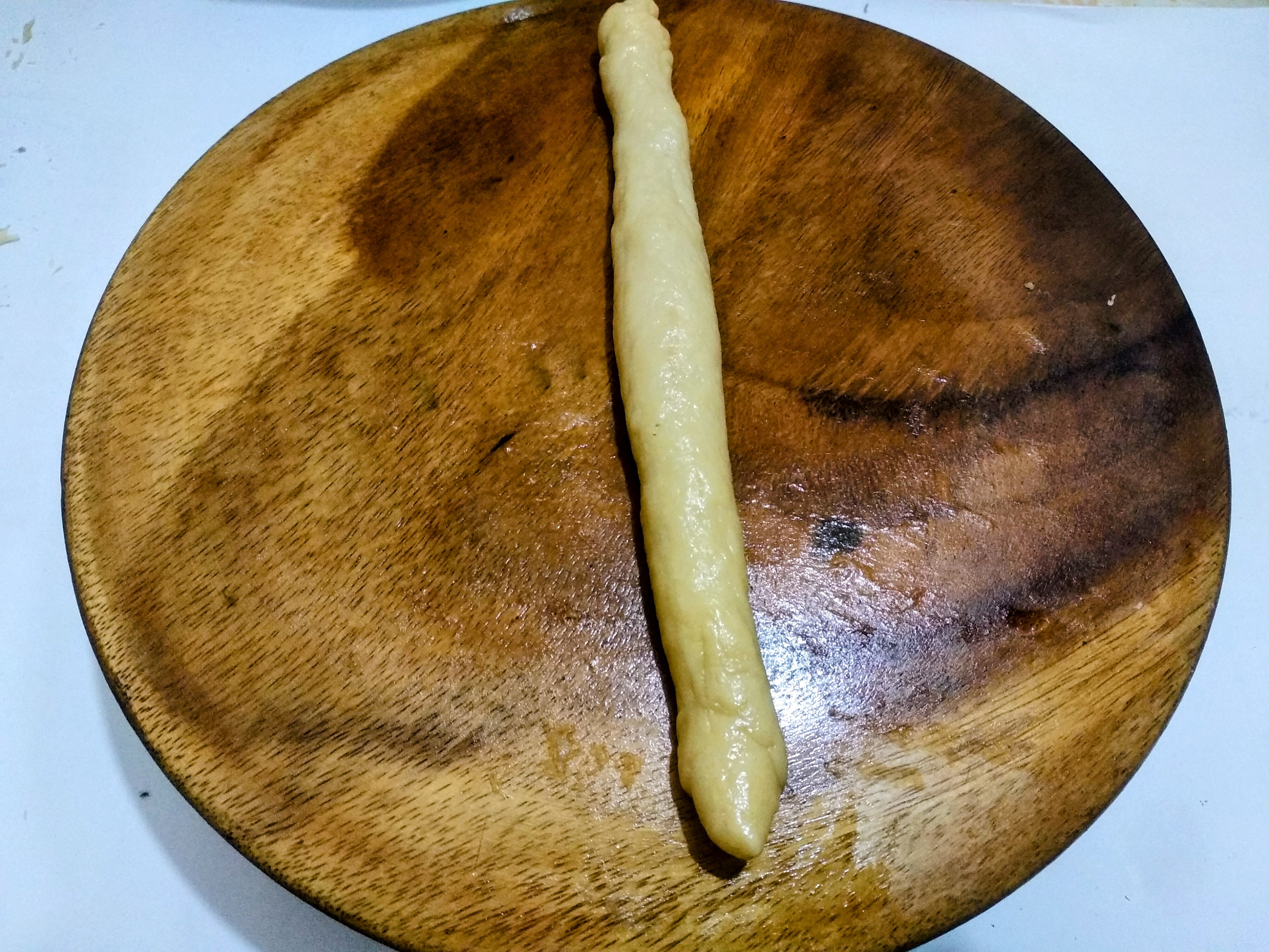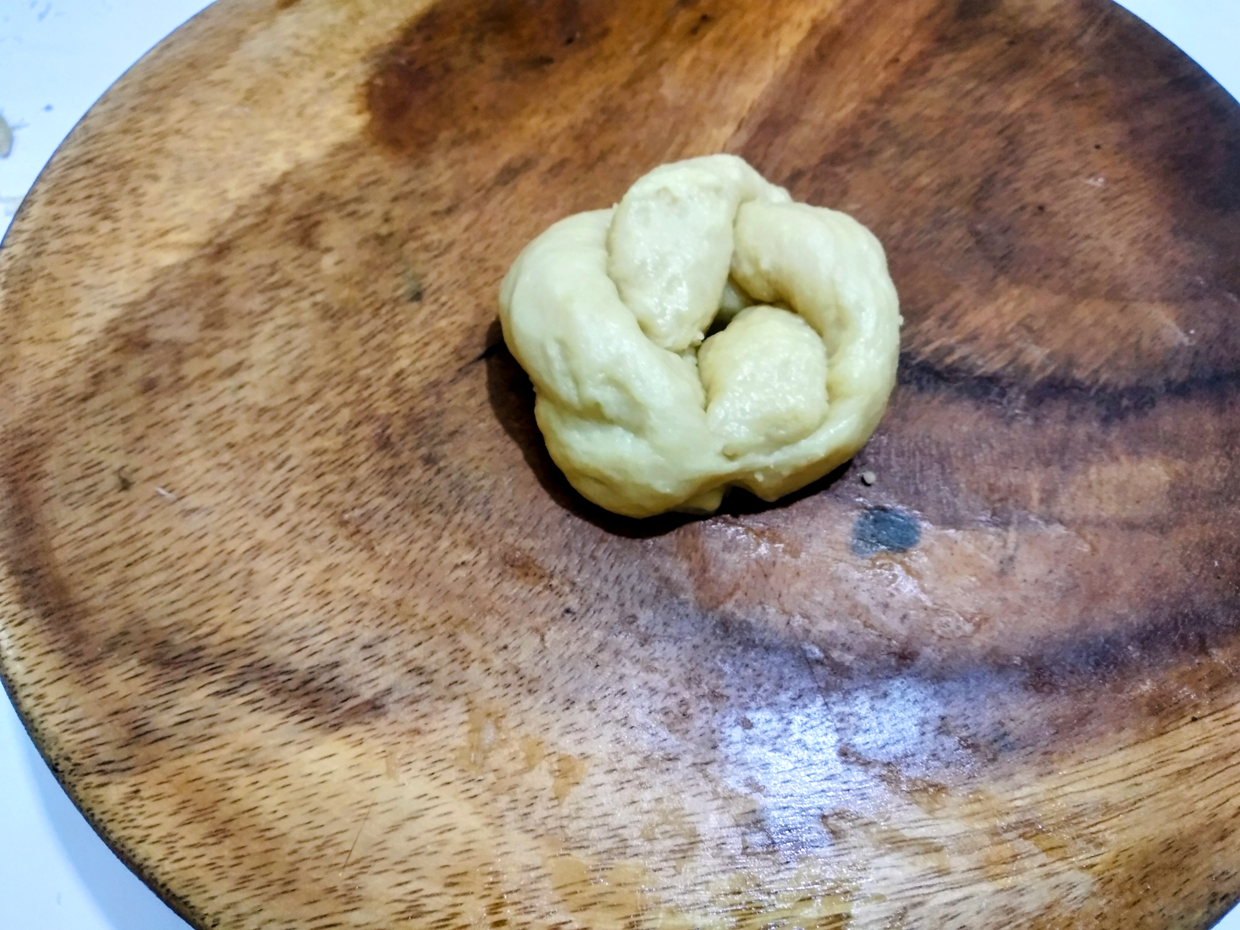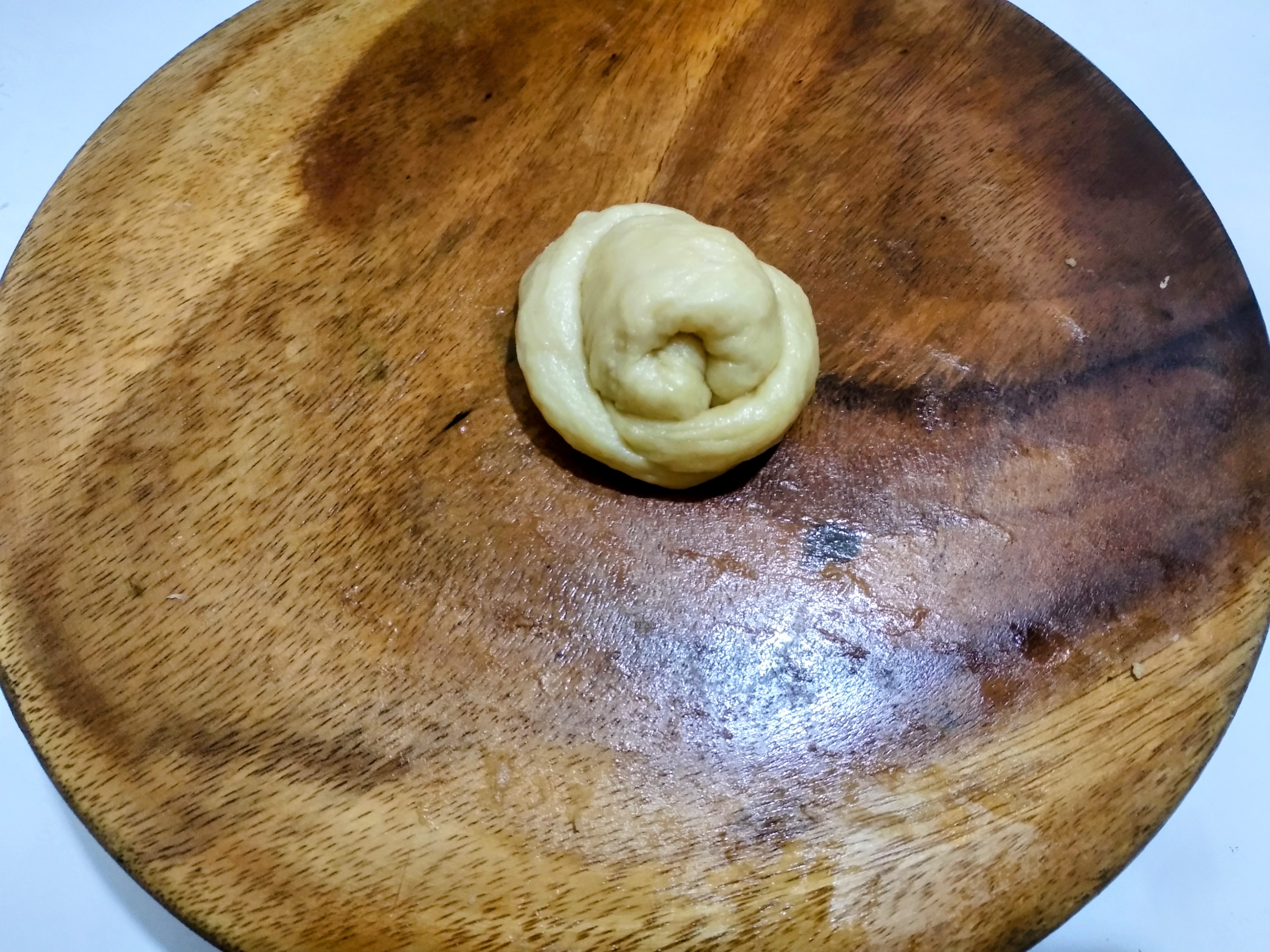 After three hours, when the yeast has risen and doubled in size, I will take it out and roll it into a ball and knead it with flour. To make the loaves soft, I knead the dough well over time. While kneading the dough , I stretch it out and then roll it up again in the bowl. This will release the air inside it. I have made several shapes this way.