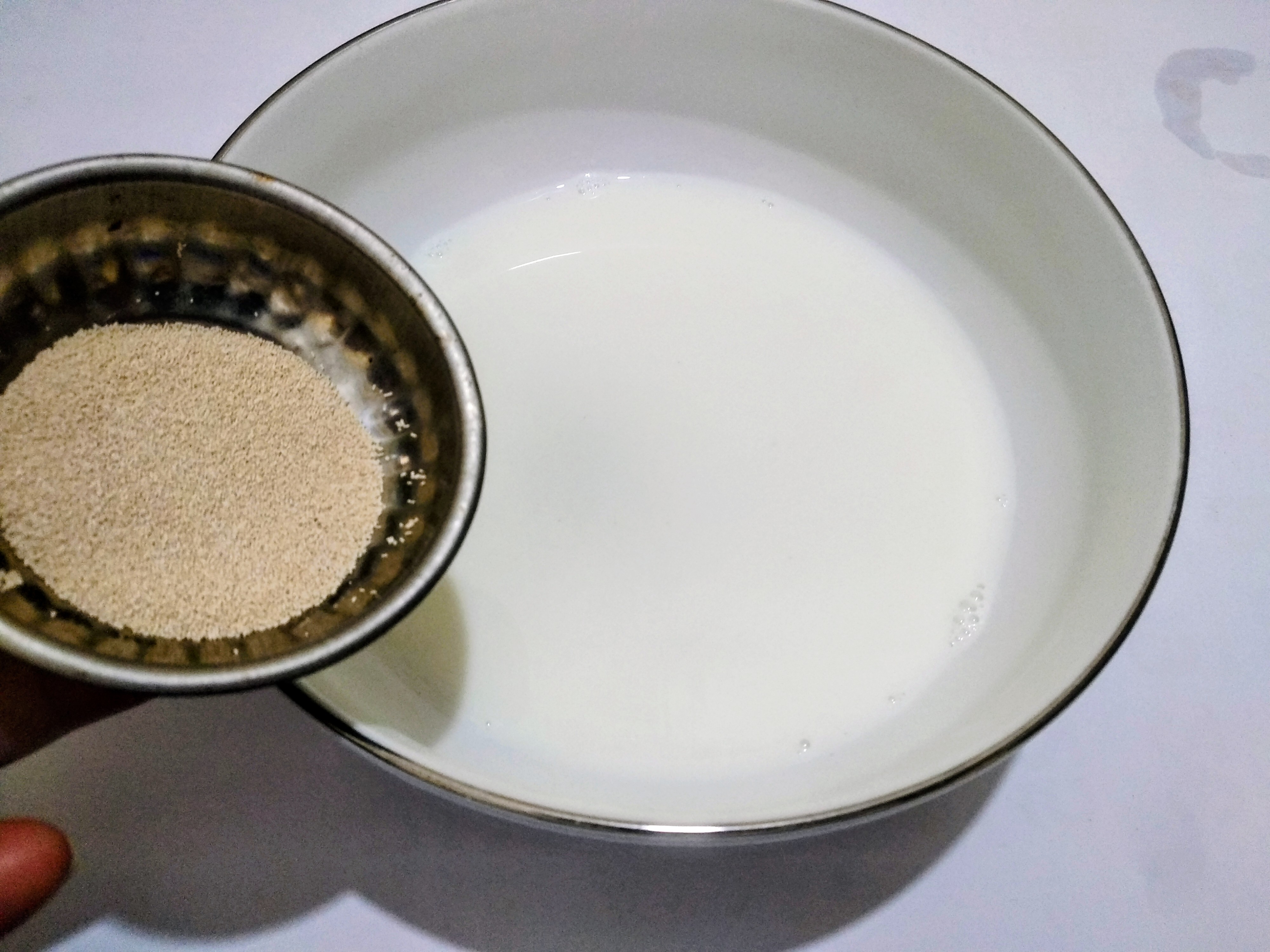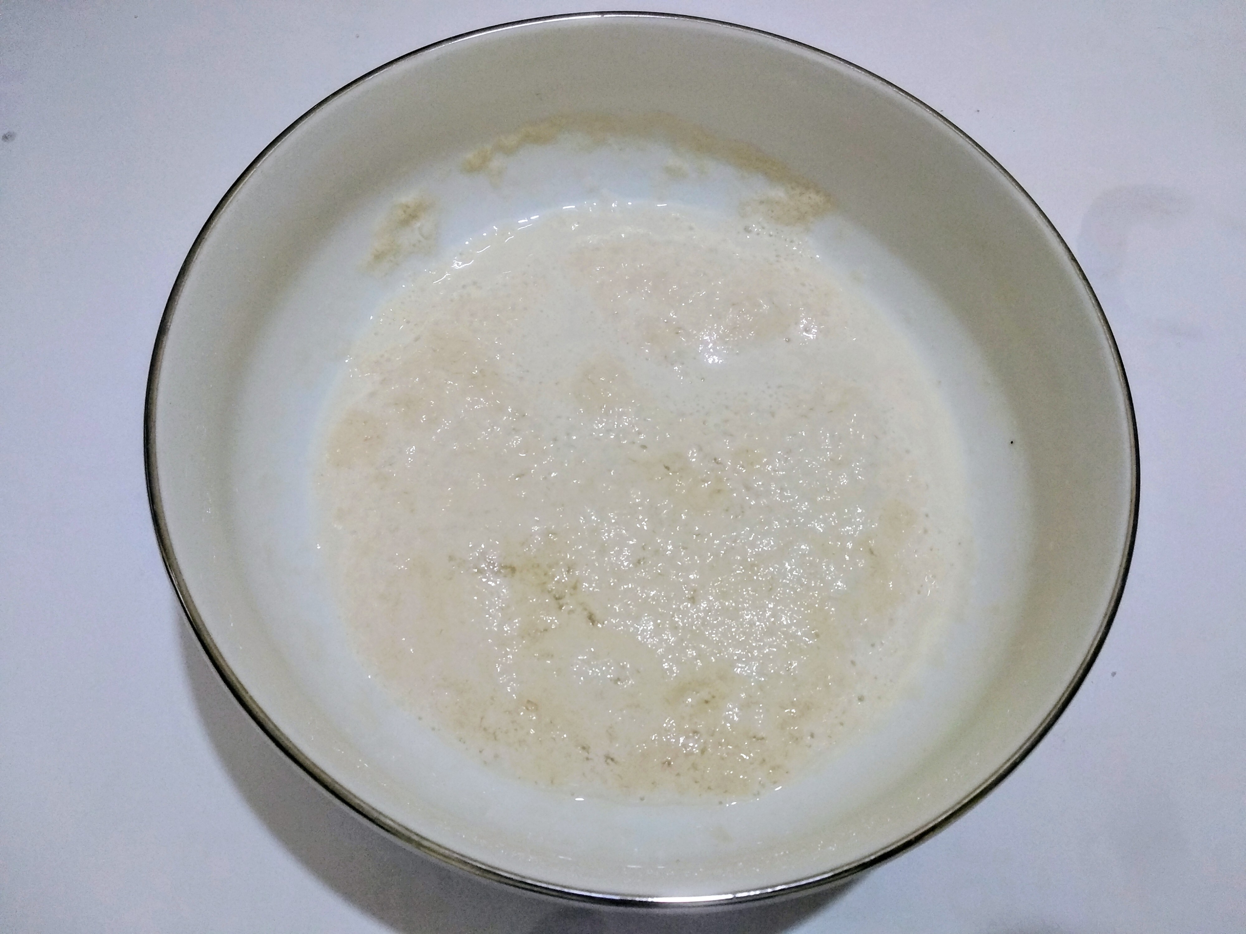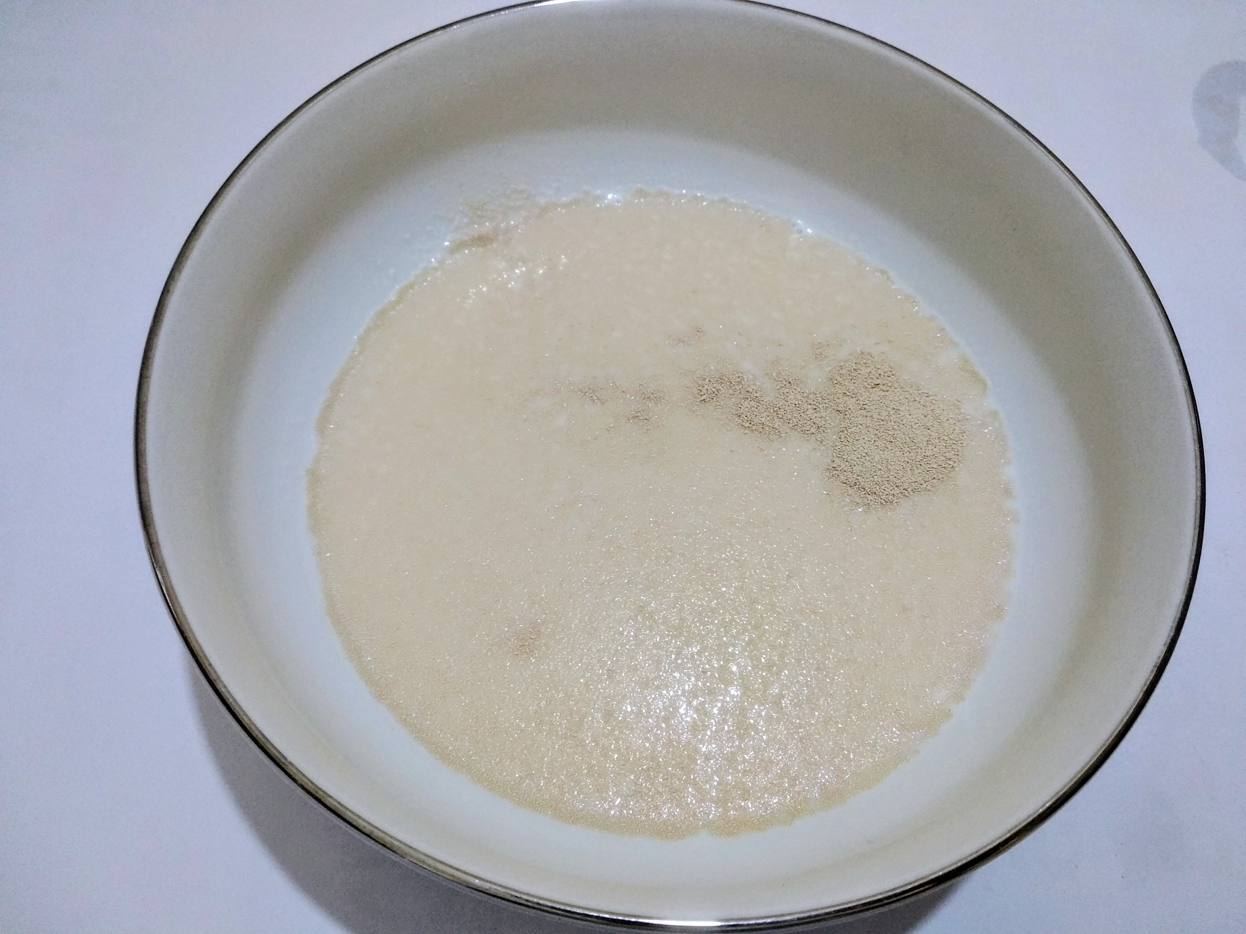 In a clean bowl, I will first mix 1 tbs of sugar and 2 tsp of dry yeast in the warm milk. I will wait until the yeast foams. The yeast foams in about 10-120 minutes.