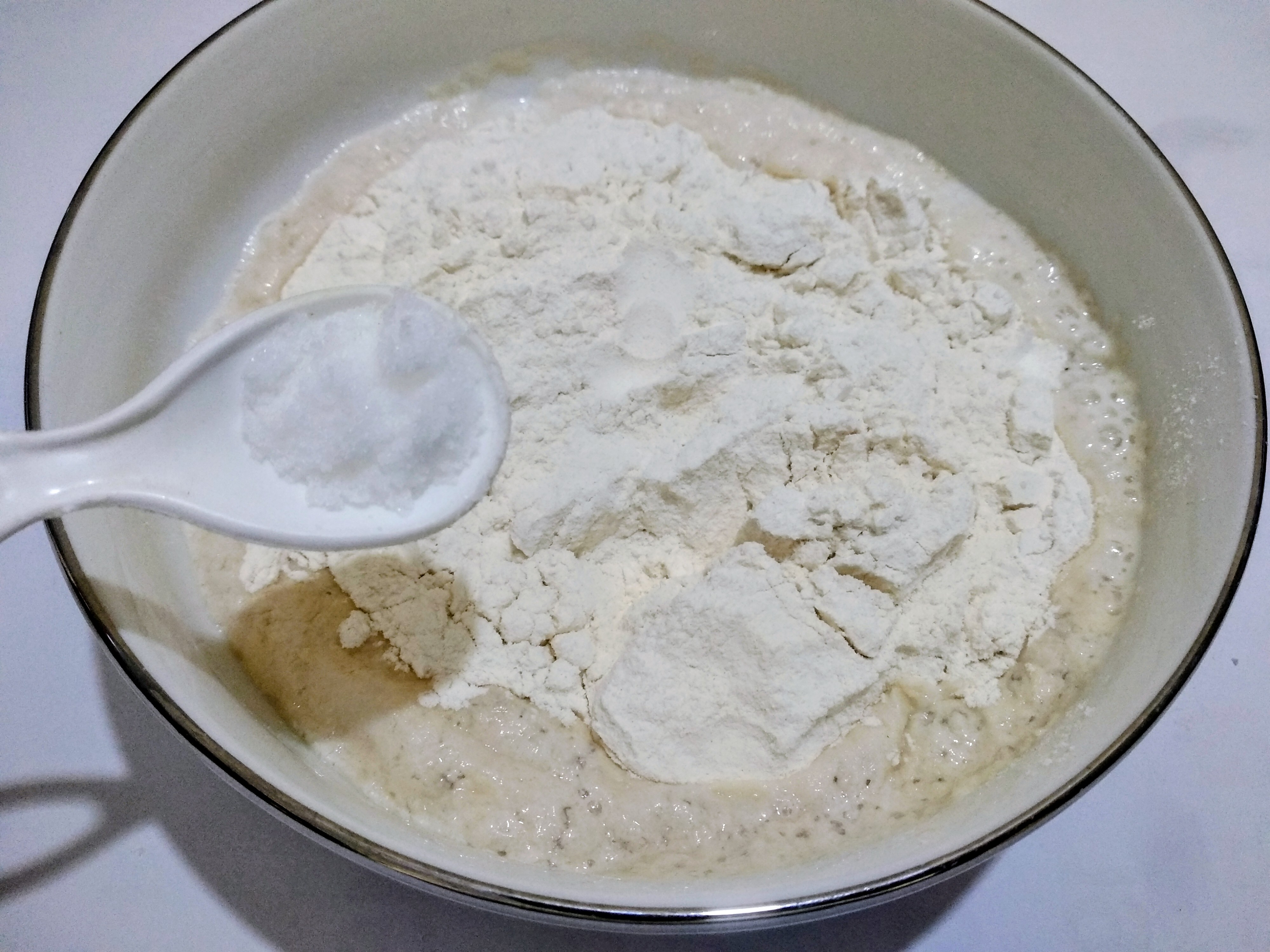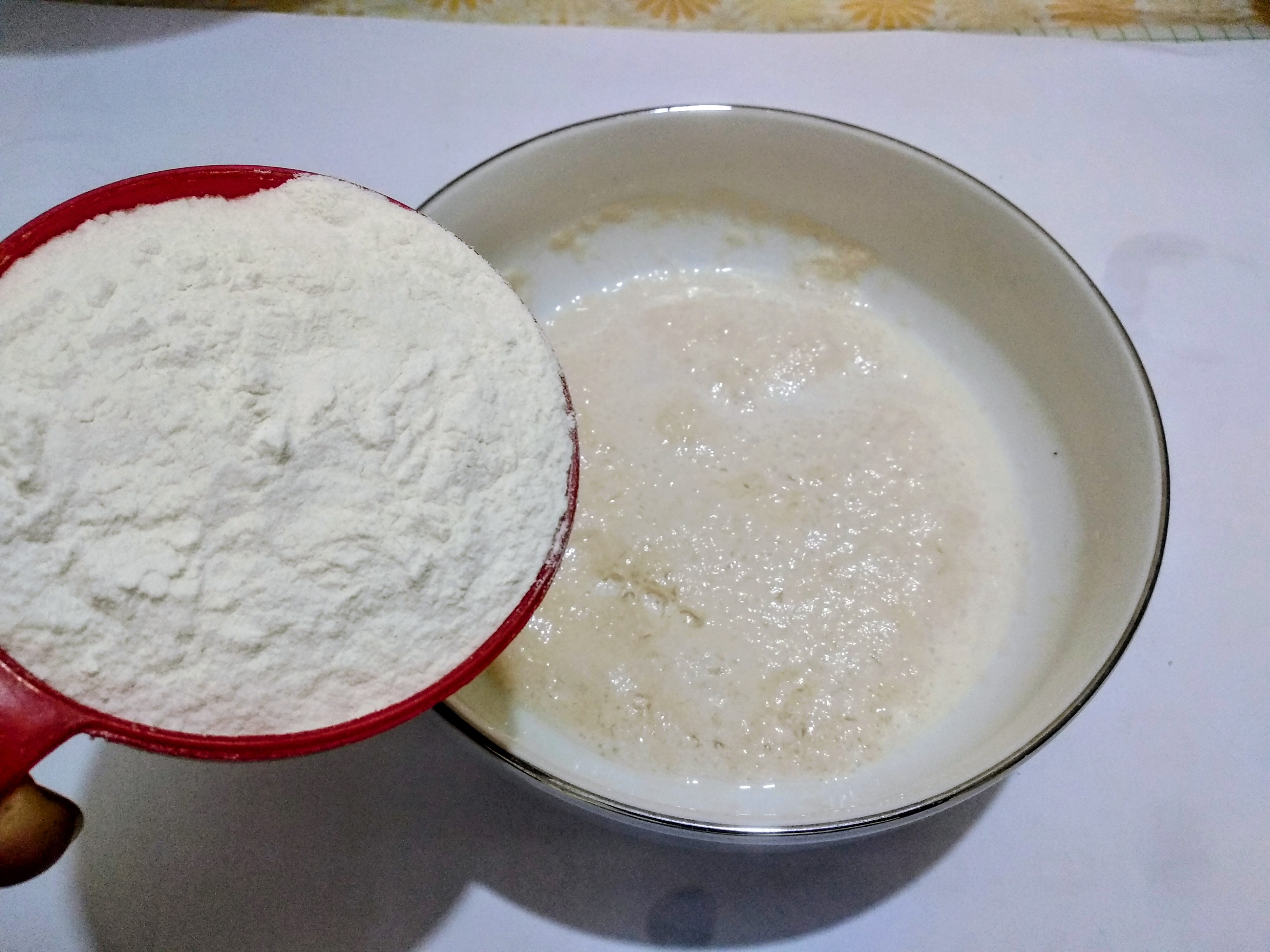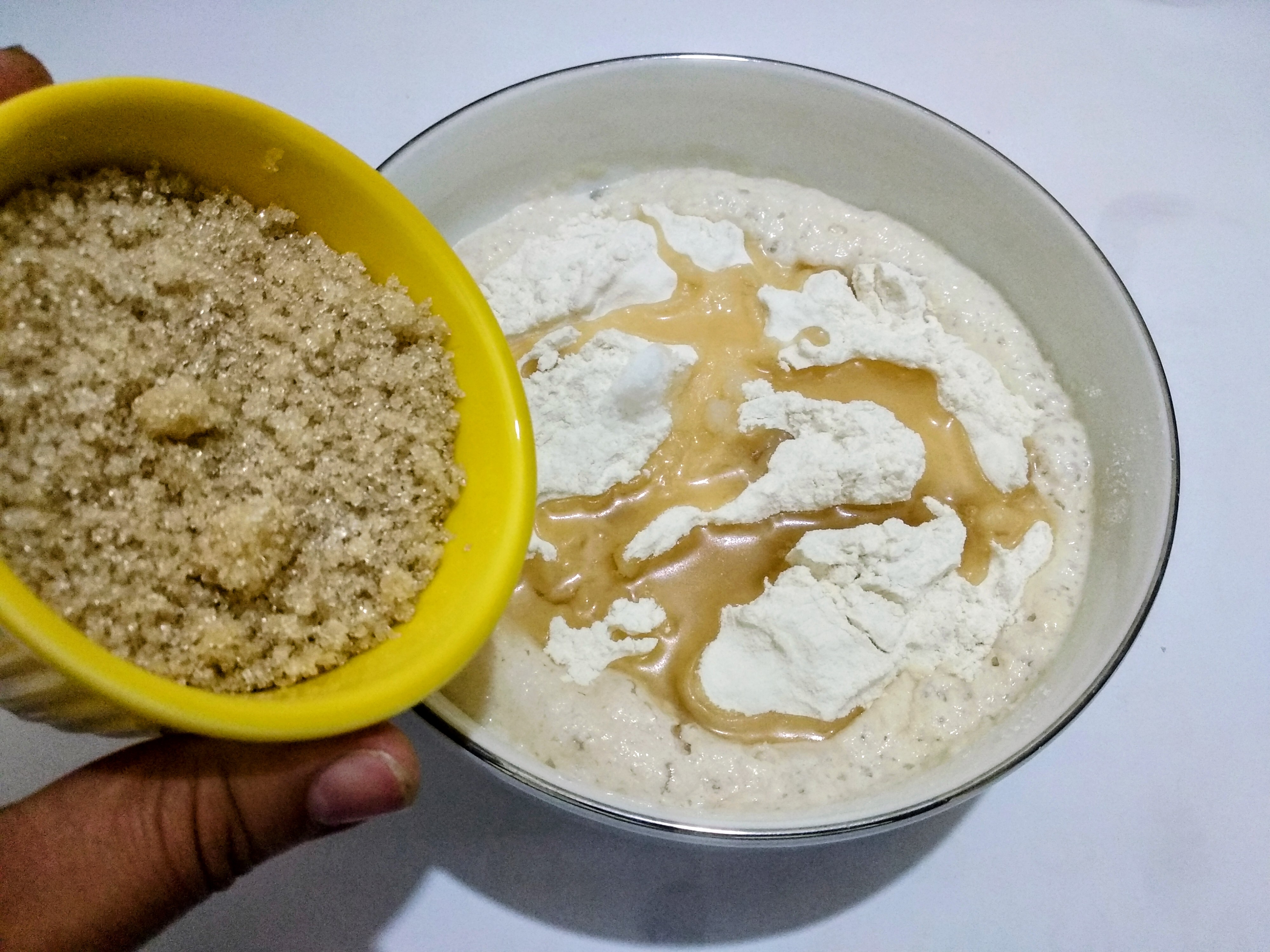 In a clean bowl, I will first mix 1 tbs of sugar and 2 tsp of dry yeast in the warm milk. I will wait until the yeast foams. The yeast foams in about 10-120 minutes.