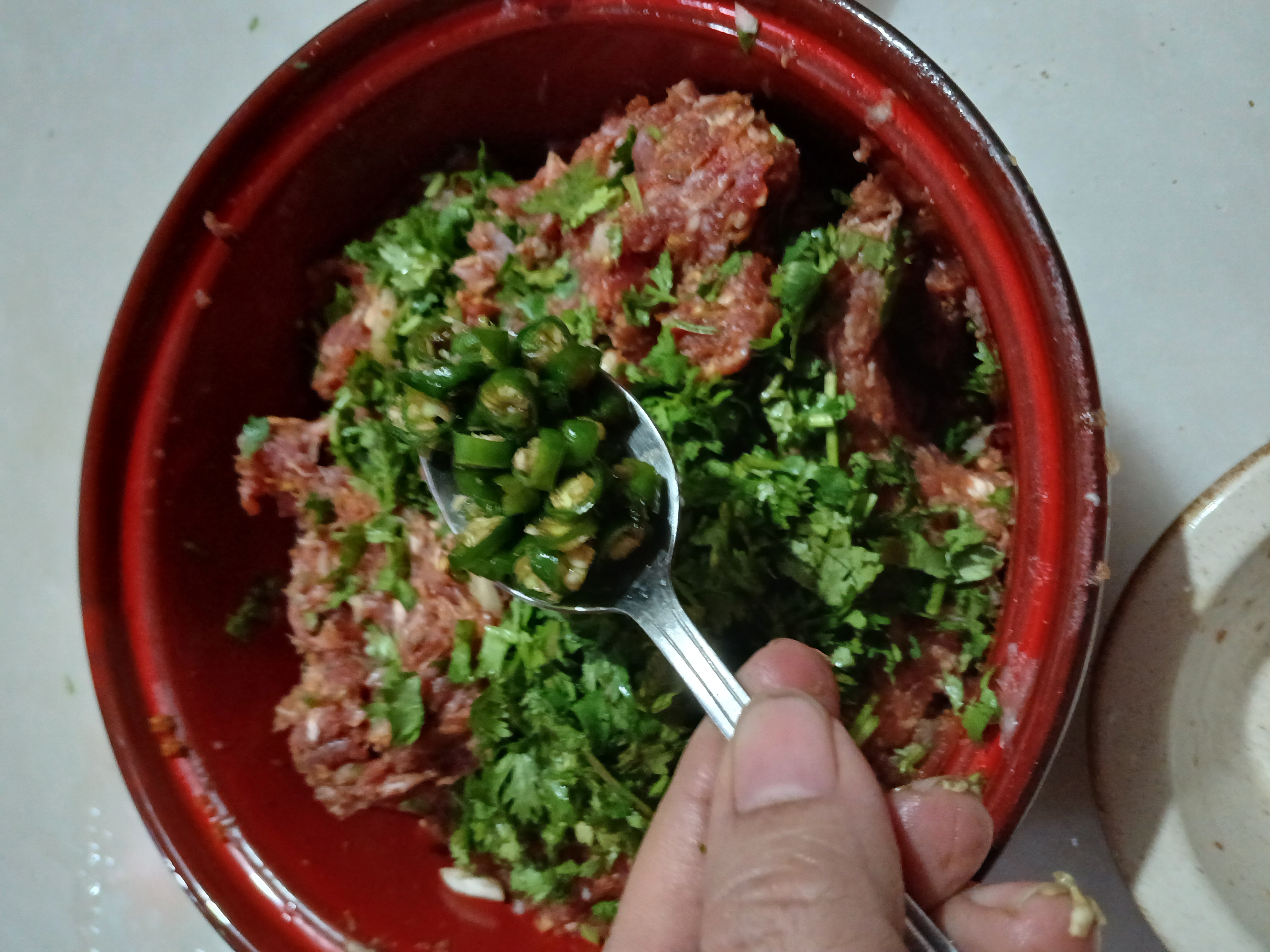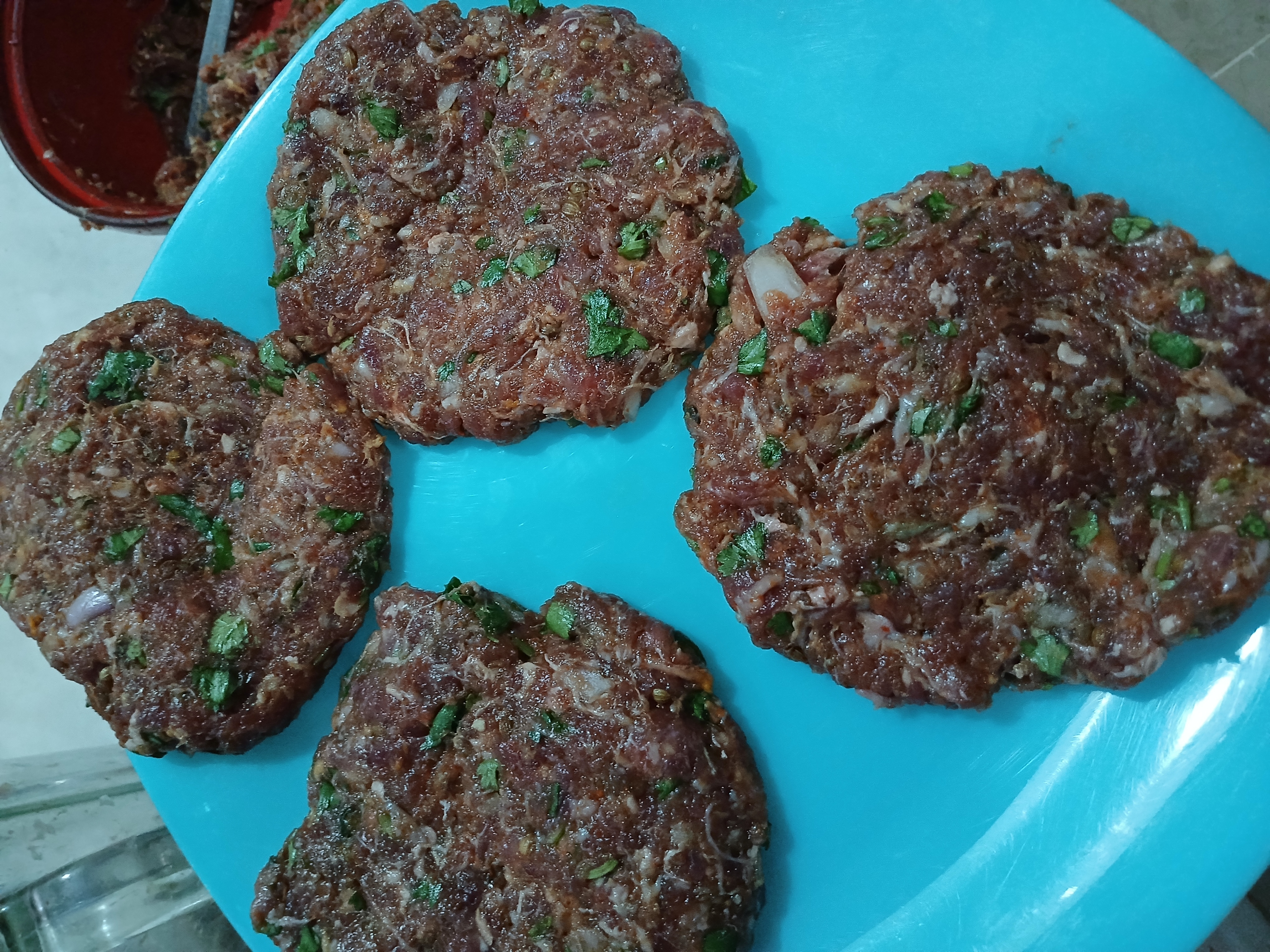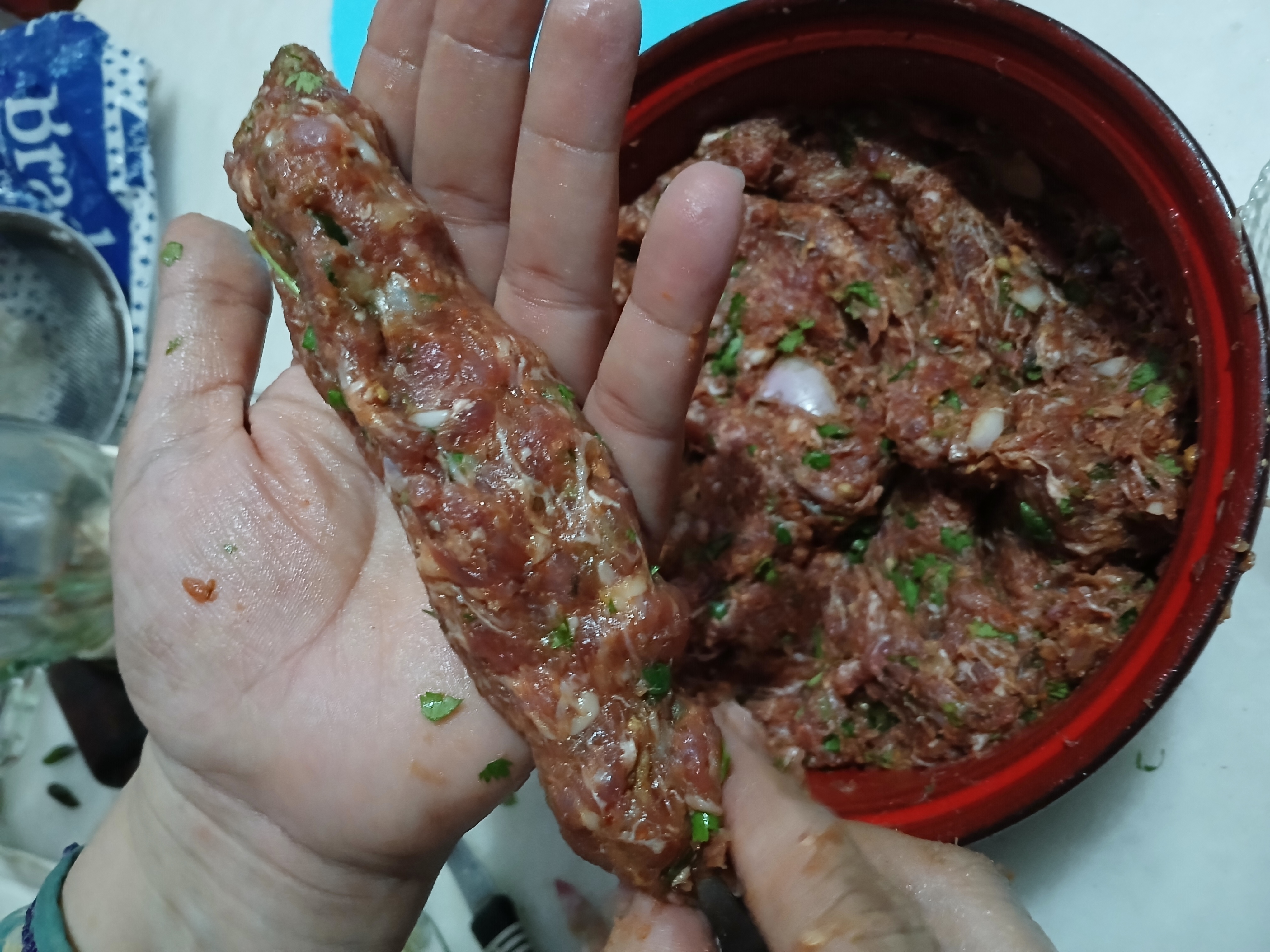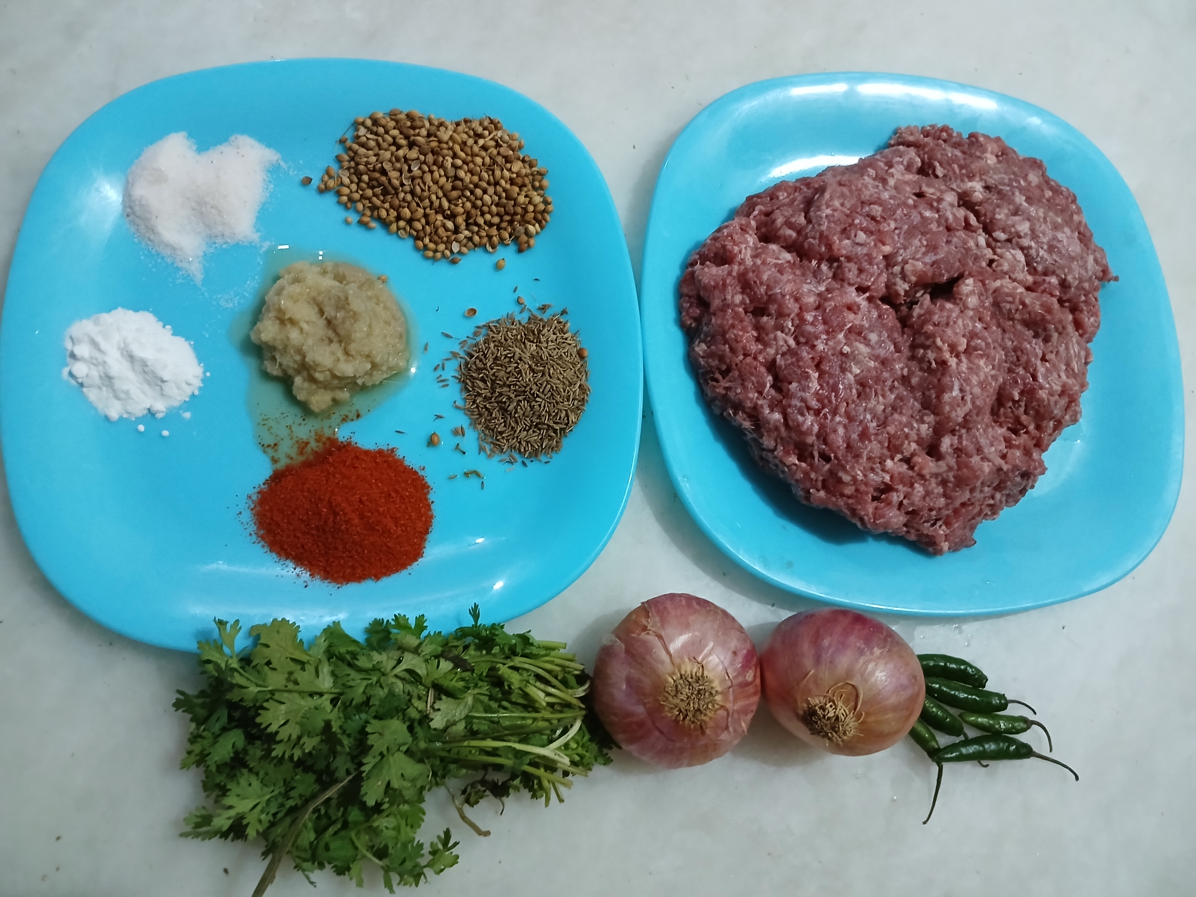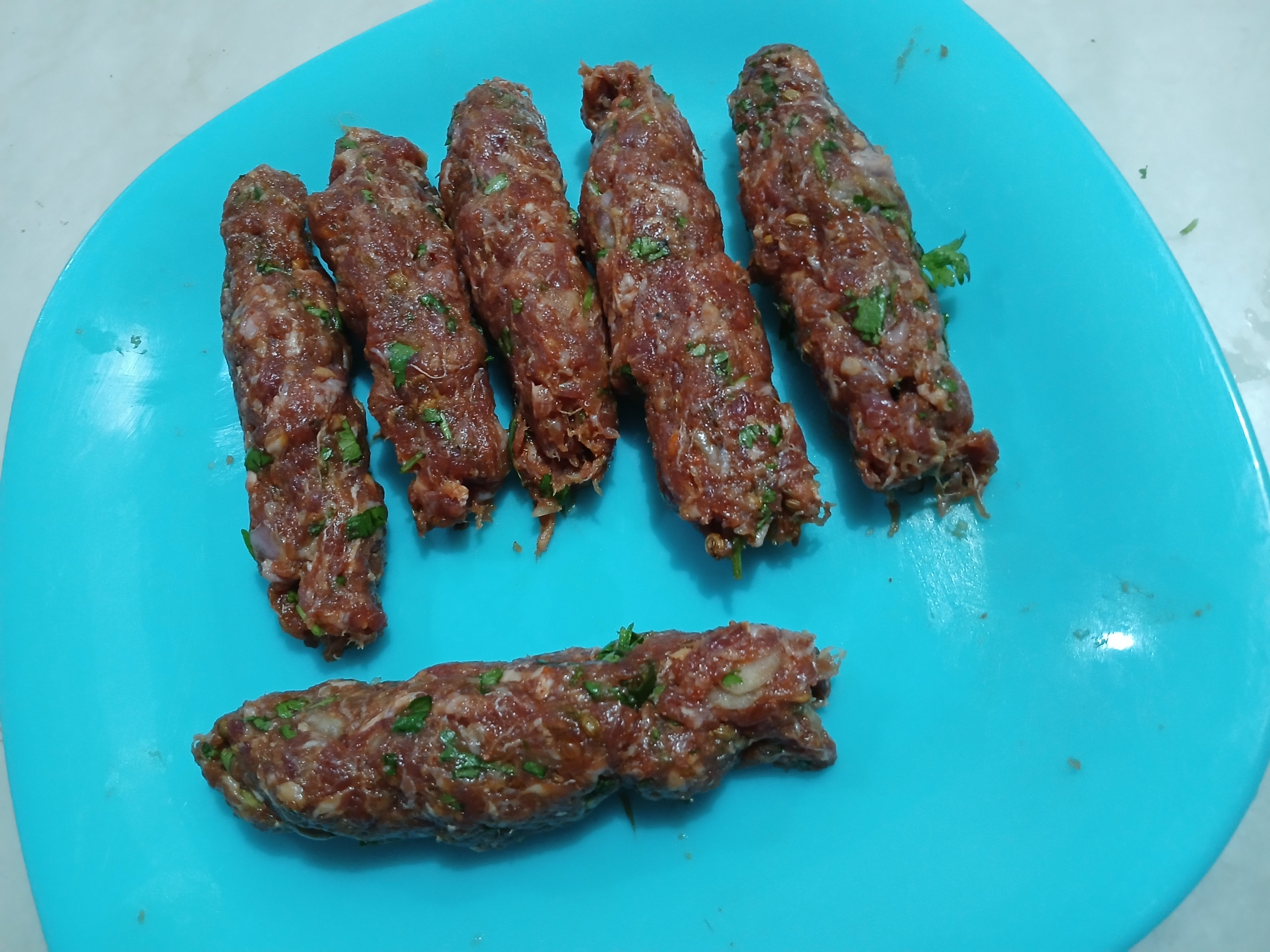 • In a bowl,add beef mince, garlic, ginger, onion, green chillies,mintleaves,fresh coriander,baking soda,garam masala powder,coriander seeds,red chilli crushed,cumin seeds,salt,red chilli powder and mix well.