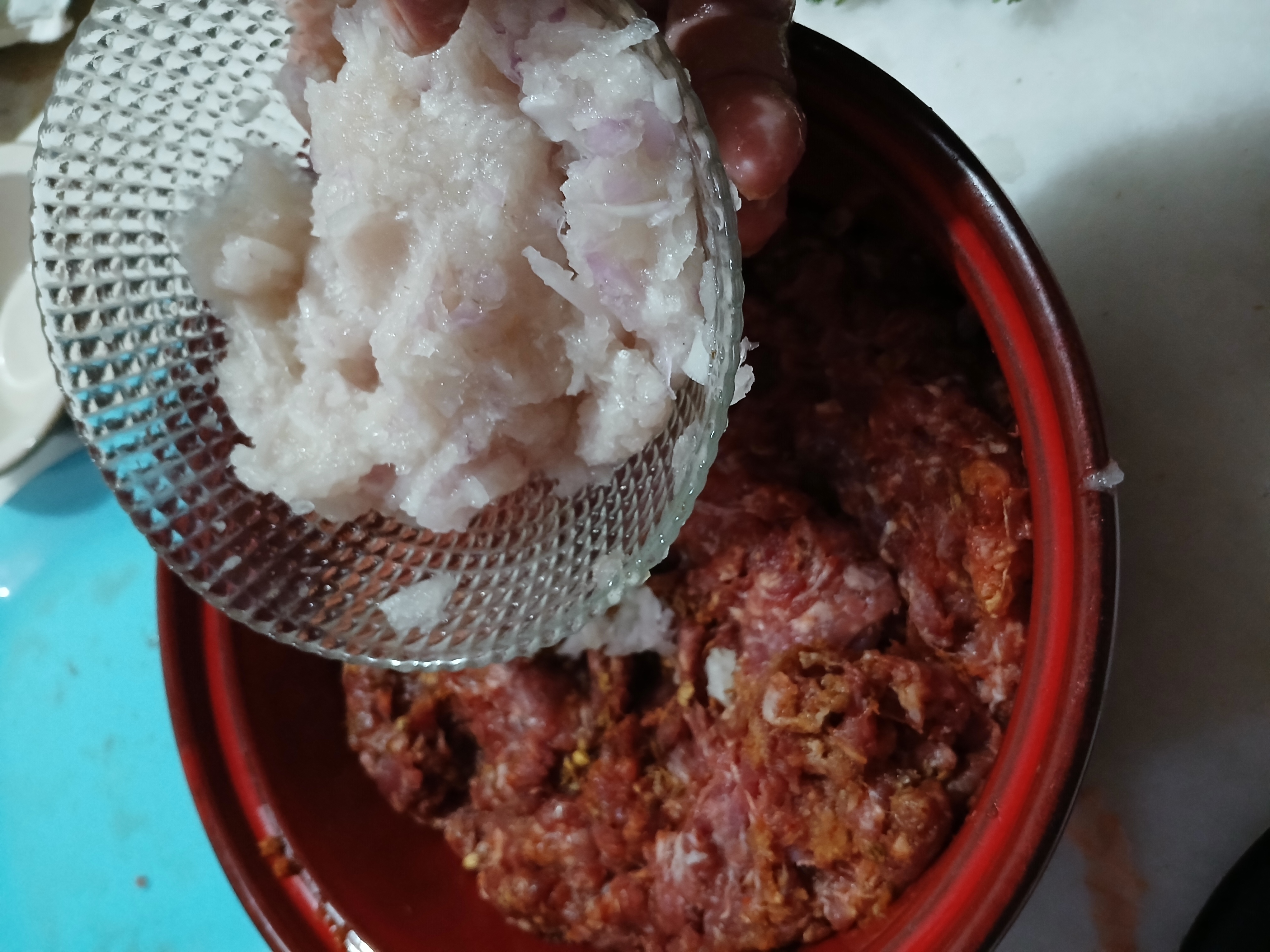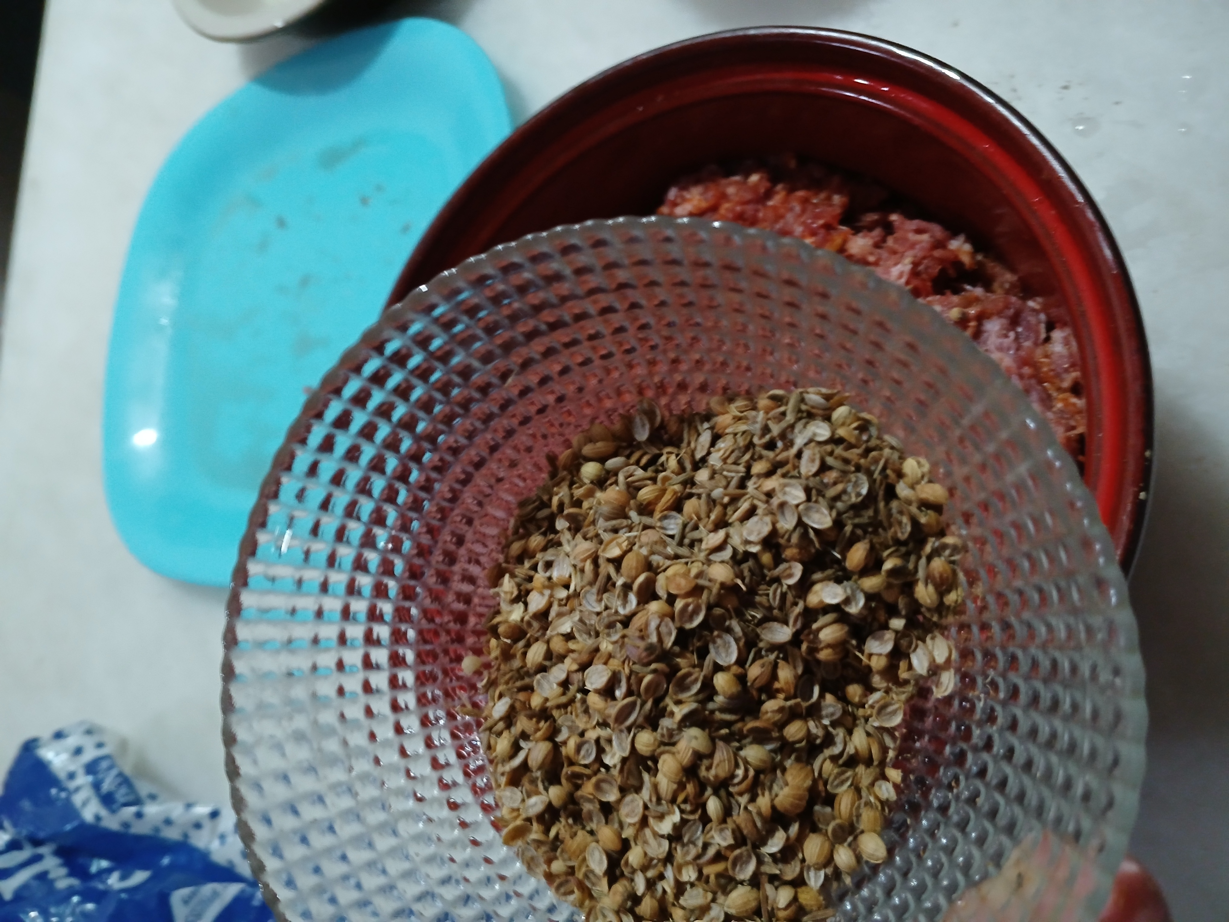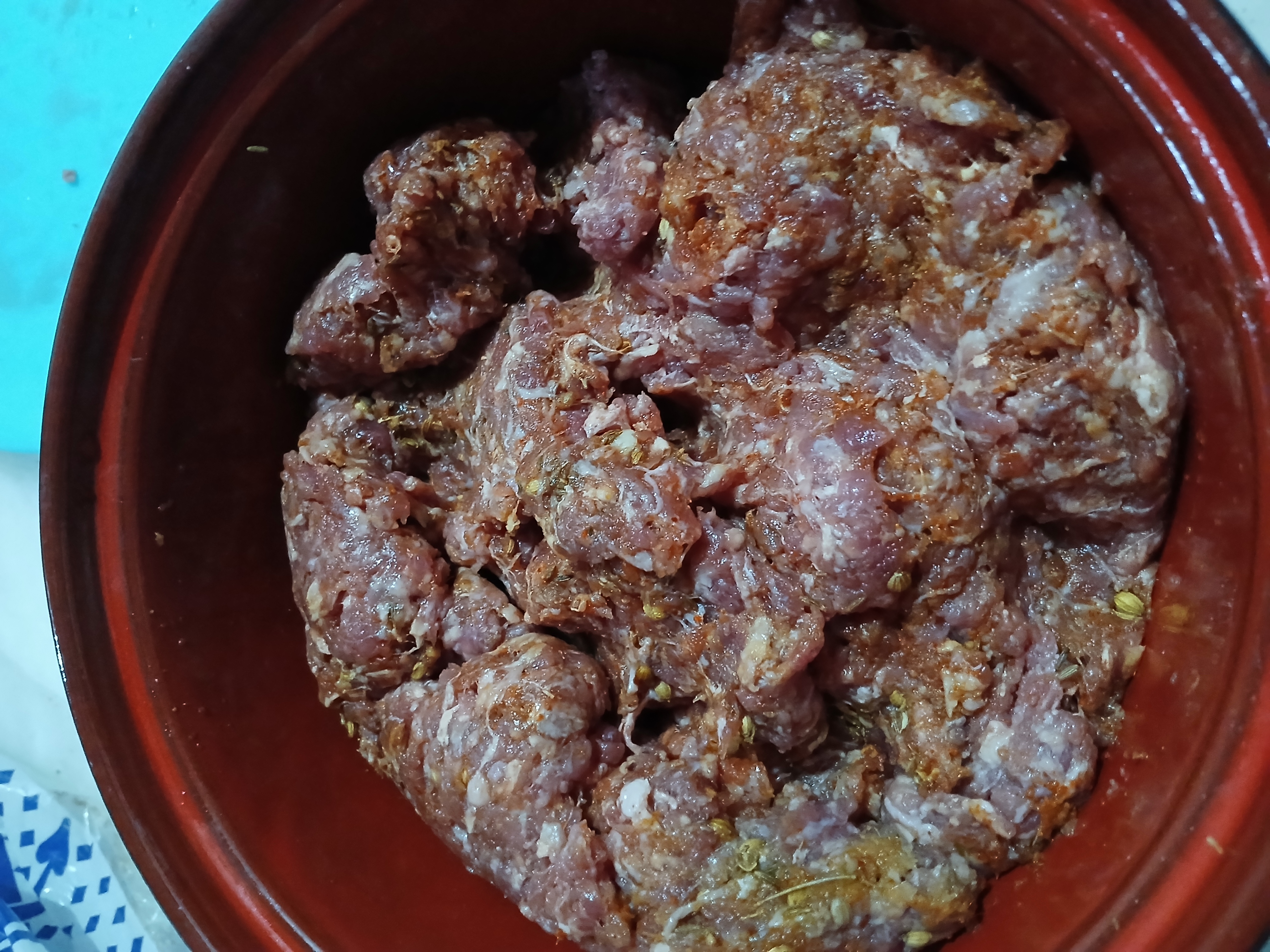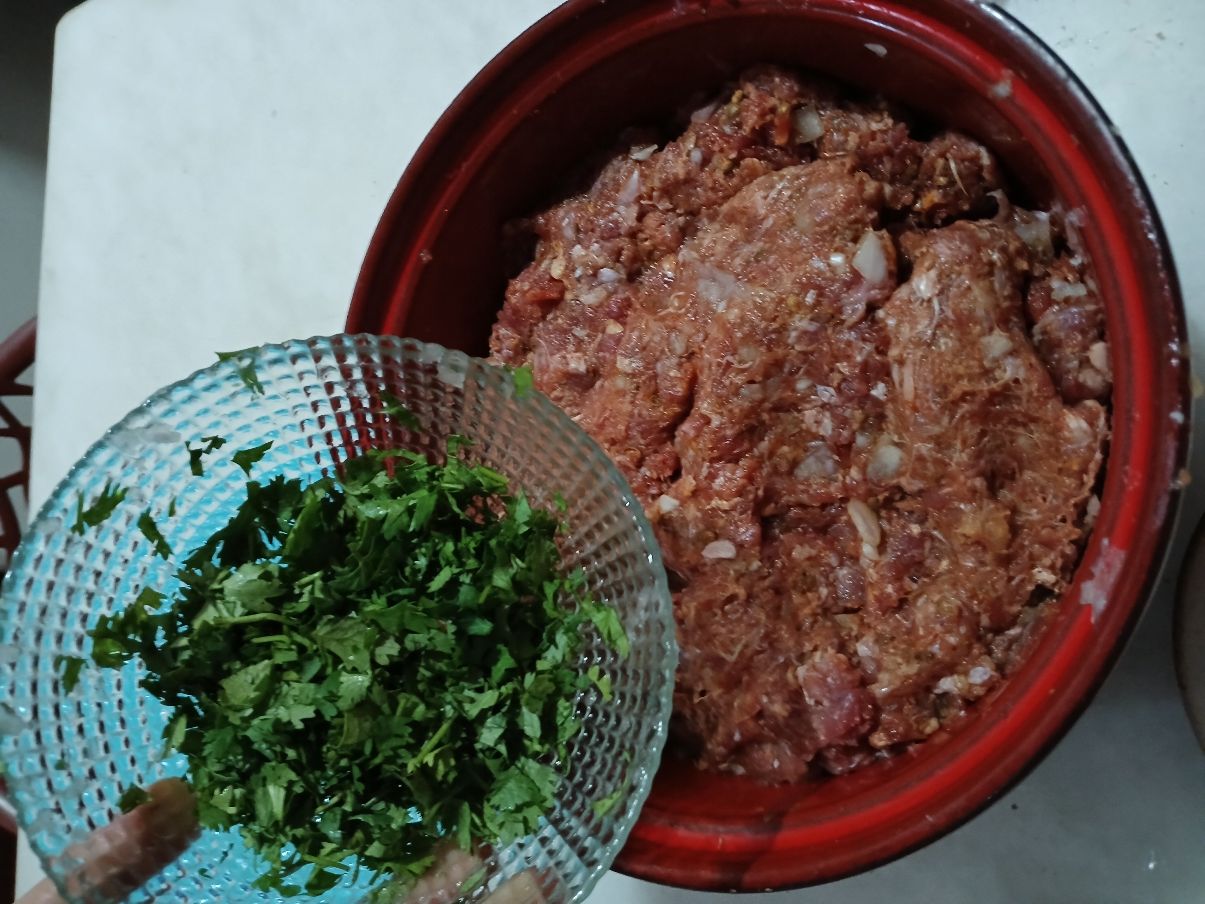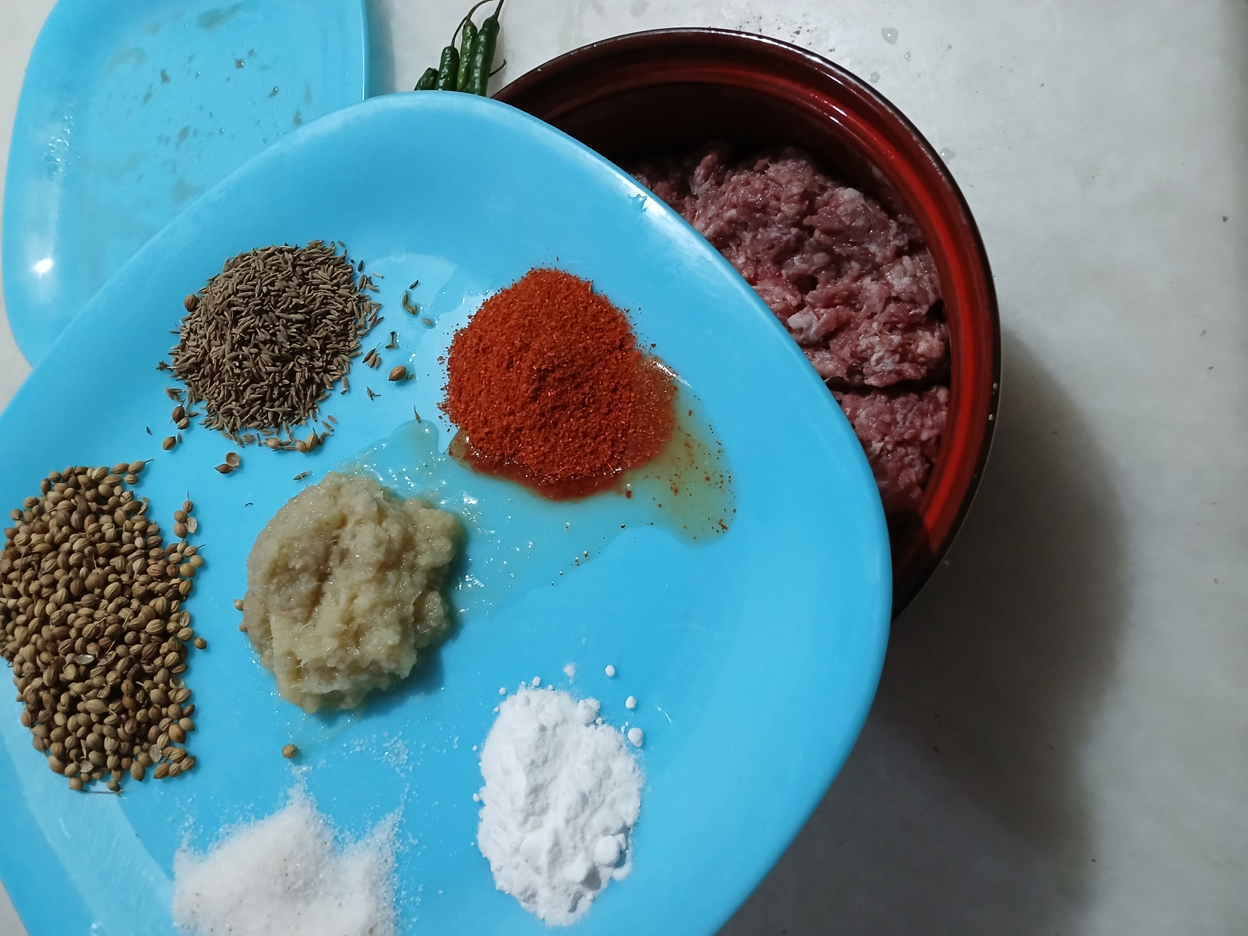 • In a bowl,add beef mince, garlic, ginger, onion, green chillies,mintleaves,fresh coriander,baking soda,garam masala powder,coriander seeds,red chilli crushed,cumin seeds,salt,red chilli powder and mix well.