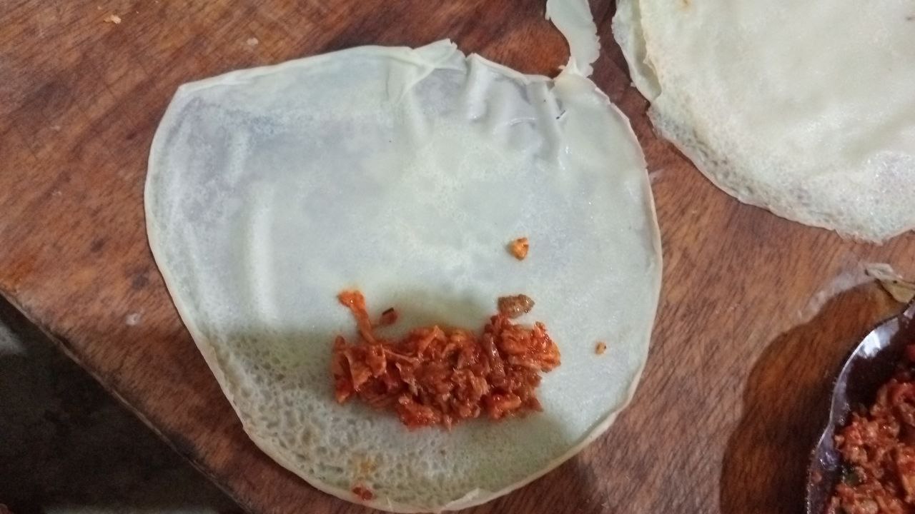 Kulit risol aku bentangkan, lalu aku isi secukupnya. Nah ini penting ya guys jangan terlalu banyak isiannya Karena nanti susah digulung dan bisa bocor