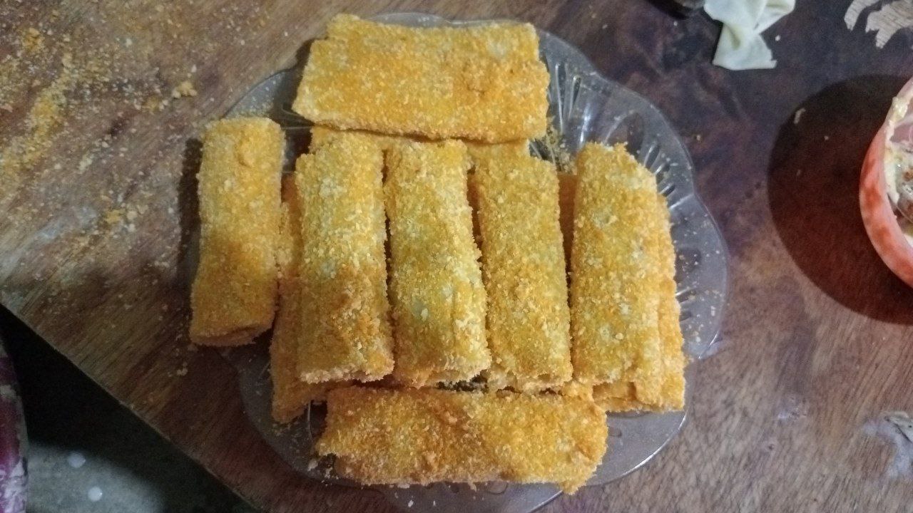 Setelah itu, aku gulung rapi, celupkan ke tepung cair, lalu baluri dengan tepung panir.
