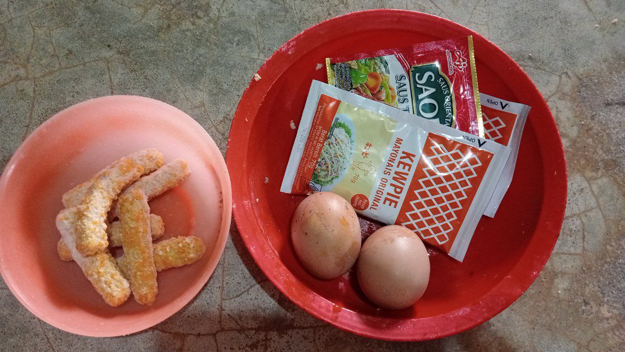 Mayones aku masukin ke mangkuk, terus aku tambahin telur rebus yang udah dipotong-potong. Plus nugget tadi sebagai pengganti sosis. Rasanya? Jangan ditanya… udah kebayang enaknya