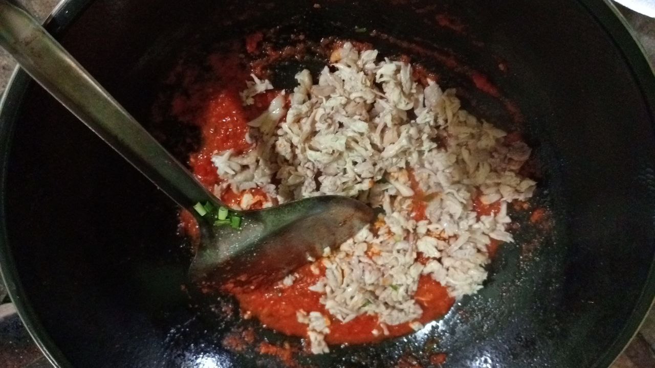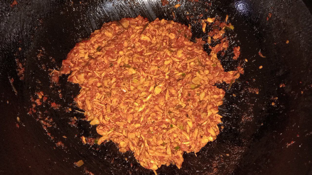 Kalau udah agak kering, baru deh masukin ayam suwirnya. Diaduk-aduk sampai bumbunya meresap sempurna. Nah, isian ayam suwirnya pun jadi!