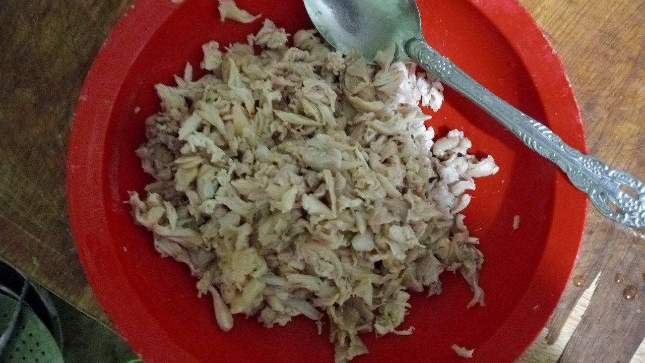 Begitu ayamnya udah empuk, aku langsung suwir-suwir kecil. Jujur ya, ini bagian yang agak capek tapi seru.
