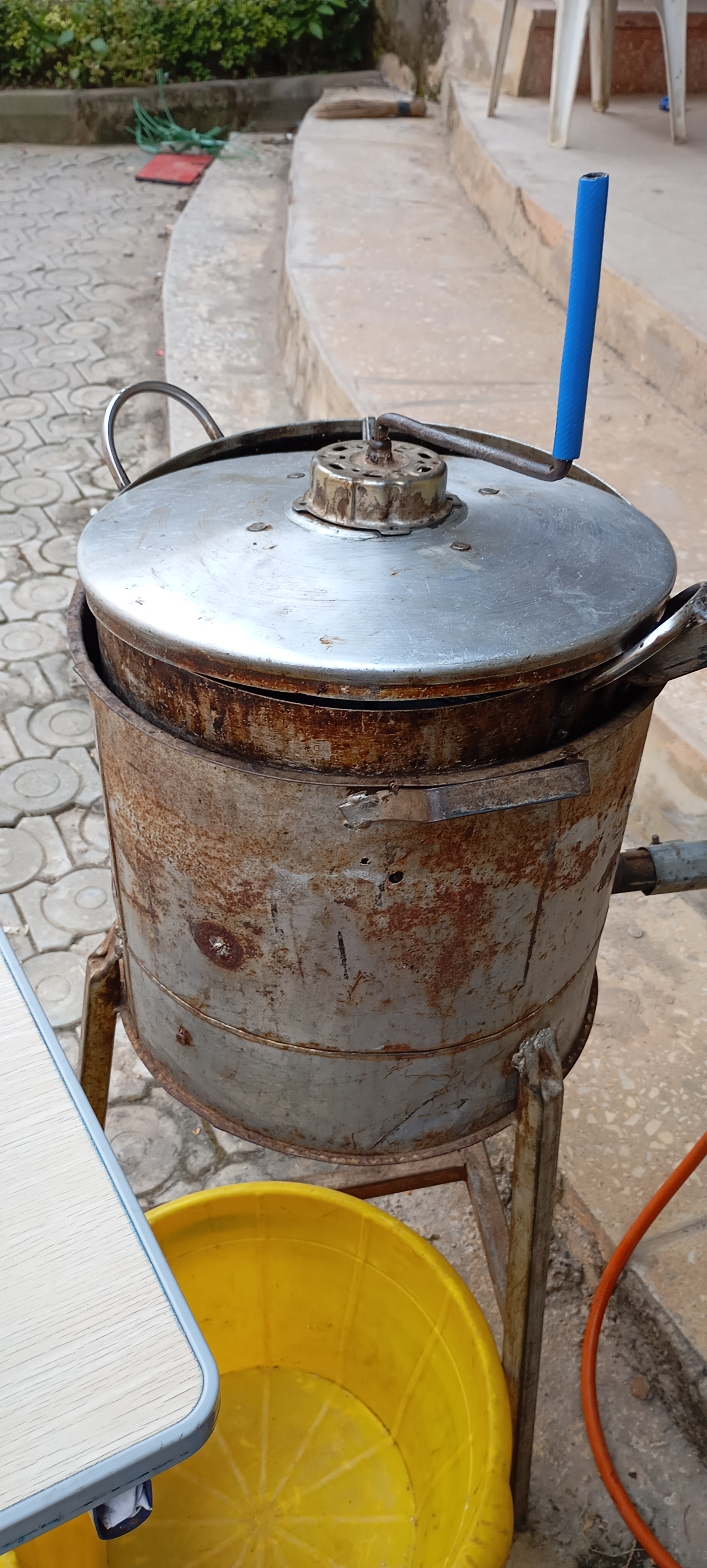 I put my butter and little groundnut oil with sugar and popped my corn kernels on high heat using my manual machine and set aside.