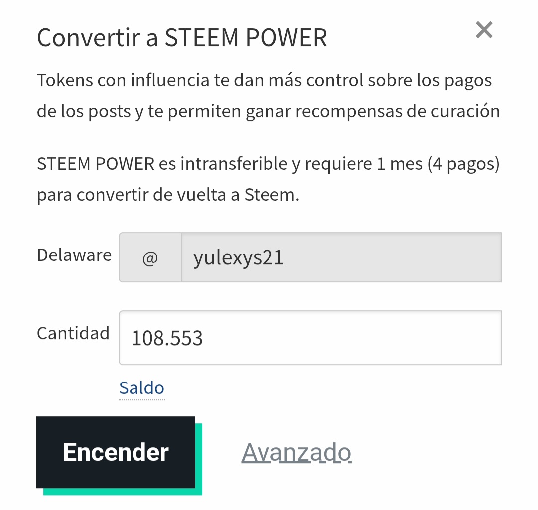 En el siguiente paso se despliga una ventana donde me refleja la cantidad de steem disponible, para convertir nuestro Liquid steem en Steem power, posteriormente hago click en encender para completar mi prpceso.