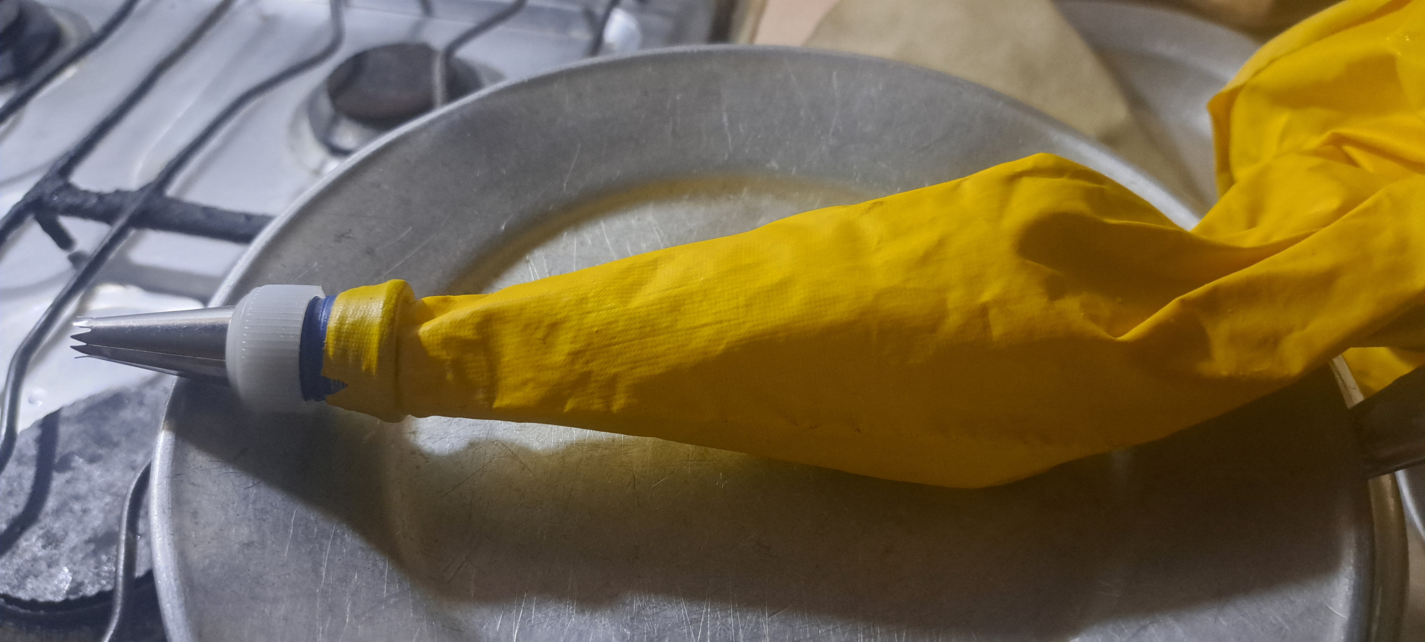 Llenamos la manga con la mezcla preparada, con la boquilla insertada para ir haciendo las galletas.