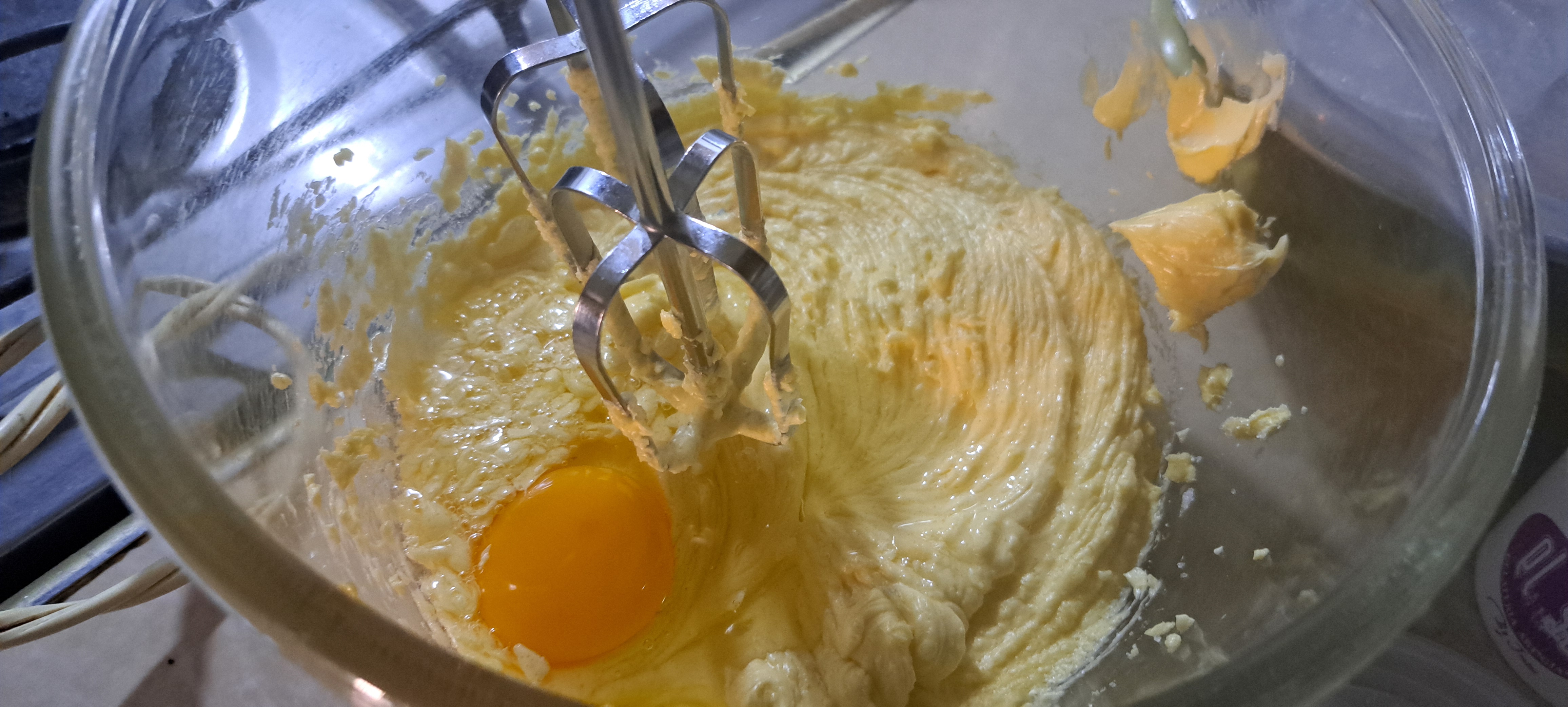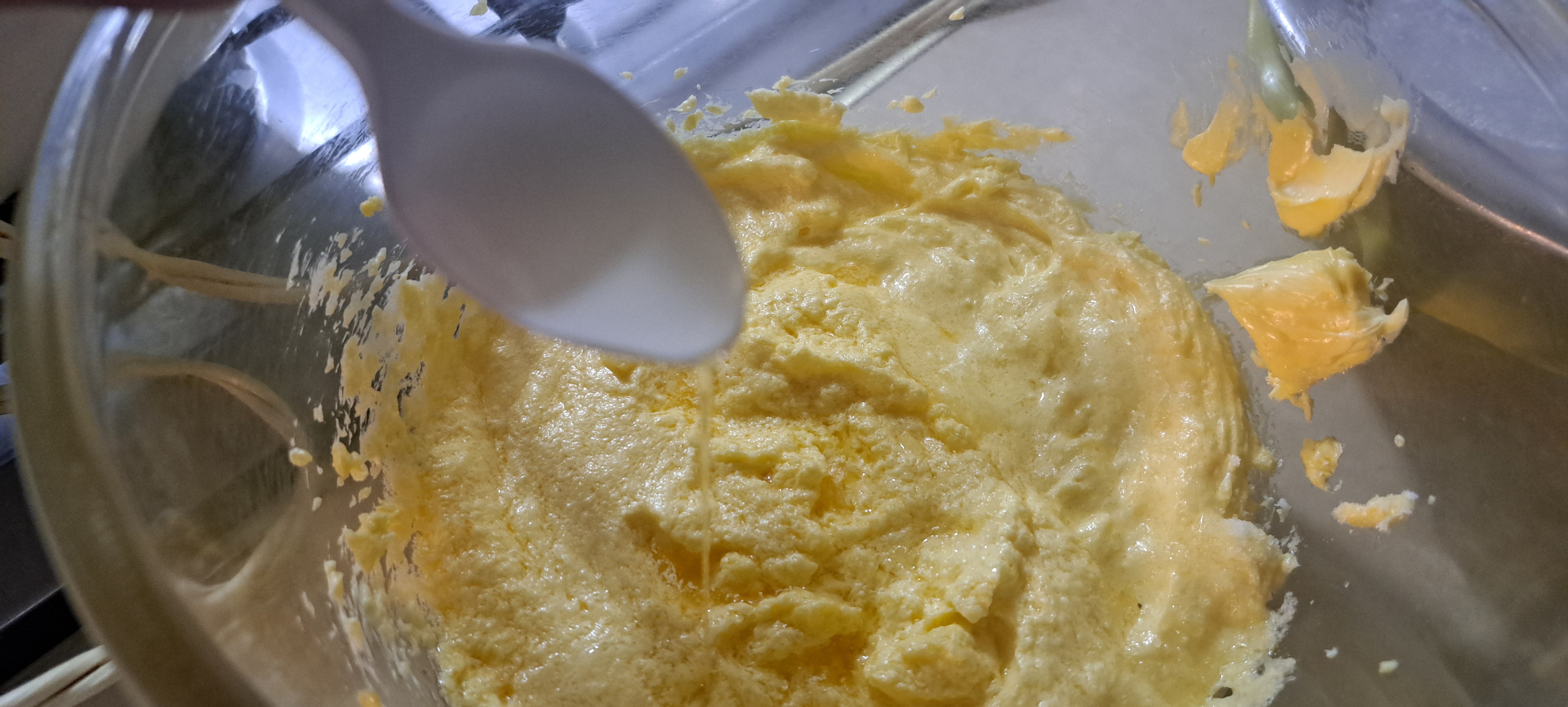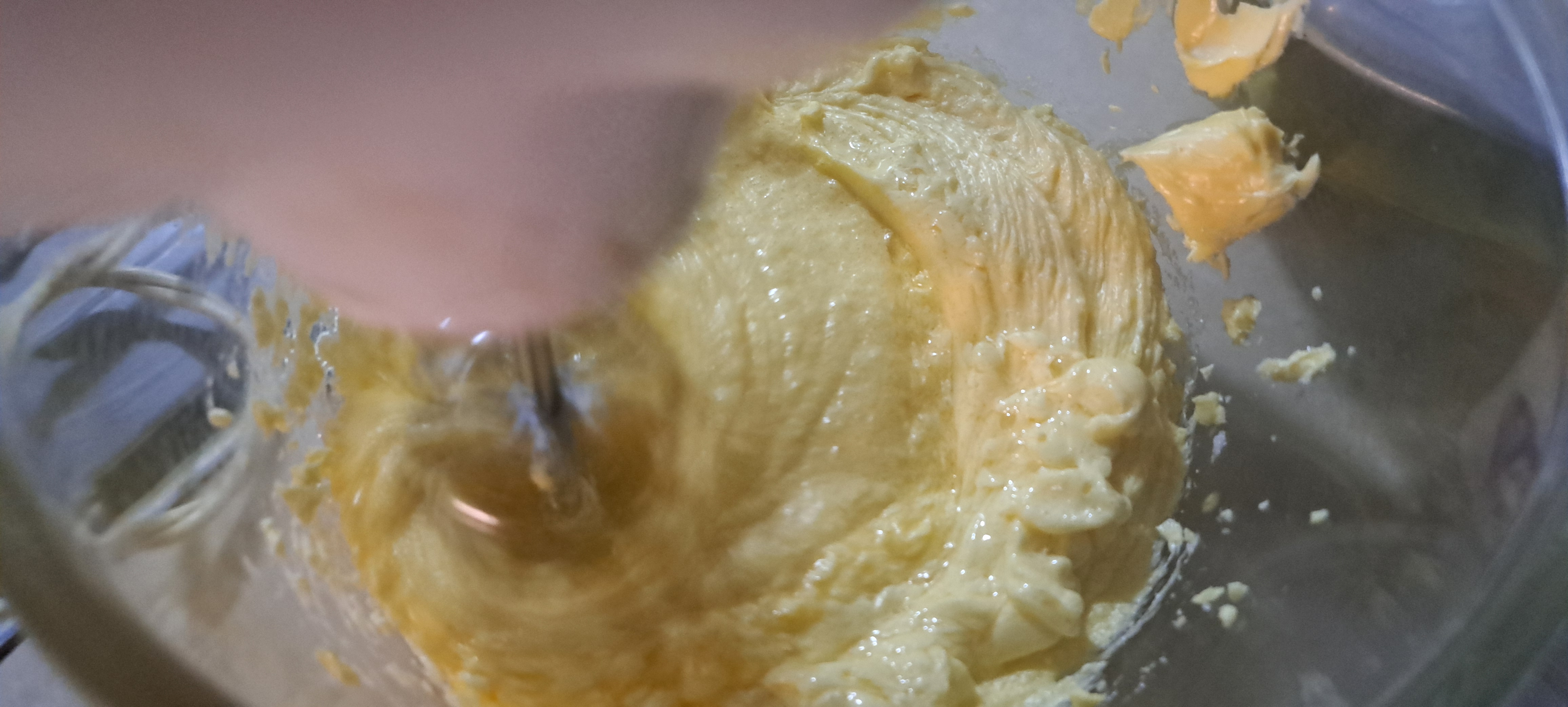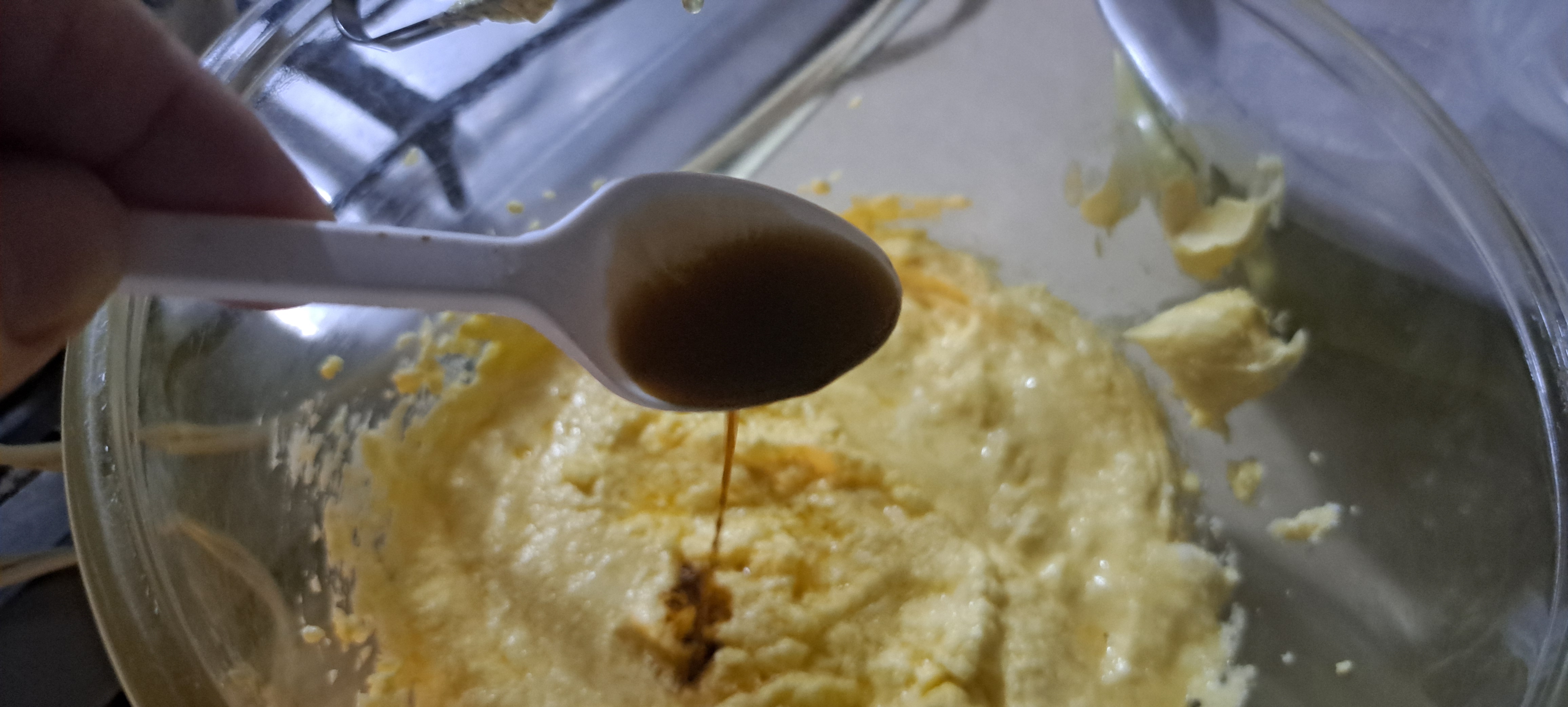 Despues de cremar, le fui agregando uno a uno los demás ingredientes: cucharadita de vainilla tambien, le agregue 1 cdta de esencia de nata, la cascara de naranja trituradas y el huevo.