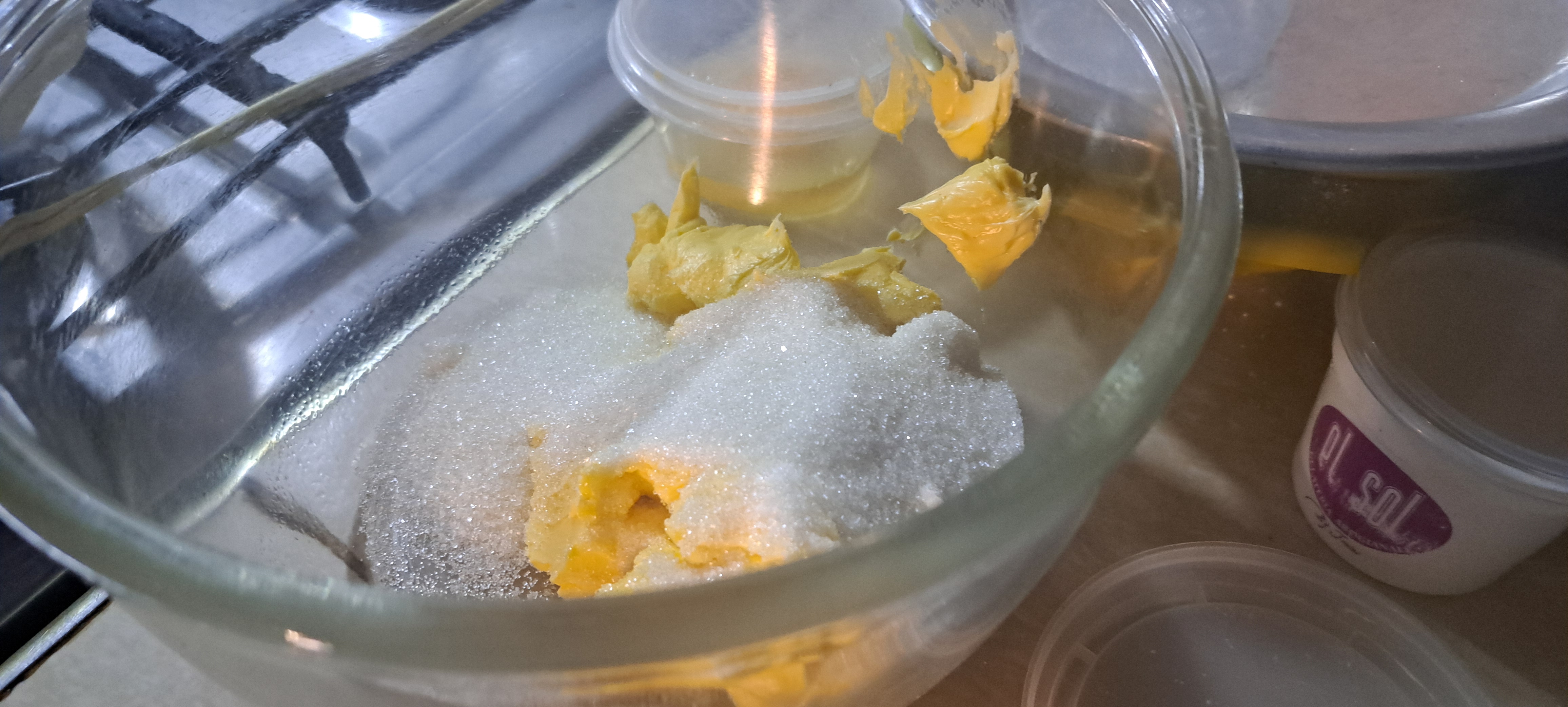 Para comenzar a preparar las galletas, se debe colocar la mantequilla y azúcar en la taza grande.