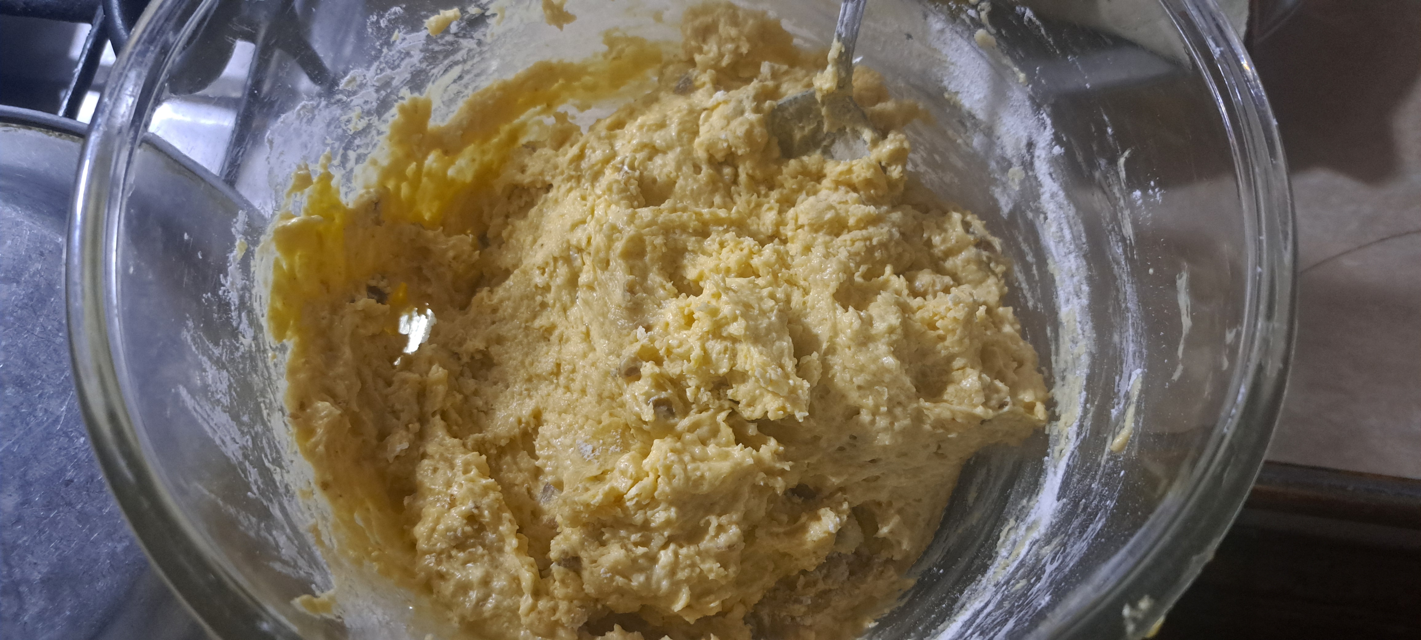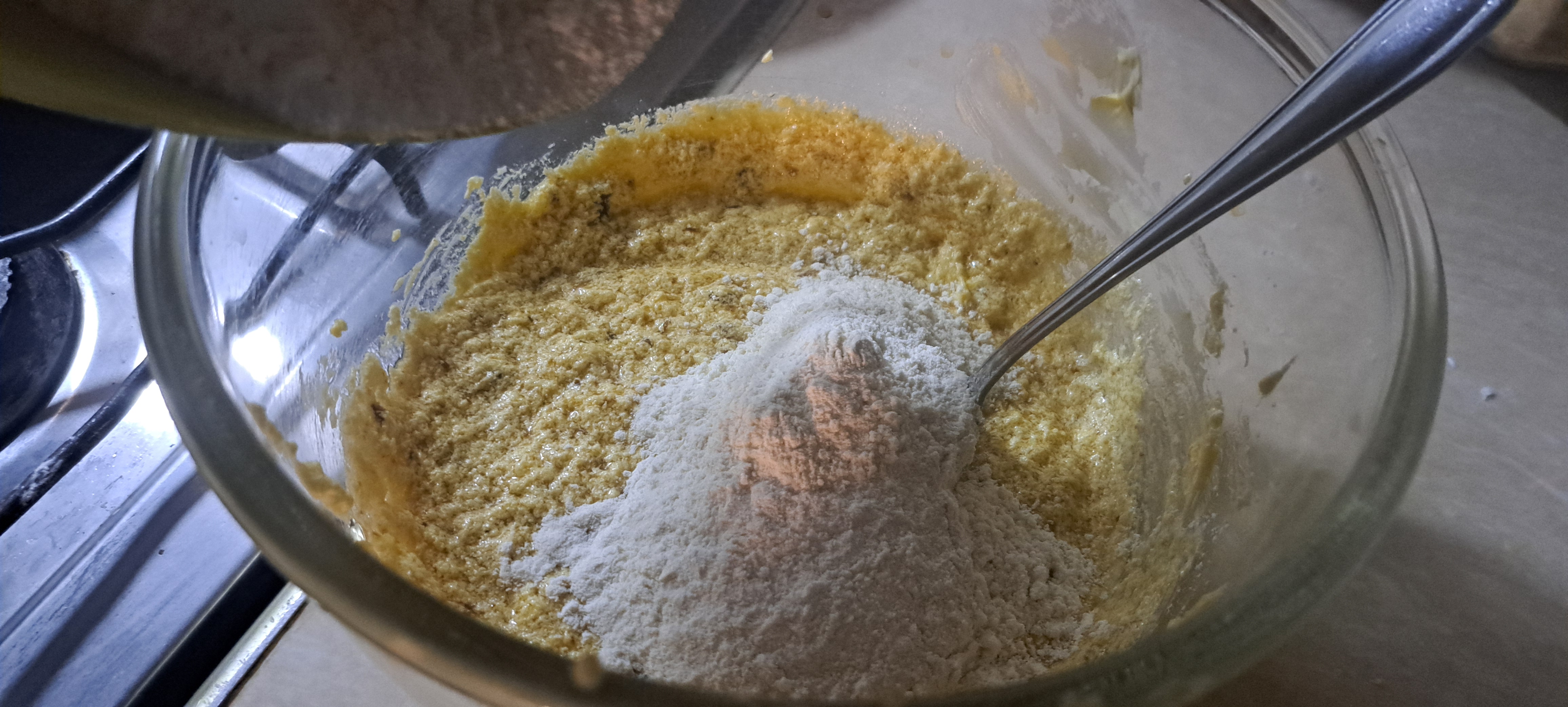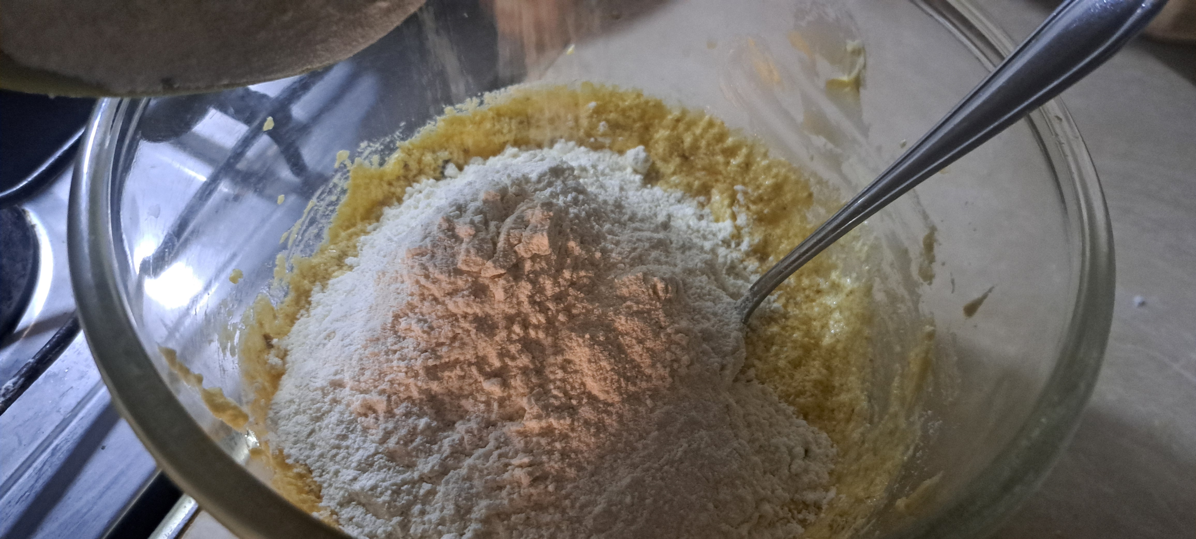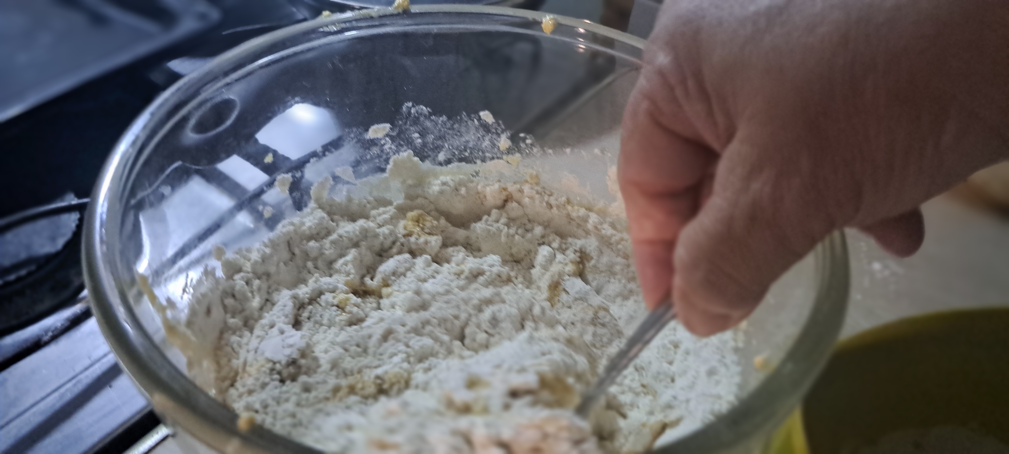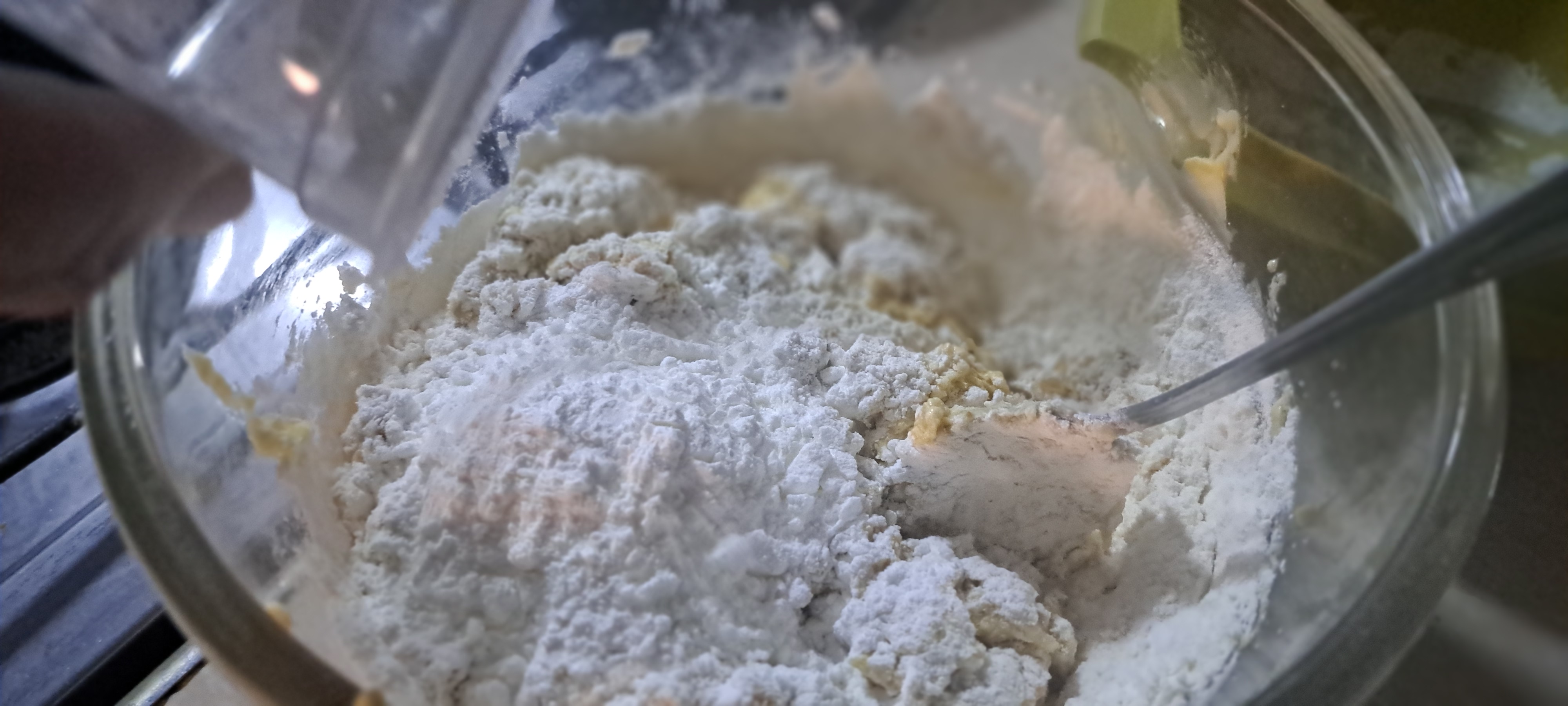 Por ultimo agregue la harina y la maicena y mezcle de manera en envolvente, hasta obtener una compactación blanda.