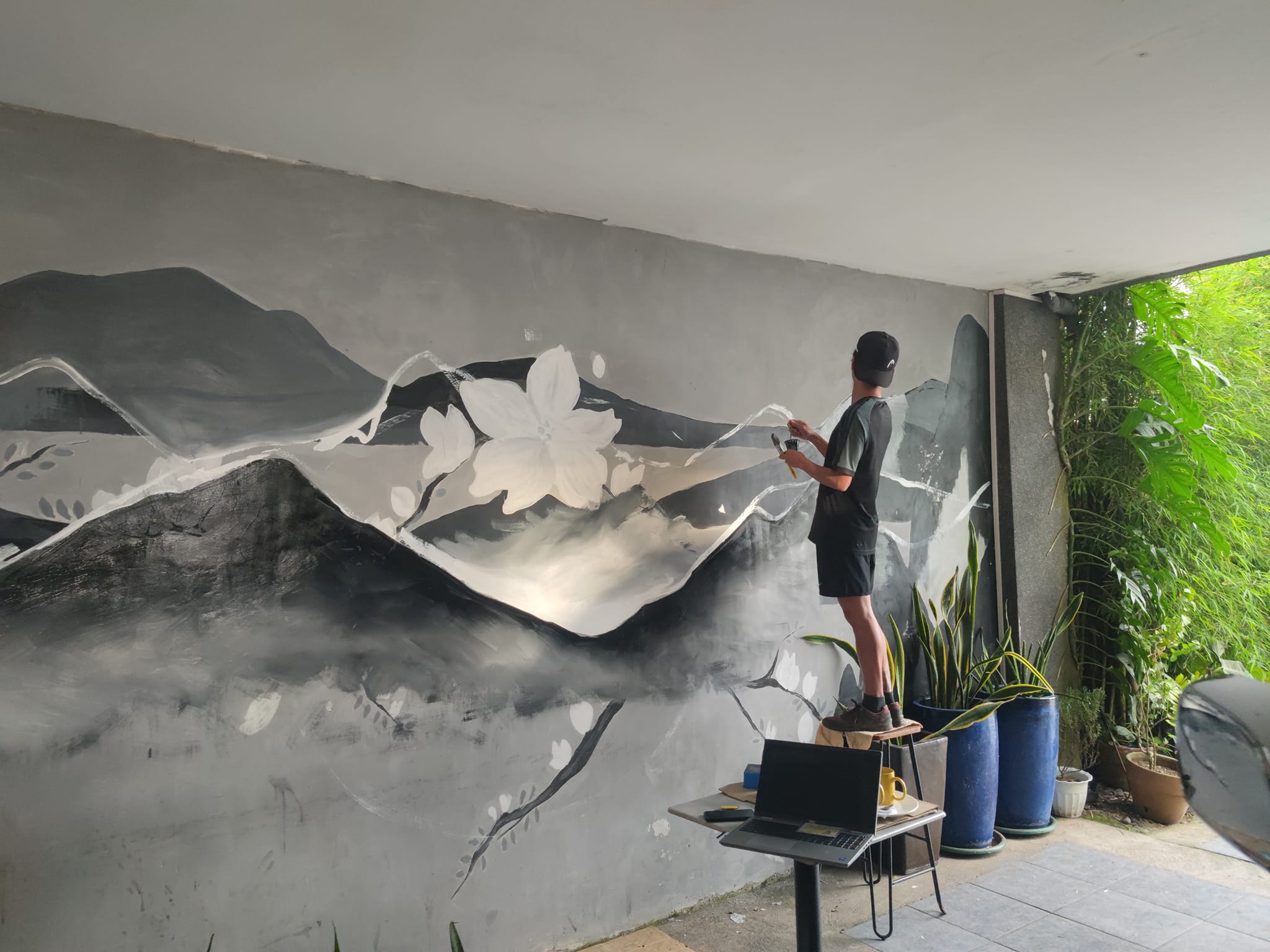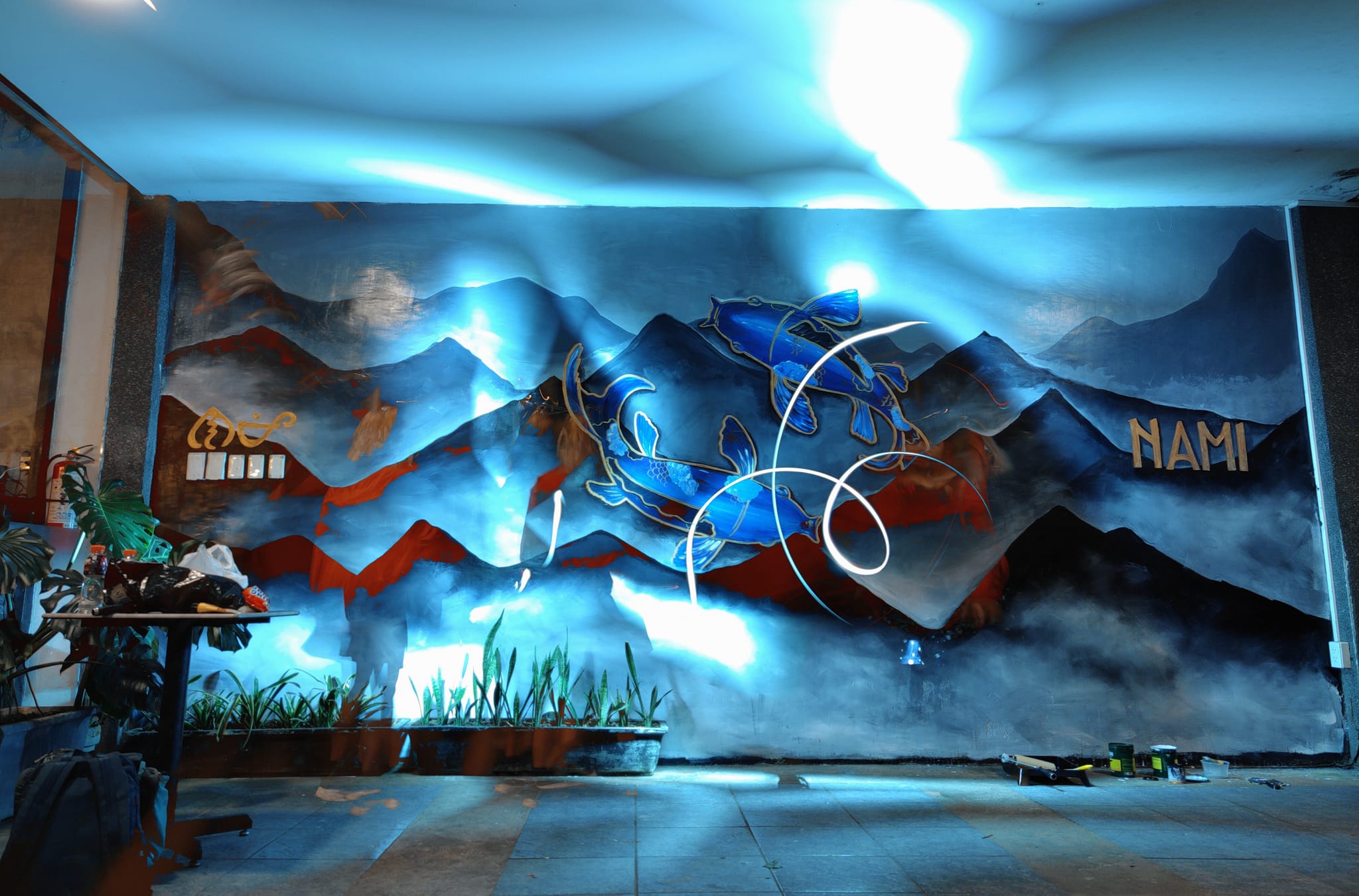 We are commissioned to do a painting piece at Nami Hotel, located in Tagaytay City. The owner wanted to recreate the work into a more colorful one. The original artwork was painted in black and white. Since Nami Hotel is a Japanese-themed hotel, I created a Japanese-inspired artwork.