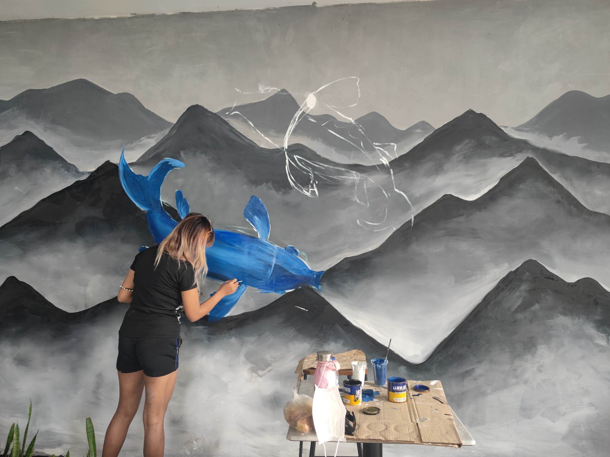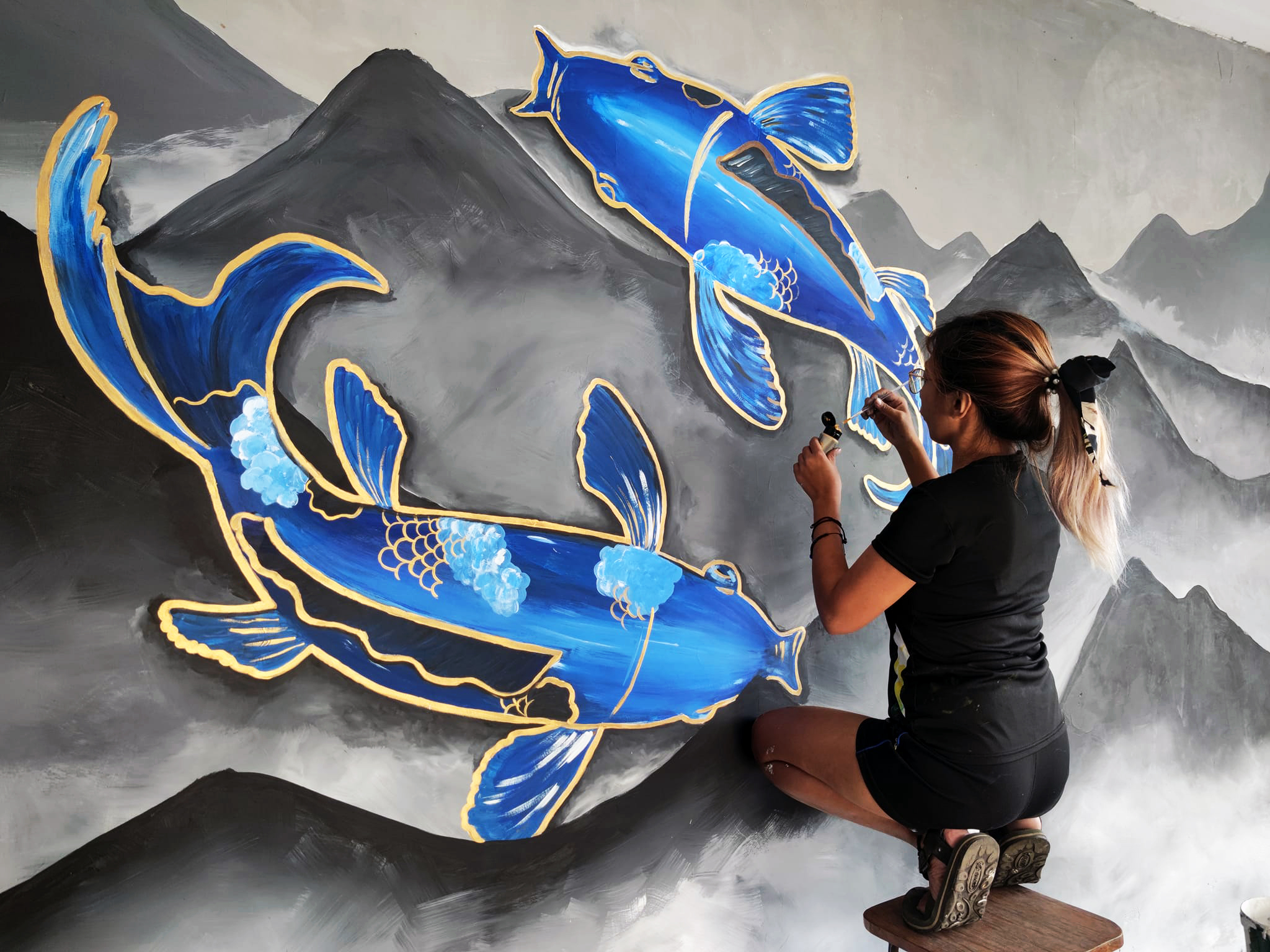 Adding the gold part is one of the most exciting parts! It means that the mural is almost done! When it was applied, we can see how delicate it was. The gold acrylic act as the accent color aside from blue. And adding shadow under the fish made them look floating or swimming. The shadow also created an embossed illusion.