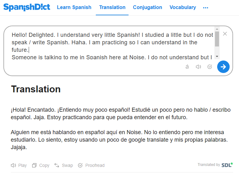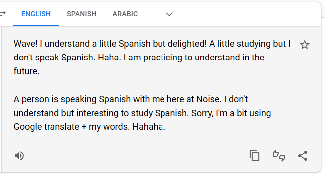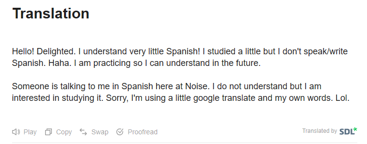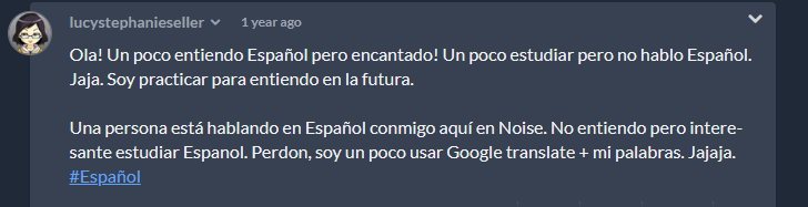 Alguien está hablando conmigo en español aquí en Noise. No entiendo pero me interesa estudiarlo. Perdon, estoy usar un poco google translate y mis propias palabras. Jajaja.