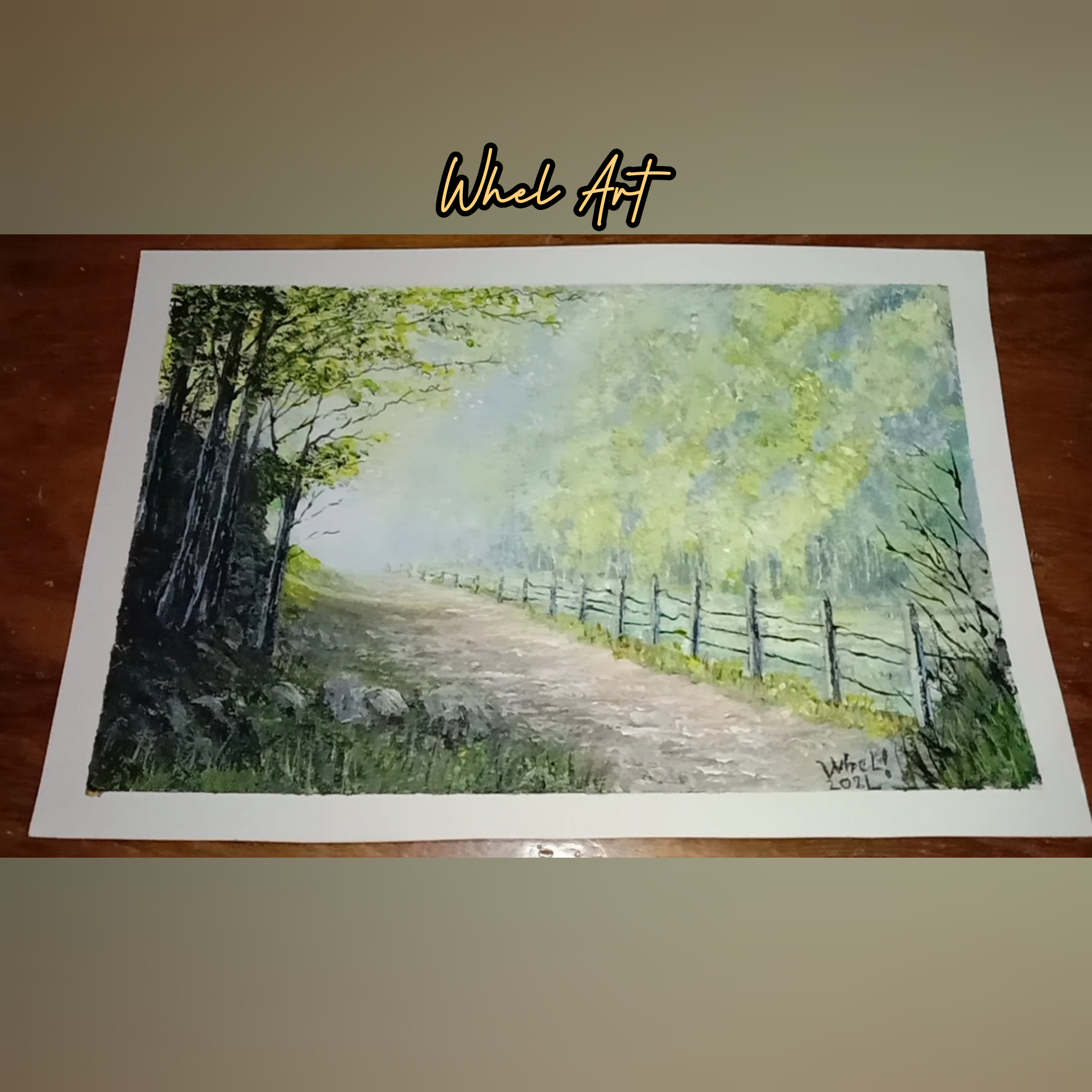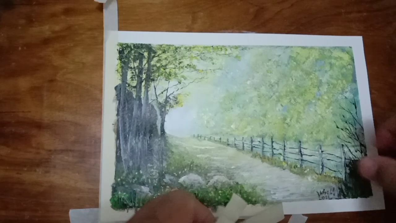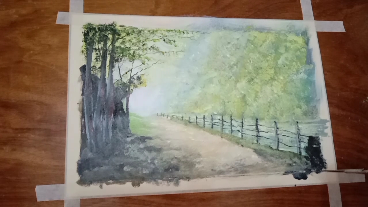Summer landscape painting is the representation of natural scenery art. The misty road is easy to create applying the 'wet on wet" technique by blending two colors, creating the softening edges and the layering a sense of depth. The mixture of paint attract and generates attention.