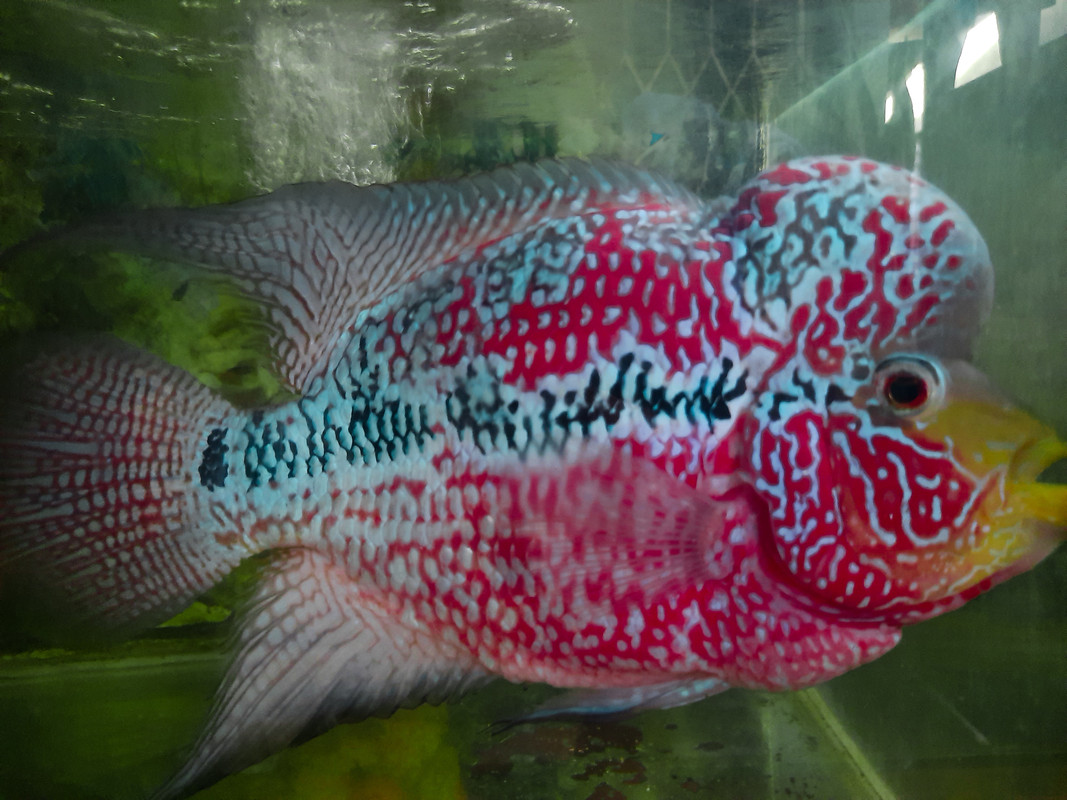 Our first two flowerhorn has a combination of red and black color. But Dinar has quite a unique color unlike the first ones who only has two combination color. Dinar has 2 more other colors, yellow and some kind of cyan I think.