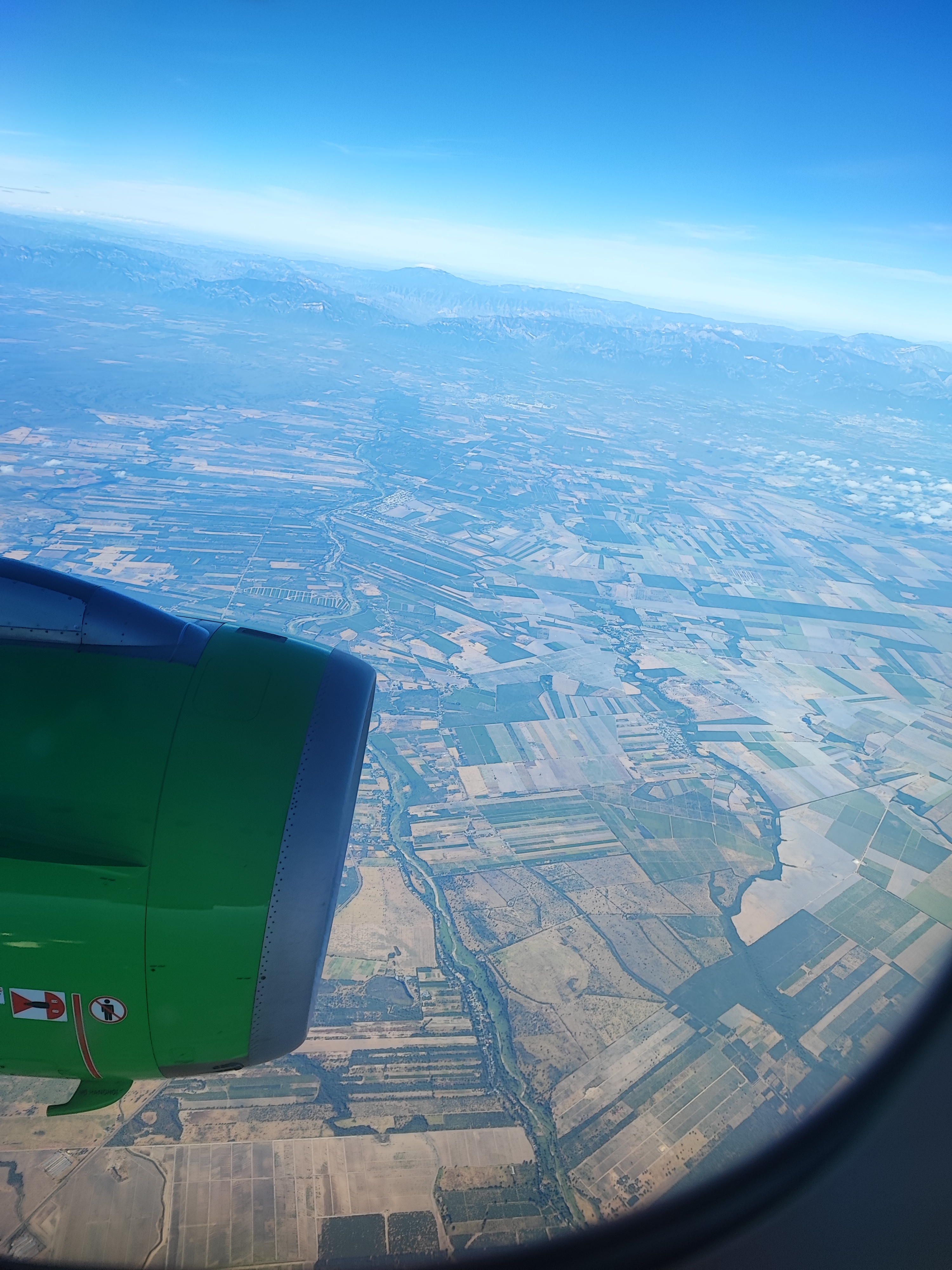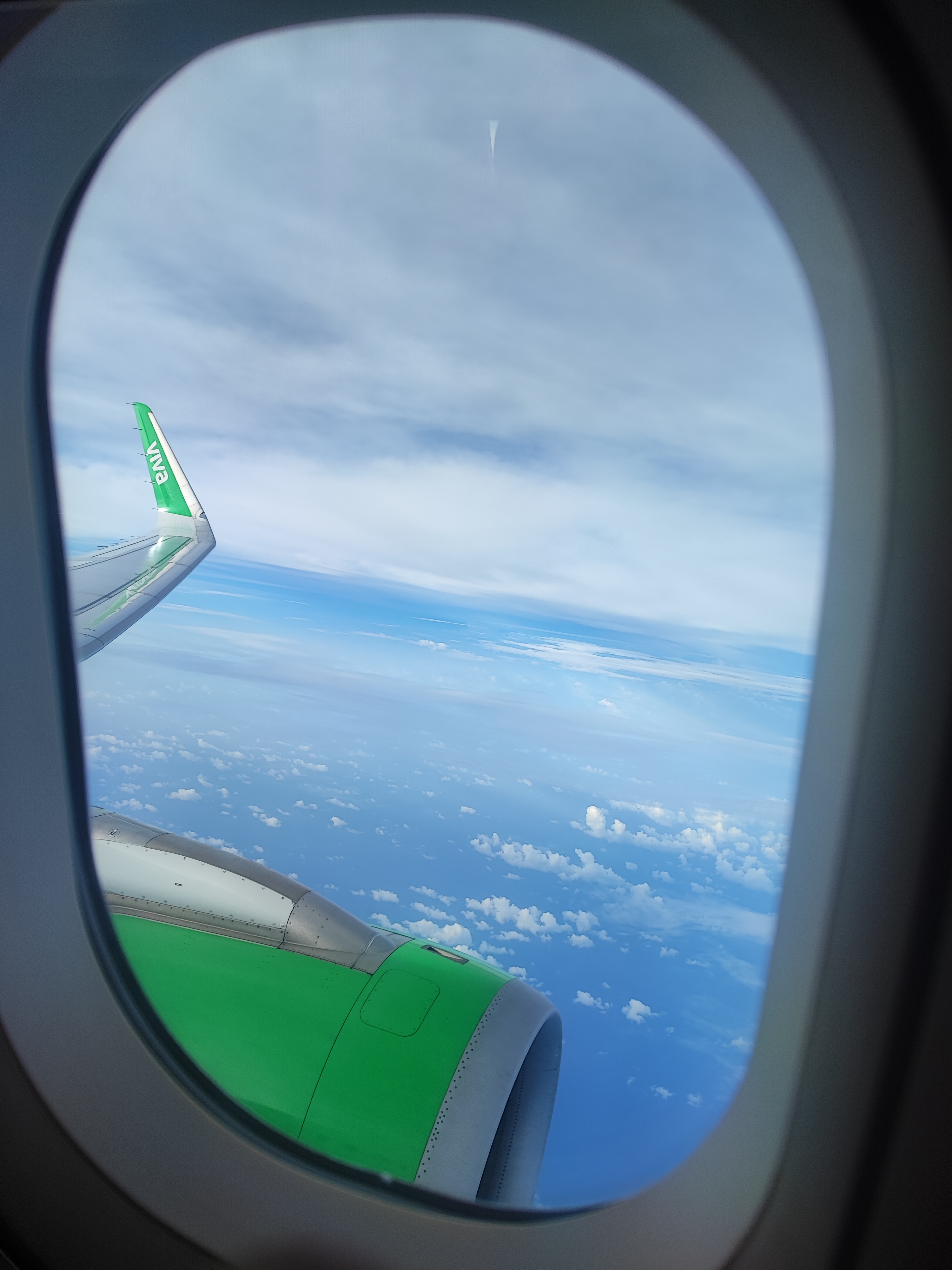 Cuando estás en los cielos las nubes parecen irreales, todas las avenidas y casas se ven de manera miniatura. Estuve leyendo en todo el vuelo sobre el libro "El Patrón de Bitcoin" y también iba pegado a la ventanilla tomando fotografías.