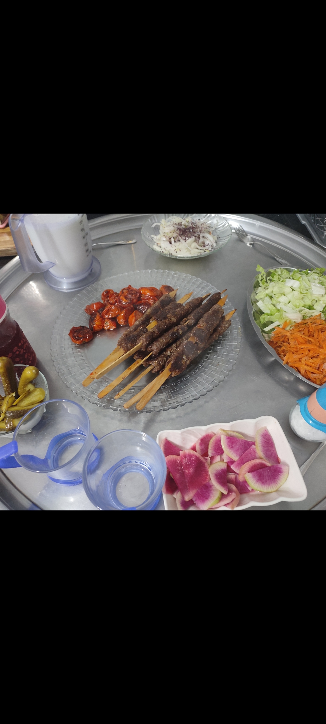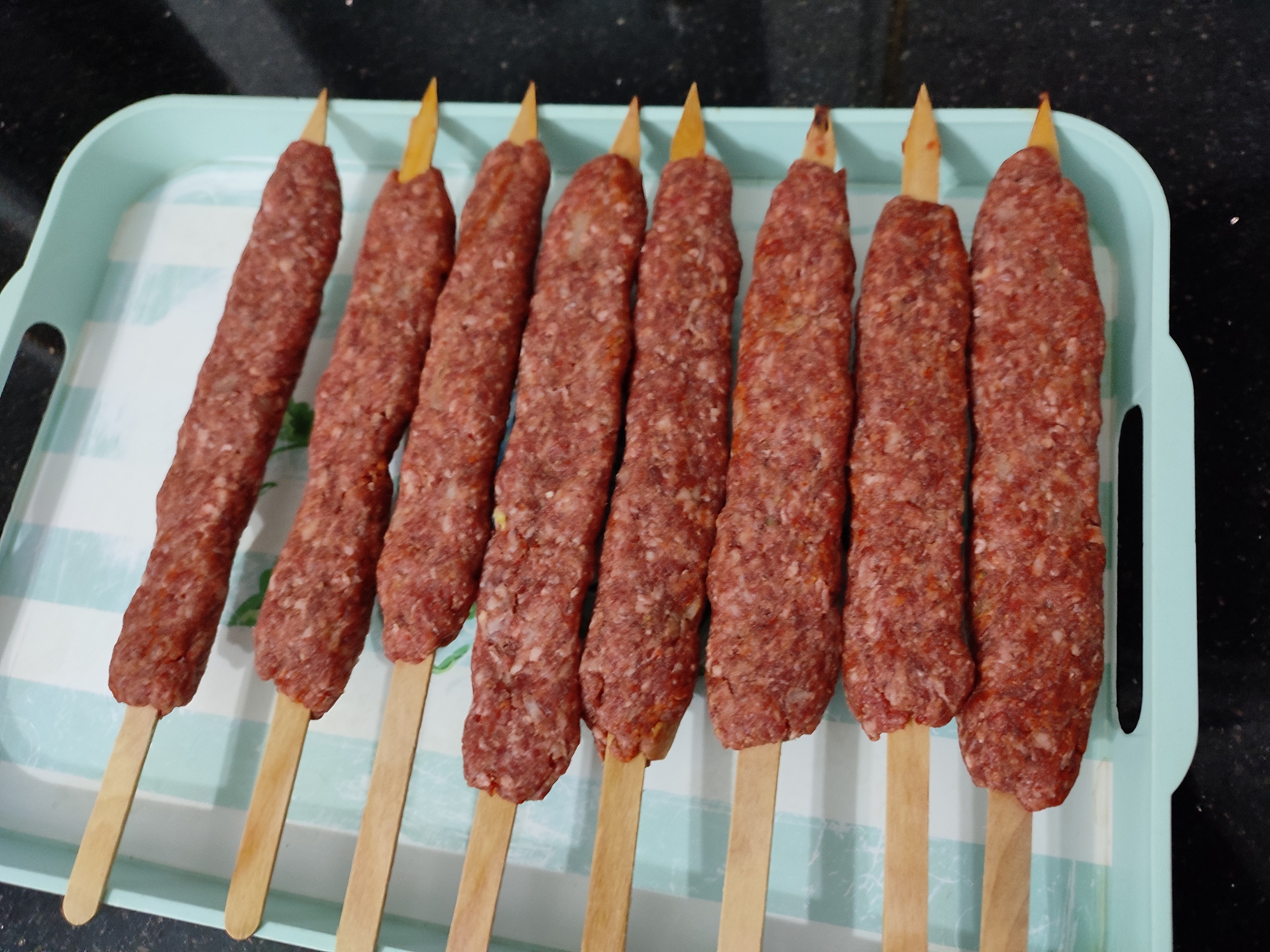 Akşam yemeği içinde evde adana kebap yapmak istedim.Kiymayi baharatlarla yoğurdum dolapta biraz dinlendirdikten sonra şekil verdim .