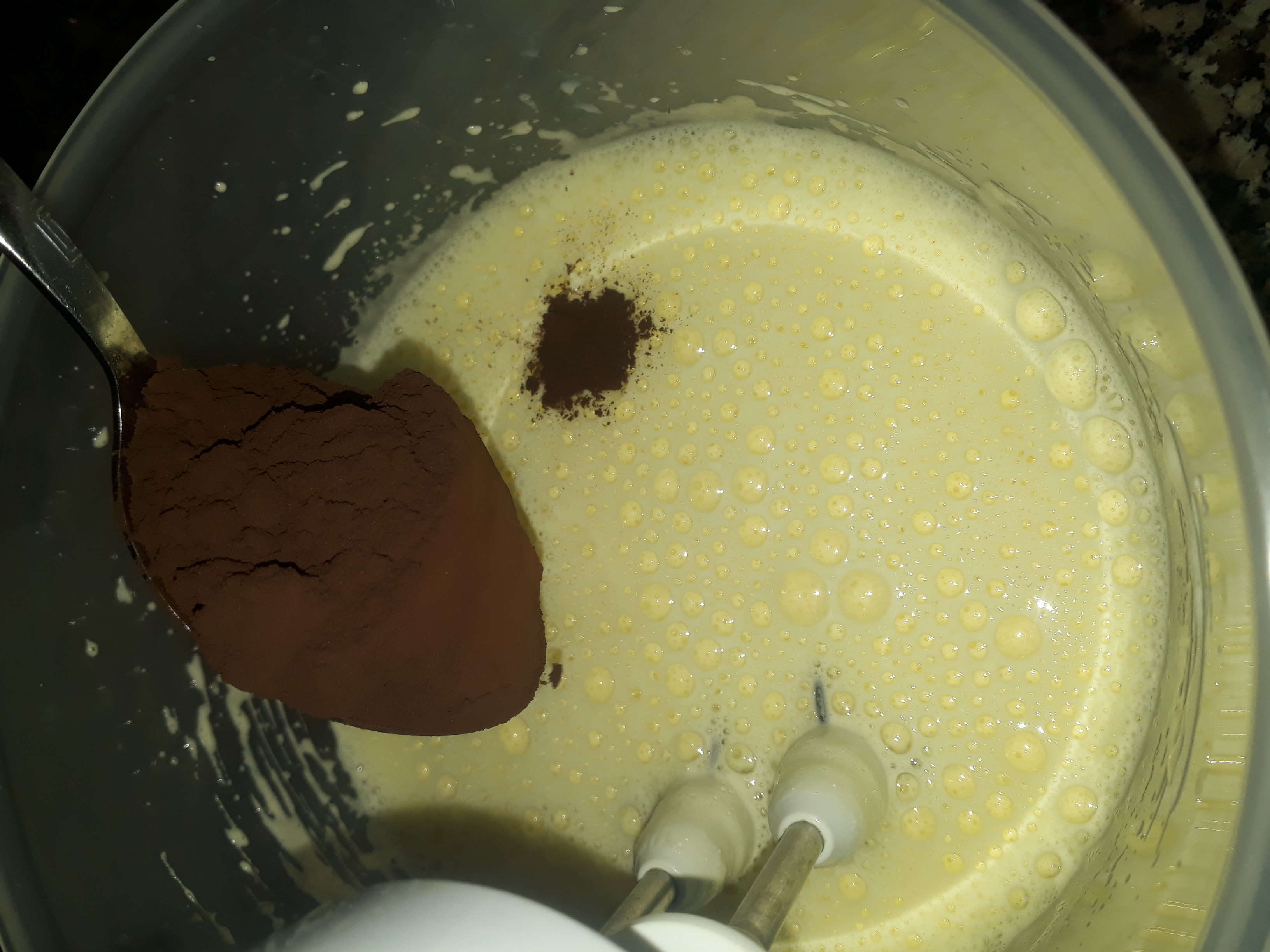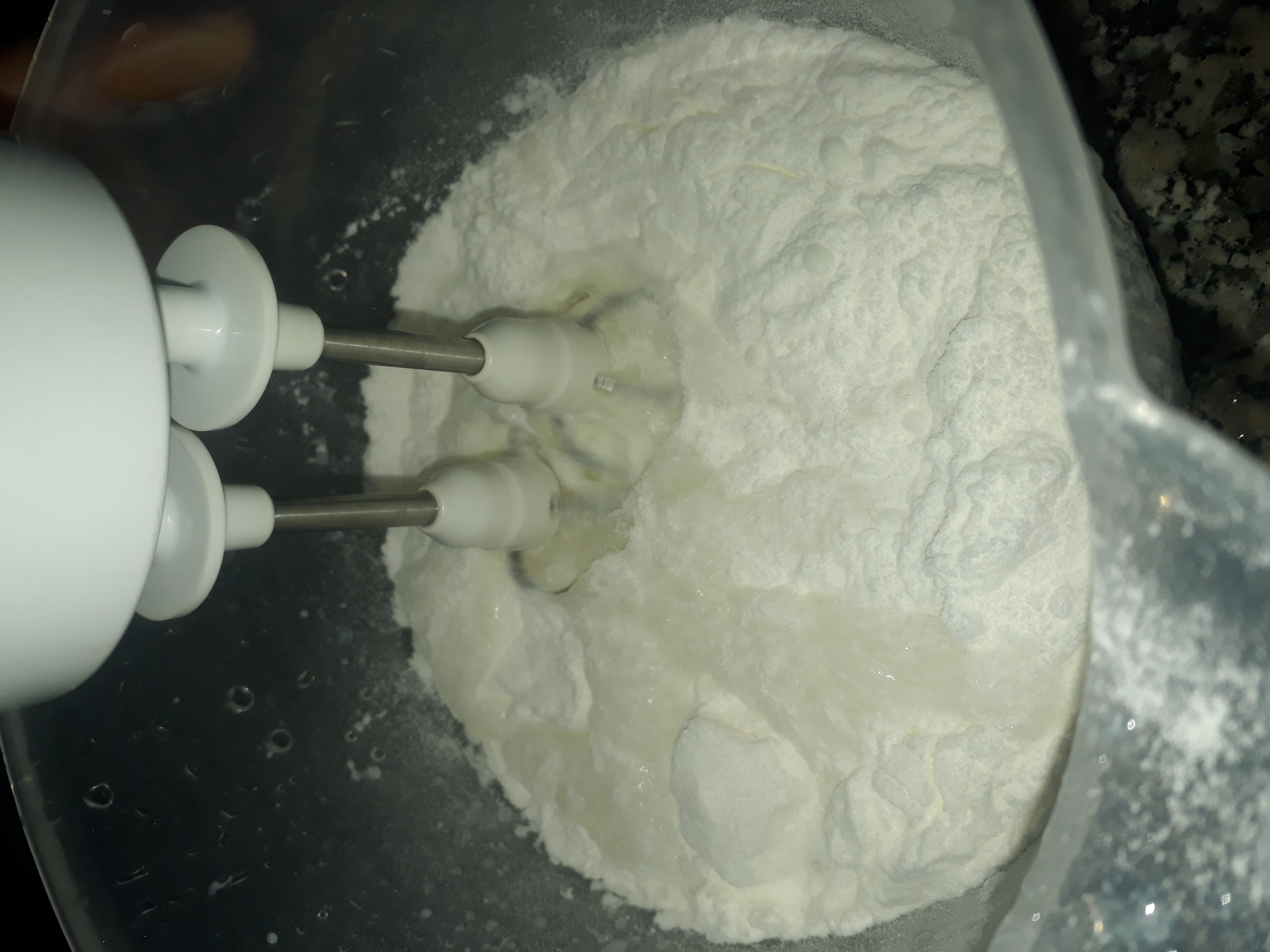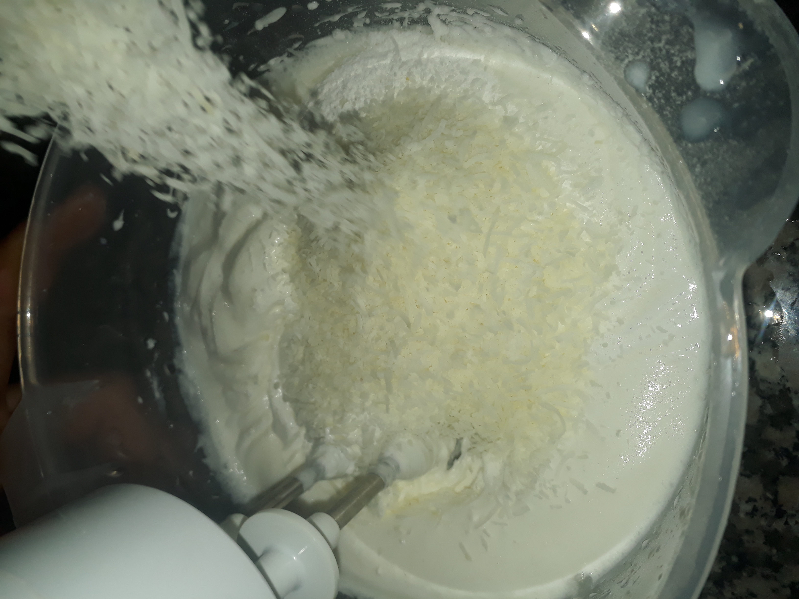 Krem santiyi iyice cirptiktan sonra hindistan cevizi ve pudra şekerini ilave edip cirpmaya devam ediyoruz