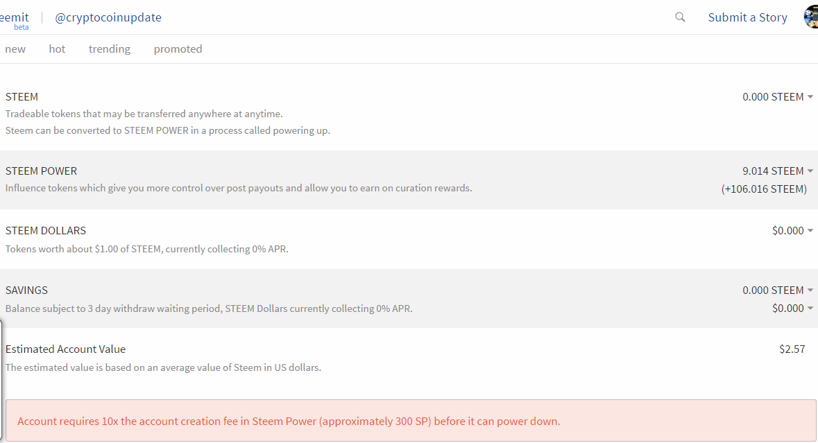 seriously sorry for being greedy but i started po0wering it down, haha but honestly i wont be able to get that $2 out of the account anytime soon so whoever takes this account will get to keep the $2 in steempower! Actually there should be 100 more steem power but its in parenthysis