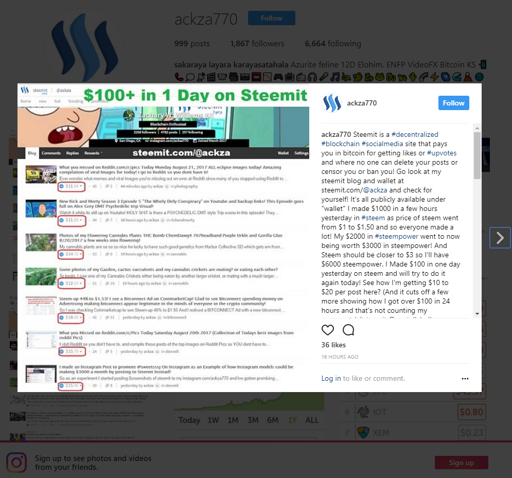 So My Steemit Advertising campaign on my Instagram Facebook twitter and Tumblr is going very well! I just got 36 likes on a ost showing how I made over $100 in one day on steemit! Here is the screenshot of the Instagram post I made which itself was a screenshot of my own steemit blog wall with dollar amounts earned on each post highlighted! http://www.instagram.com/ackza770