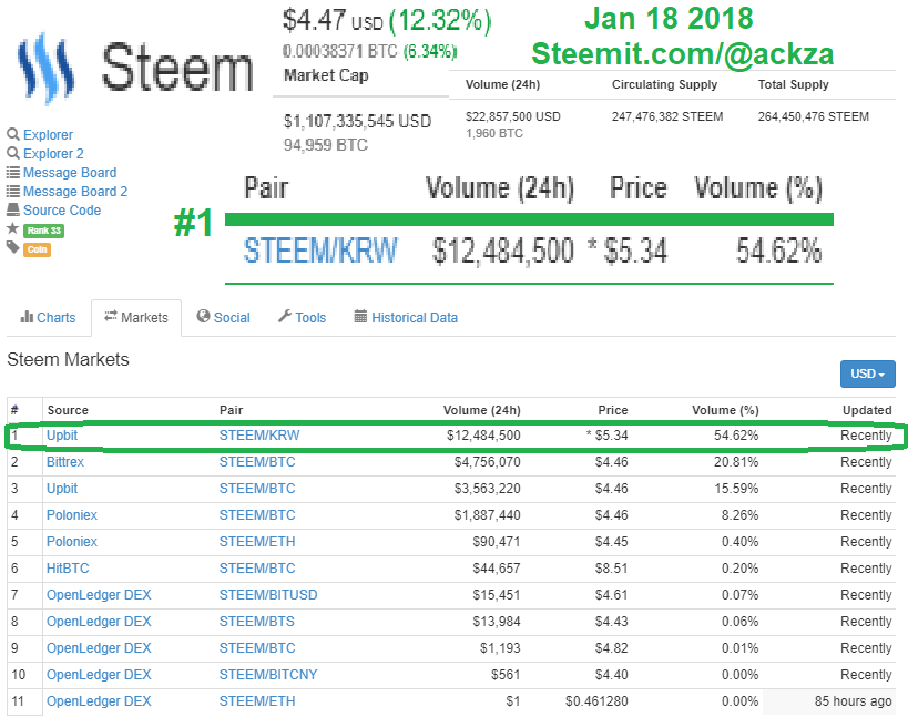 And heres the coinmarketcap market stats showing korean exchange upbit having over 50% of all steem!