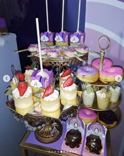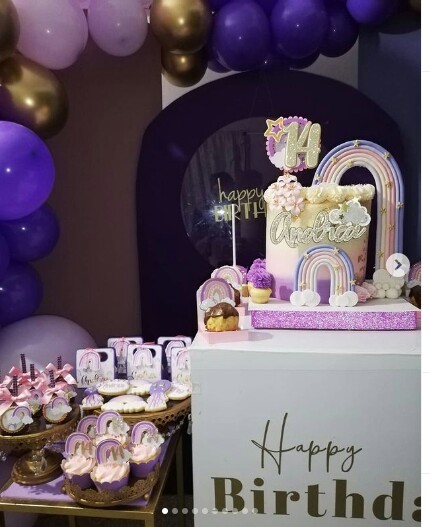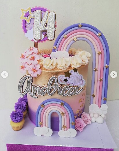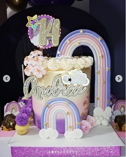 Un hermosa temática de arcoiris en tonalidades lila, violeta y rosa.. Enamorada de los resultados para celebrar los 14 años#andrea