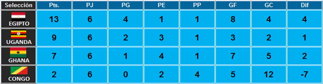 Egipto terminó con el liderato del grupo E de la CAF (Confederación Africana de Fútbol), donde compartieron fase de clasificación con Uganda, Ghana y Congo.