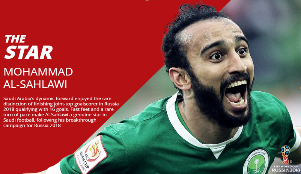 Su Principal Figura es; El delantero Mohammed Al-Sahlawi es la gran figura de la selección saudita. Llega a la Copa del Mundo con la madurez que otorga los 30 años de edad y con el aval de ser el máximo anotador de la zona asiática con 16 dianas. Es el delantero titular del Al-Nassr saudita, donde juega desde 2009.