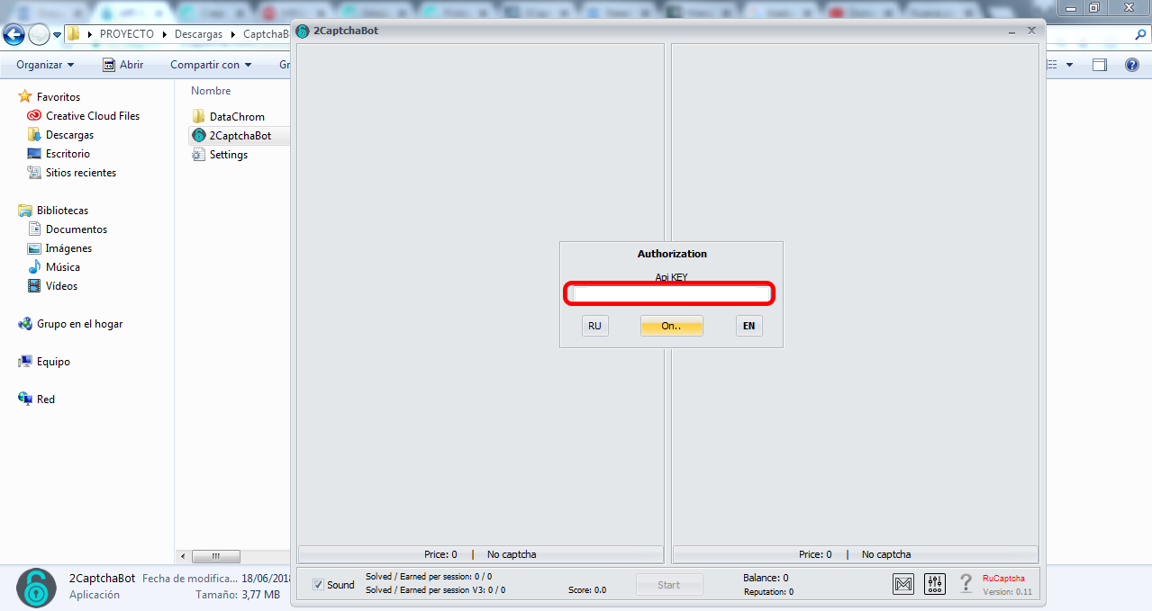 Fuente Once the program is open, enter the captcha KEY that you copied at the beginning and click "On".