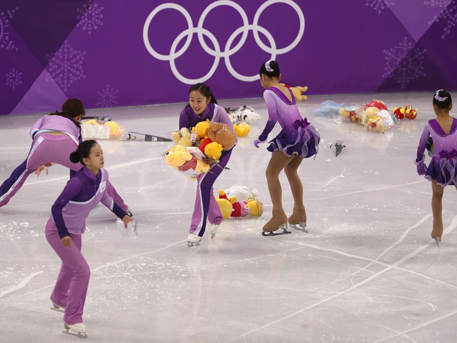 Young assistants collected the bears from the rink after Hanyu's record-breaking performance and some had their arms so full the toys spilled out.
