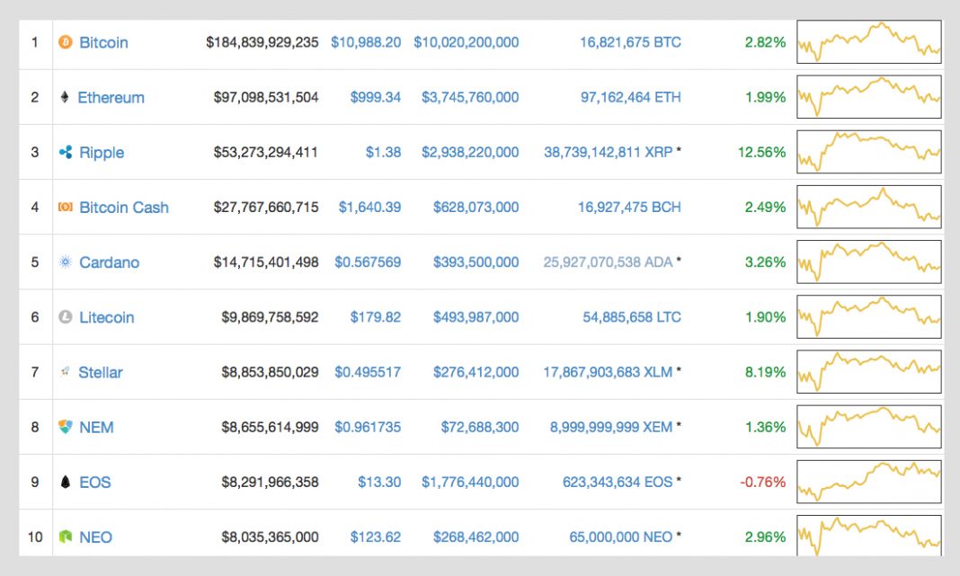 Overall most of the top cryptocurrencies are in the green right now in contrast to yesterday’s performance. Out of the top five, the second largest market capitalization is held by ethereum (ETH), which is up 1.99 percent with an average price at $999 per ETH. Ripple (XRP) prices are up 12 percent as one XRP is trading at $1.38. Lastly, the fifth position is still held by cardano (ADA), as markets are up 3 percent which places ADA prices around $0.56 per token.
