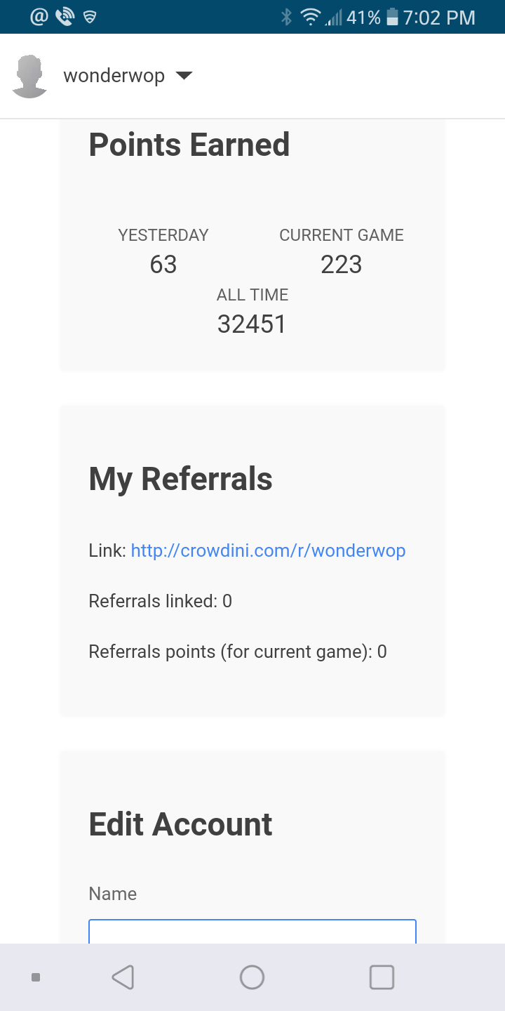 I owe my SteemIt journey to Jason from @crowdini. I have a link to @crowdini on every one of my posts, if my fellow Steemians use it, I get 5 extra points on this week's game.