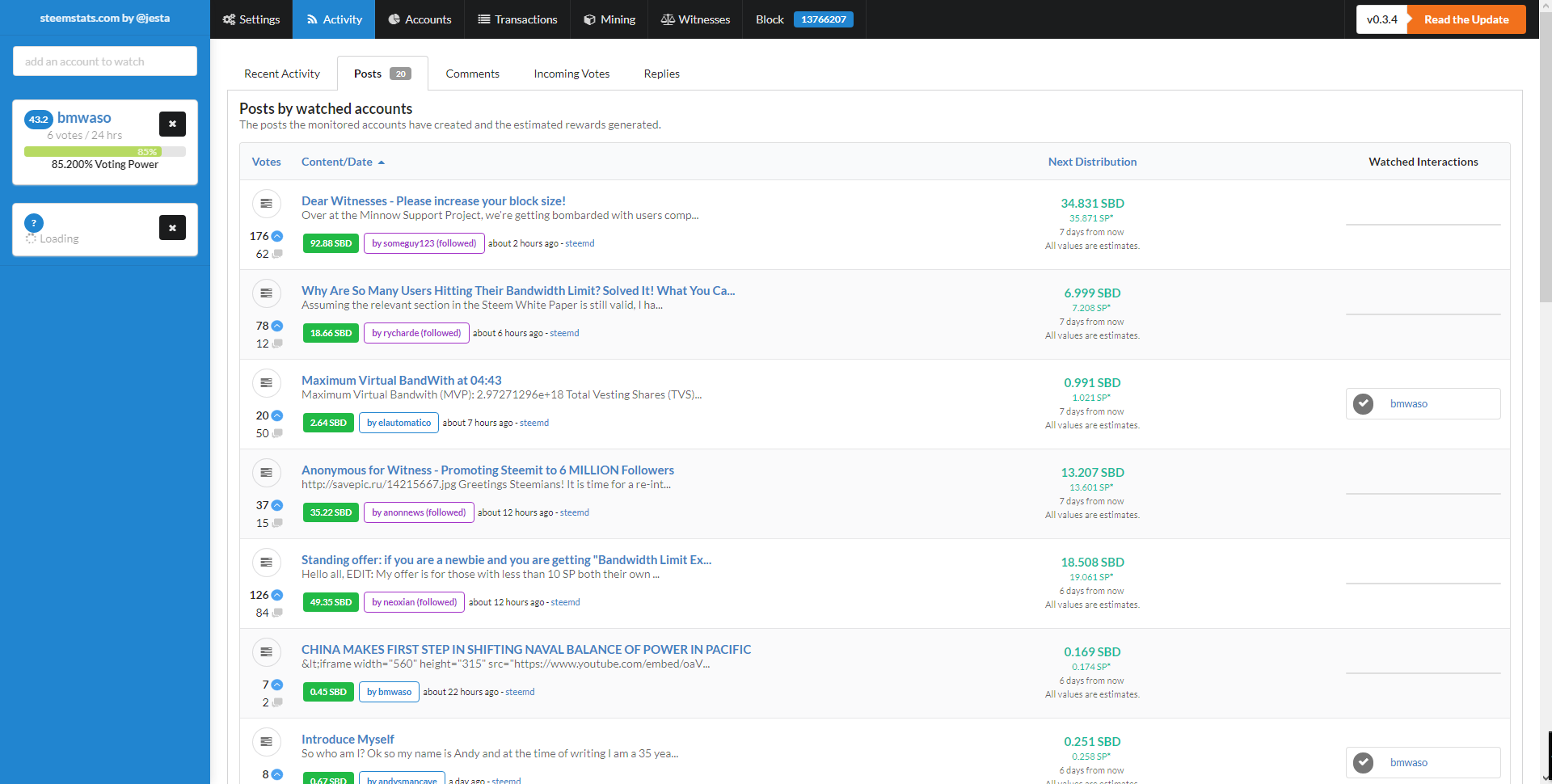 One of the most complete tools for steemit I have found so far, steemstats.com created by @jesta is a live dashboard for observing account activity - yours or anyone elses. There is no need to login, you simply enter the name of account(s)you wish to watch. Each account has a brief history loaded and is then monitored by your browser for future changes. This amazing tool has the most complete variety of stats for steemit I have seen!