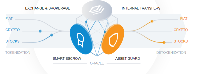 based on EOS technology, and supports three types of assets: crypto, fiat, and stock.