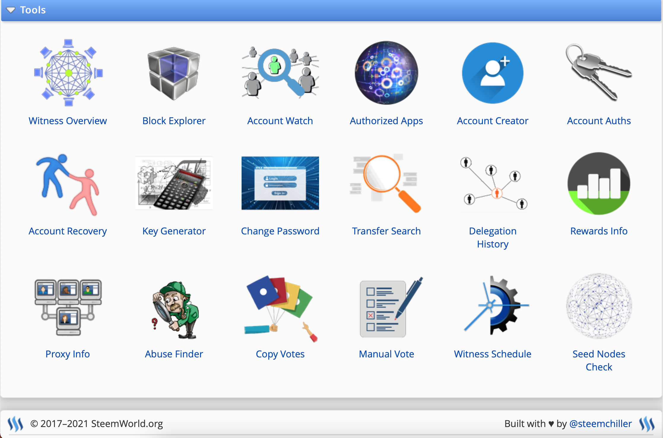 My favorites are Account Watch - a sortable listing of top Steem Power accounts. Authorized Apps - a record of apps approved to act on your behalf. (Some apps I no longer used and had forgotten about.) Delegation History - a tool to examine delegation data between users. And Manual Vote - a mechanism that allows you to vote just like your favorite Steemian.