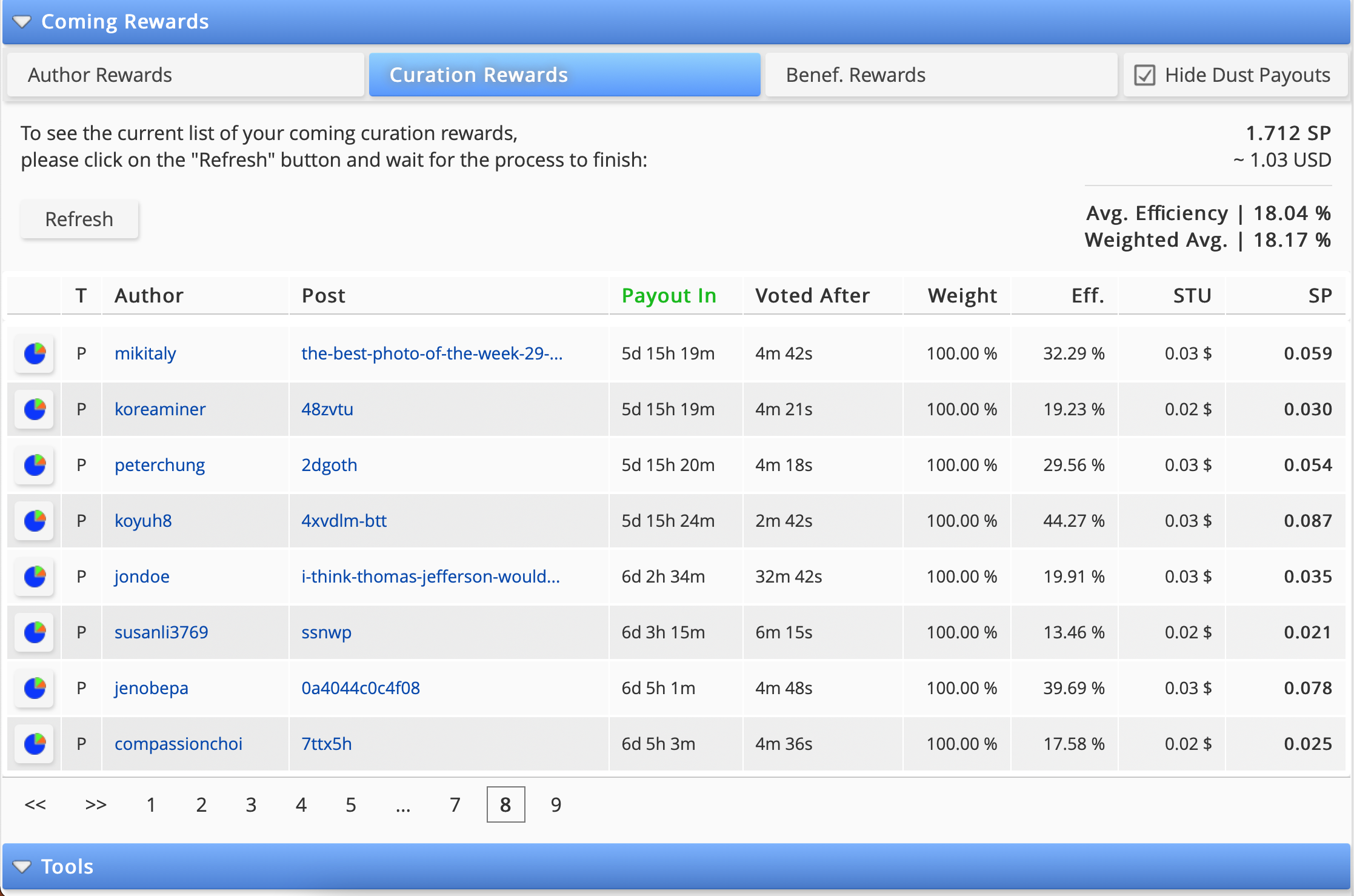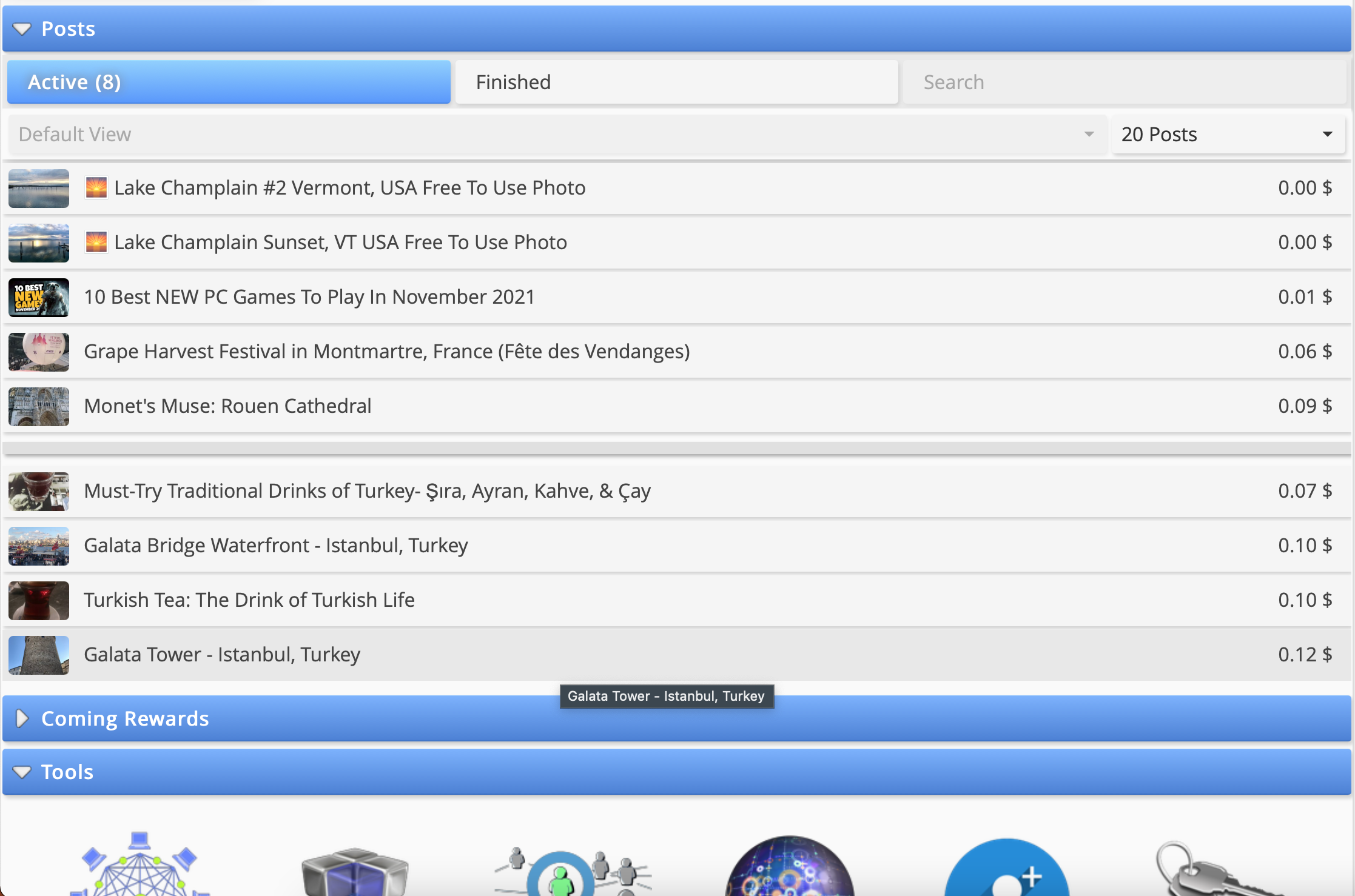 The Posts section displays all of your recent posts and their expected rewards. Since it refreshes at whatever interval you choose in the settings, there's no need for constant page renews to see new activity.