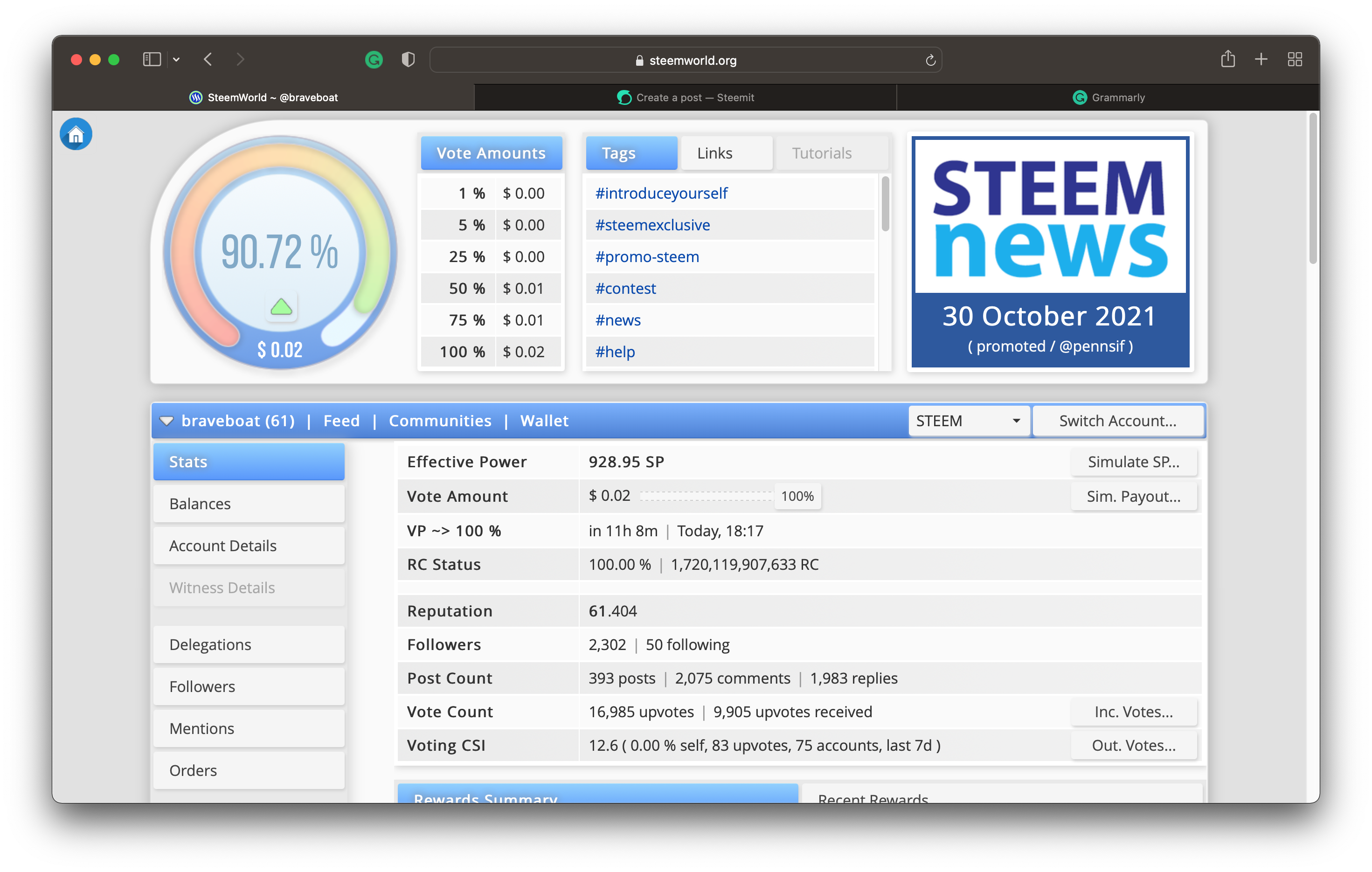 Check your stats: check on your voting power, the value of your votes, RC status, and the number of your follows and followers. You can even see the total number of posts, comments, and replies received on your account since your first day on Steemit.
