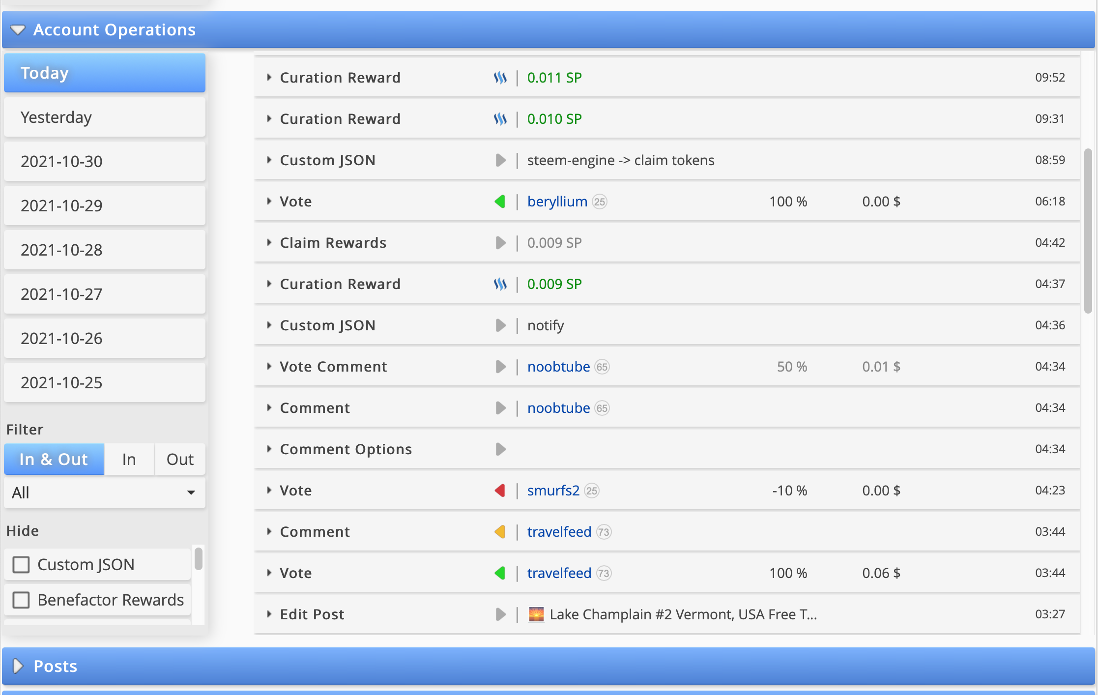 In the next section, Account Operations, all of the transactions on your account are displayed for simple review. Upvotes and comments, both incoming and outgoing, are all shown for simple review. So, too, are all other account operations. Also, you can easily filter any activities you are not interested in seeing from your display, like comments or JSON notifications.