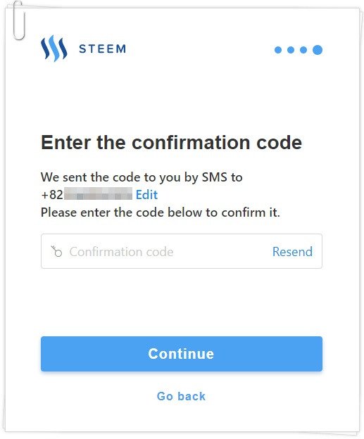 5. 4번에서 입력한 전화번호로 확인코드가 전송이 됩니다. 그것을 확인해서 'Confirmation code' 입력란에 5자리 숫자를 입력하시면 됩니다.