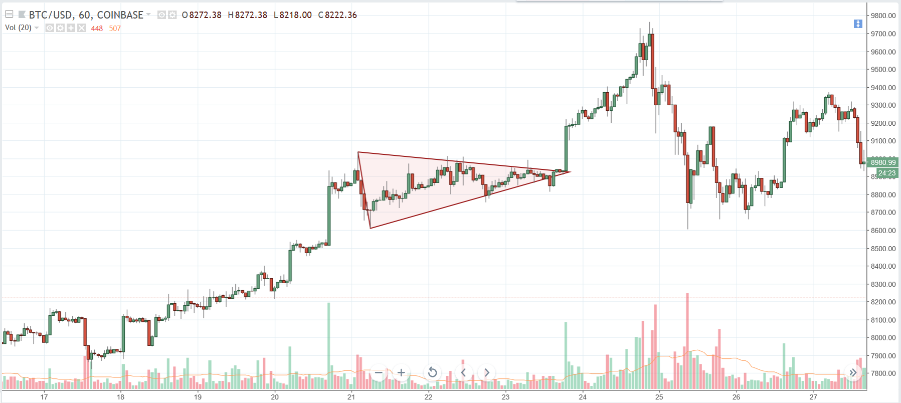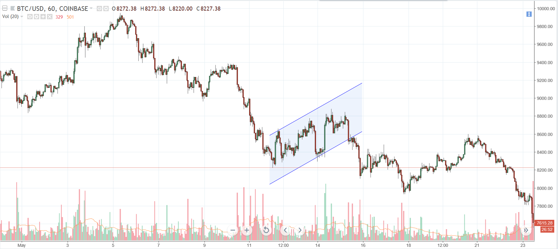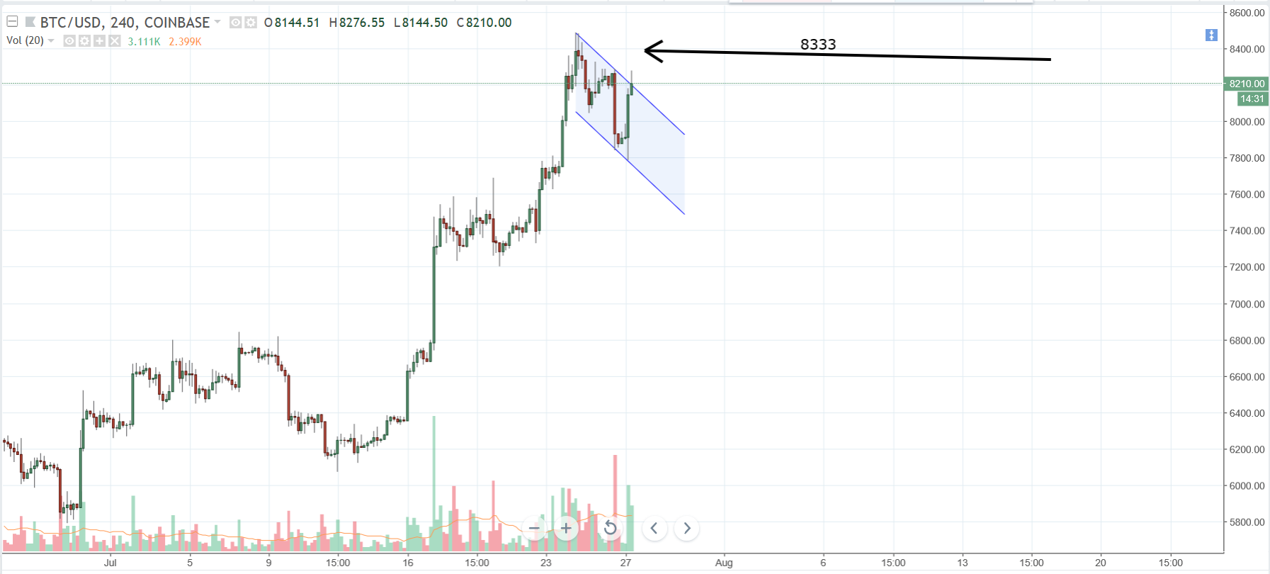 We have a clear (albeit, very steep sloped) flag pattern formed on Bitcoin. There has been some clear selling pressure lately due to both extended technicals and negative news, but the structure remains and we have caught some supportive buying. An entry resting buy order at the 8333 level allows enough room for a confirmation of the breakout as well as an early enough entry to make some profit.