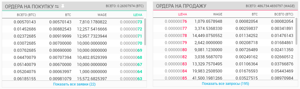Далее всё ограничено вашей жадностью и балансом. Если вы хотите купить токены дешевле текущей цены, то выставляйте ордера на покупку ниже текущей стоимости. Если же вам нужны токены WAGE прямо сейчас, то покупайте их по текущей маркет цене.