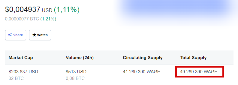 По моим наблюдениям, стоимость WAGE токена последний месяц в среднем составляет 0,00000080 BTC. В принципе это очень неплохая цена для такого проекта. К тому же всего на рынке существует 49 288 790 WAGE токенов.