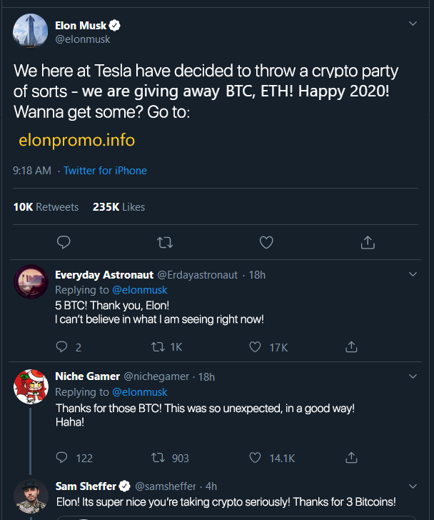 Why wouldn't Elon Musk just give you the free crypto for doing some other menial task, like picking a random comment off his tweets? Why would he ASK for you to send crypto first? It doesn't make sense, any time something seems to be good true, it usually is!