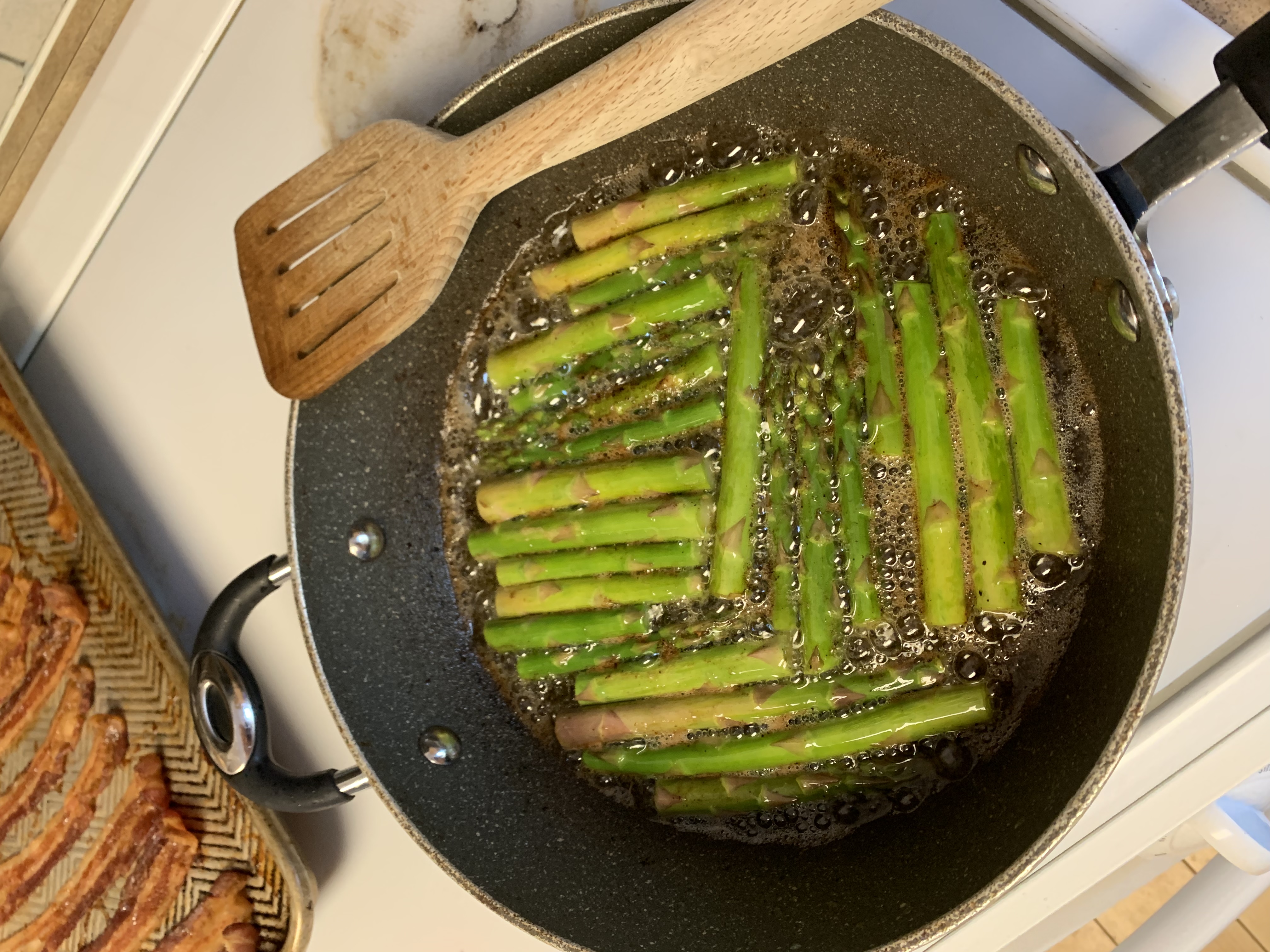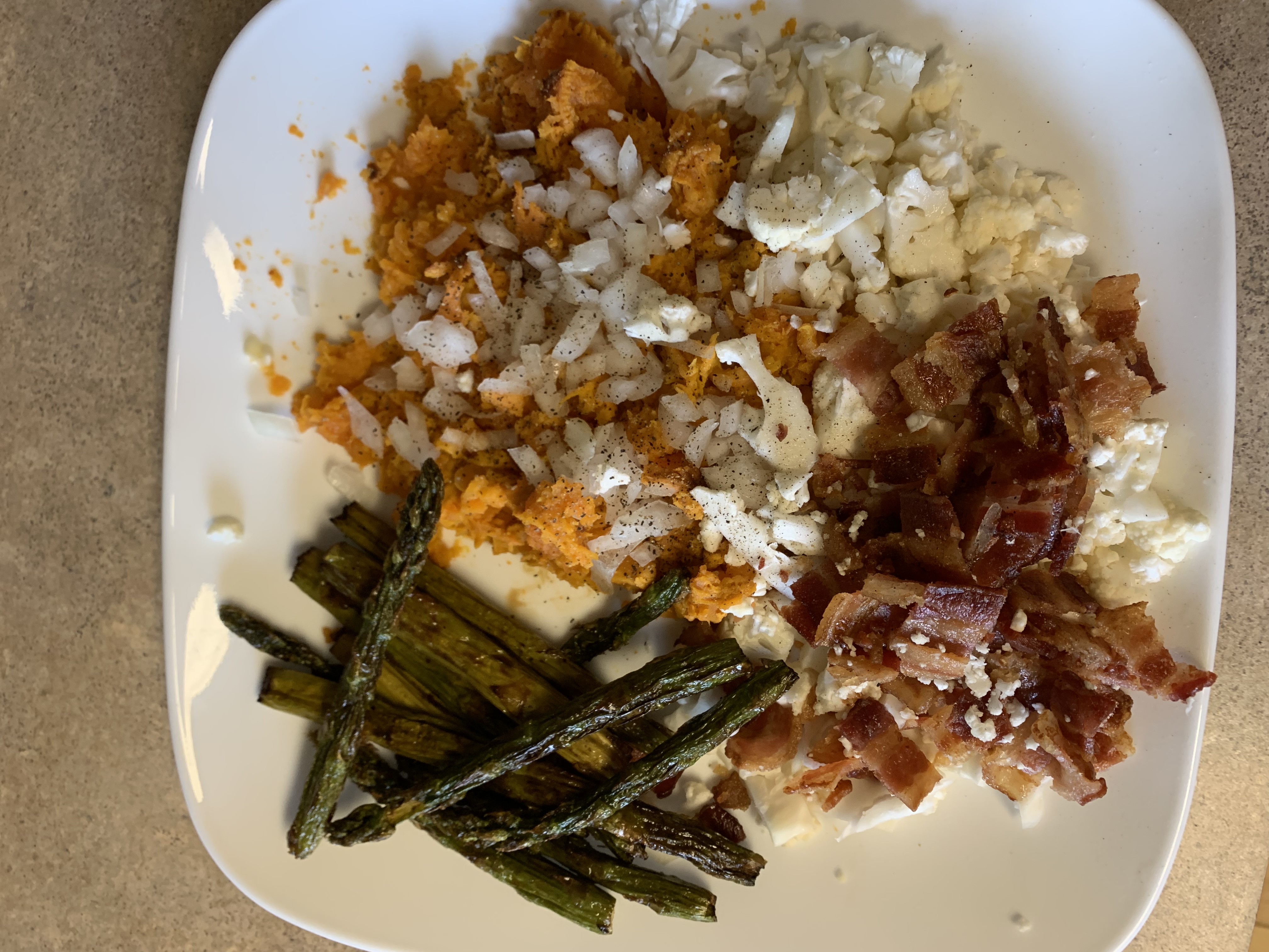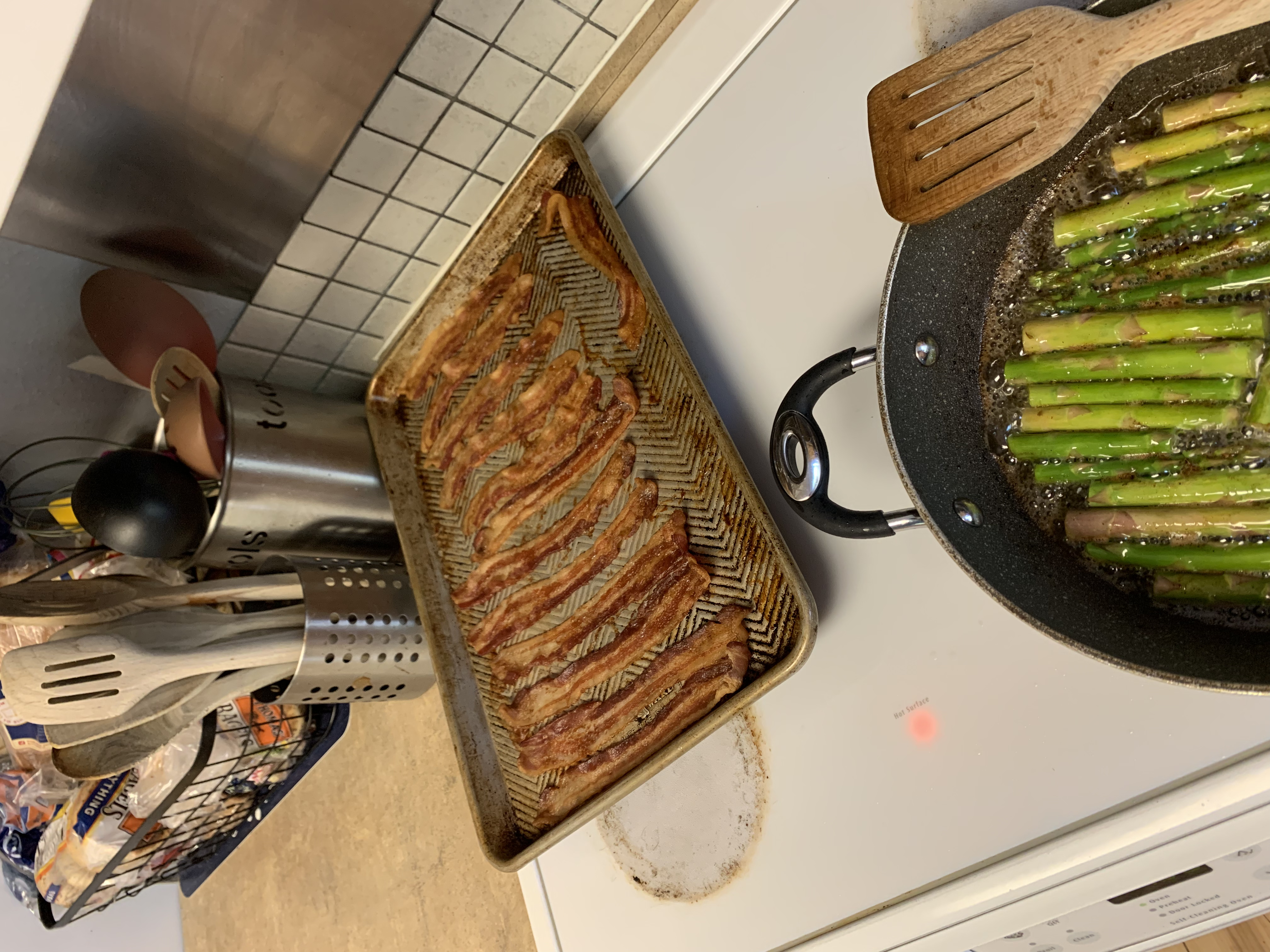 Who ever told you eating good real food was hard to do wasn’t giving you enough ideas 😁. Here I baked bacon 🥓 in the oven then used the grease to fry the asparagus. Yams 🍠 baked in the oven with the bacon but took twice as long to finish.
