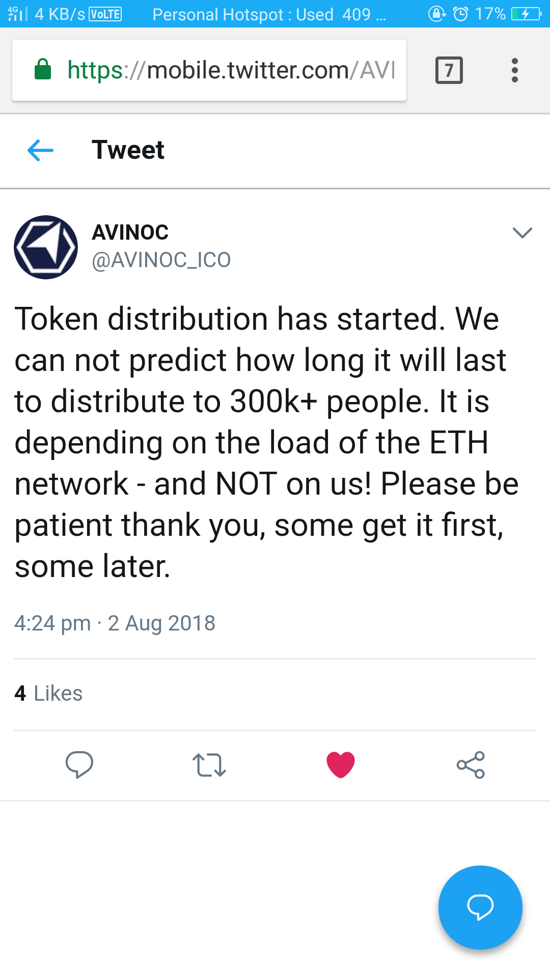 YES AVINOC TOKEN Distribution has been started. you can see official site give massage in twitter as shown screen short given below. so many members get 250+ dollars. and got the 366$ of free tokens of AVINOC air drop. and it will send automatically to our ETH wallet. But some body ha not get the tokens or dollars to there wallet. because so many members are use there exchange wallet. the exchange wallet not support to AVINOC as been no support to that wallet. how many members are added there exchange wallet first change there wallet address because they cancel there account. or reject there payments.